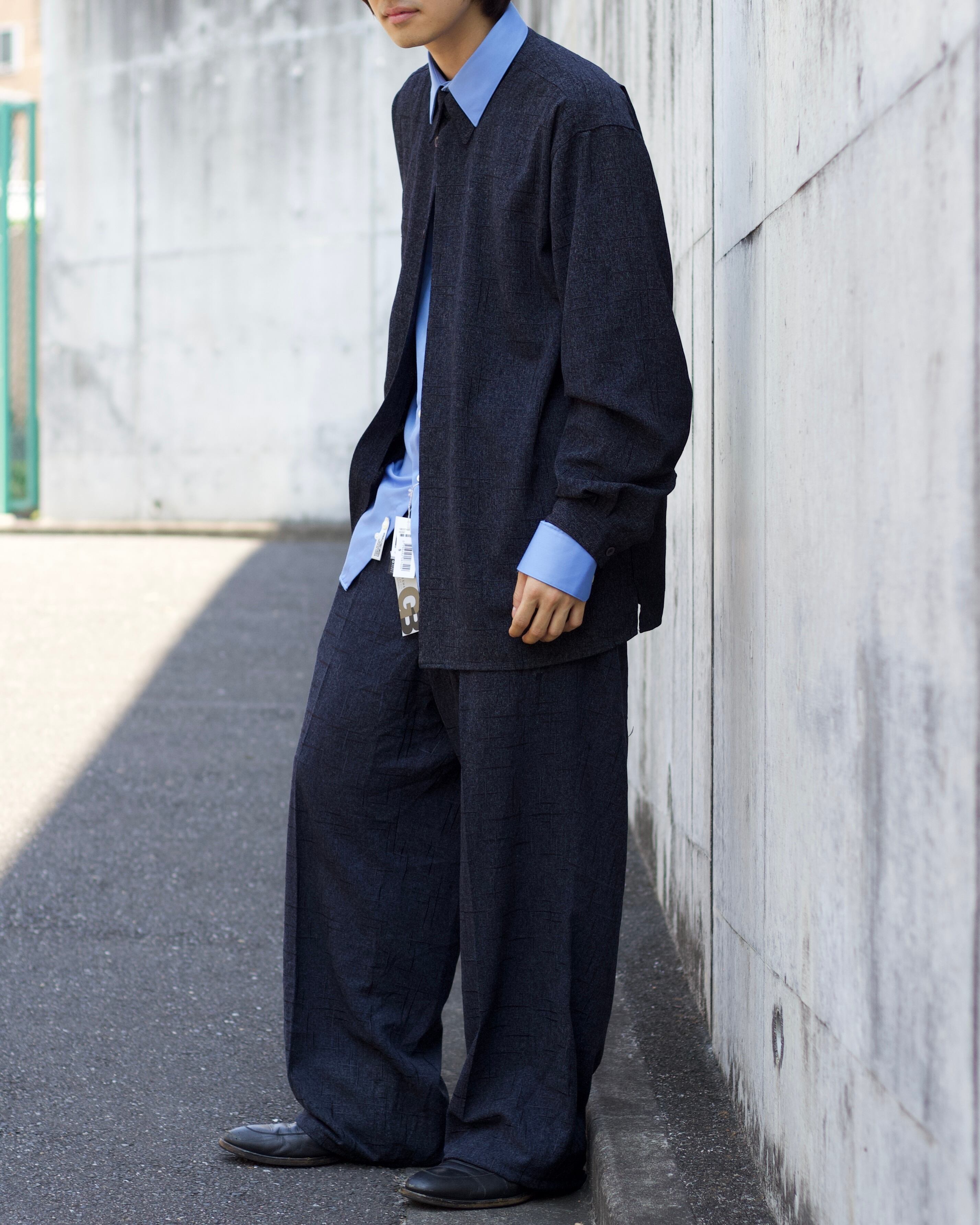 テーパードが少しだけ効いていますが、2タック入っていることで、ワイドになりテーパードが気にならないのでストレートに見えます。