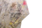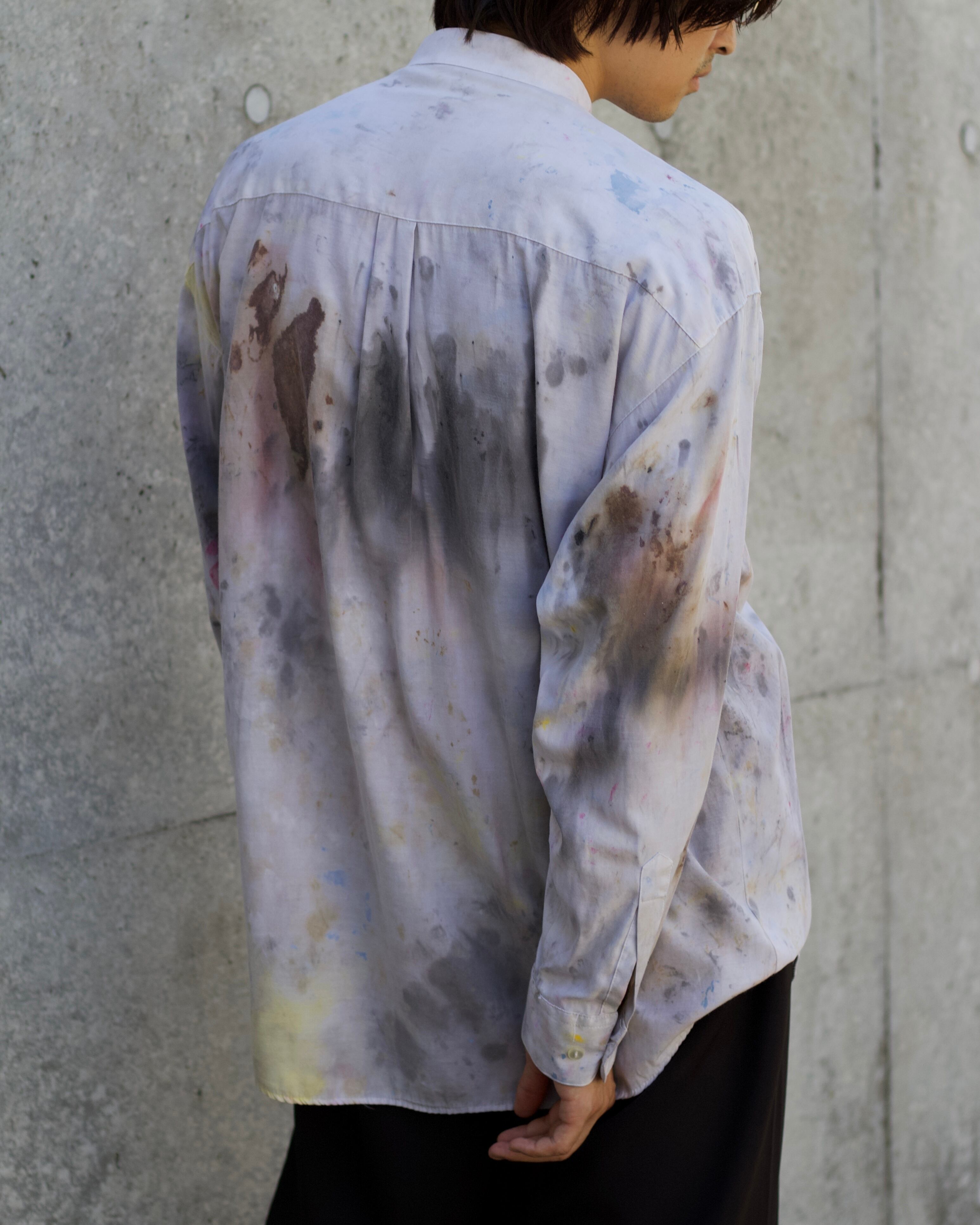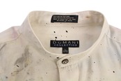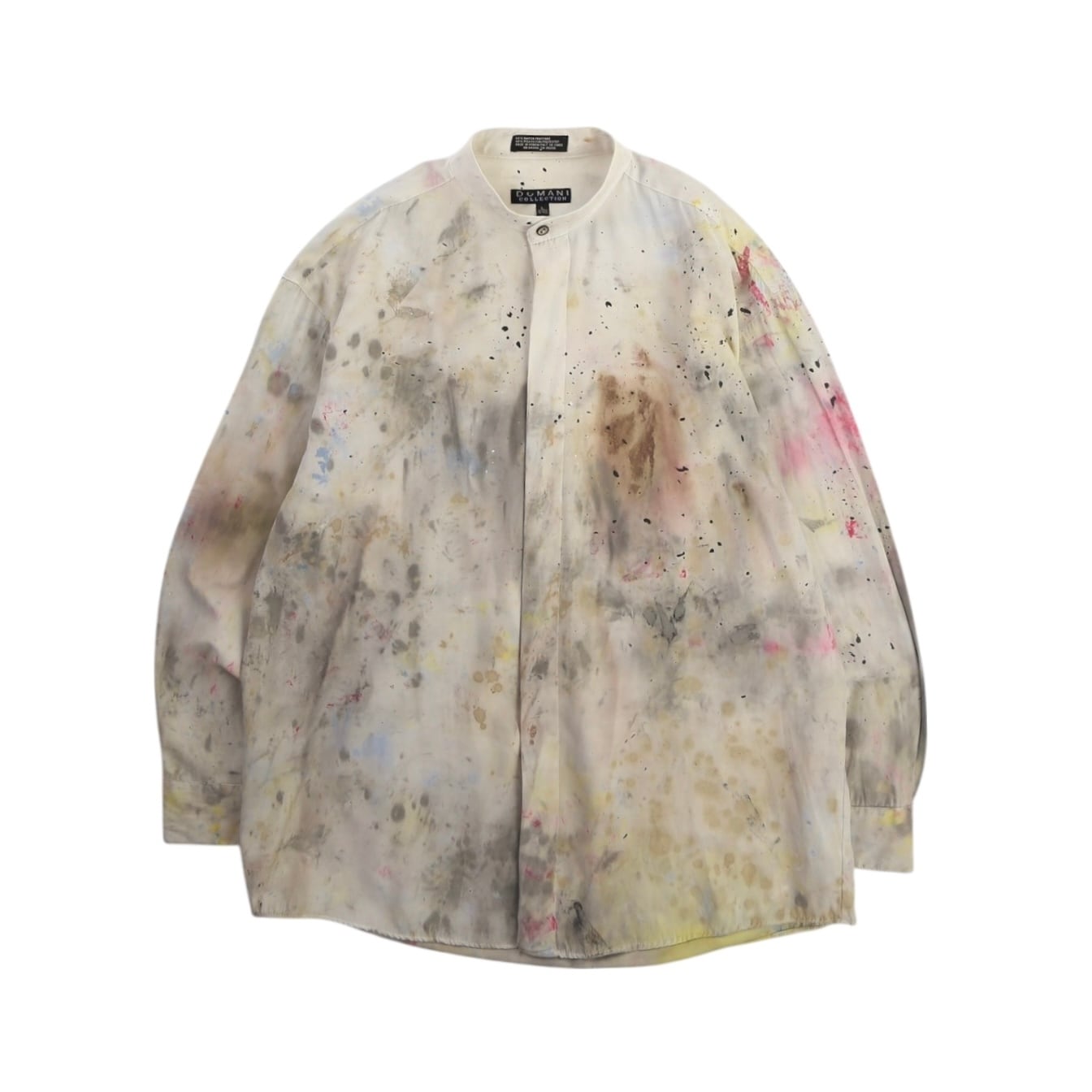 バンドカラーの綺麗な品のあるシャツで、生成りのカラーリングにマルチカラーのペンキ飛び。