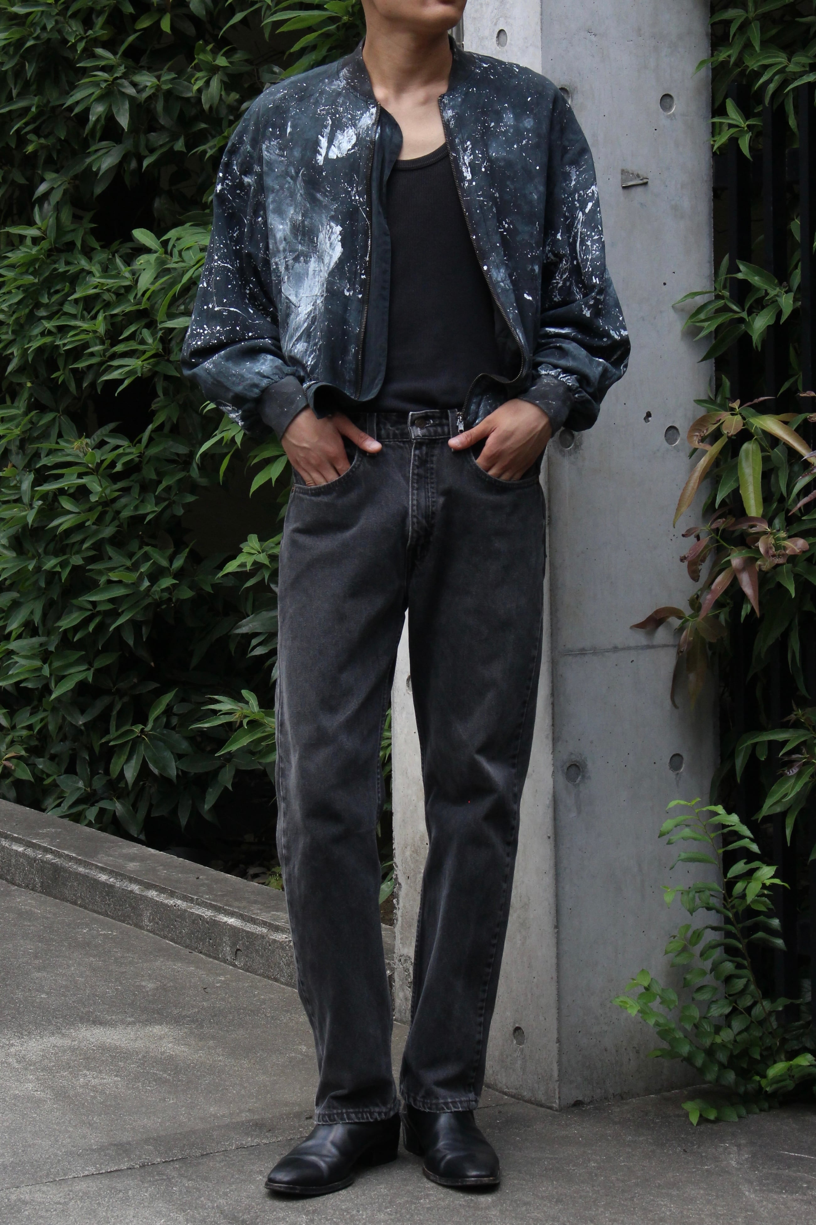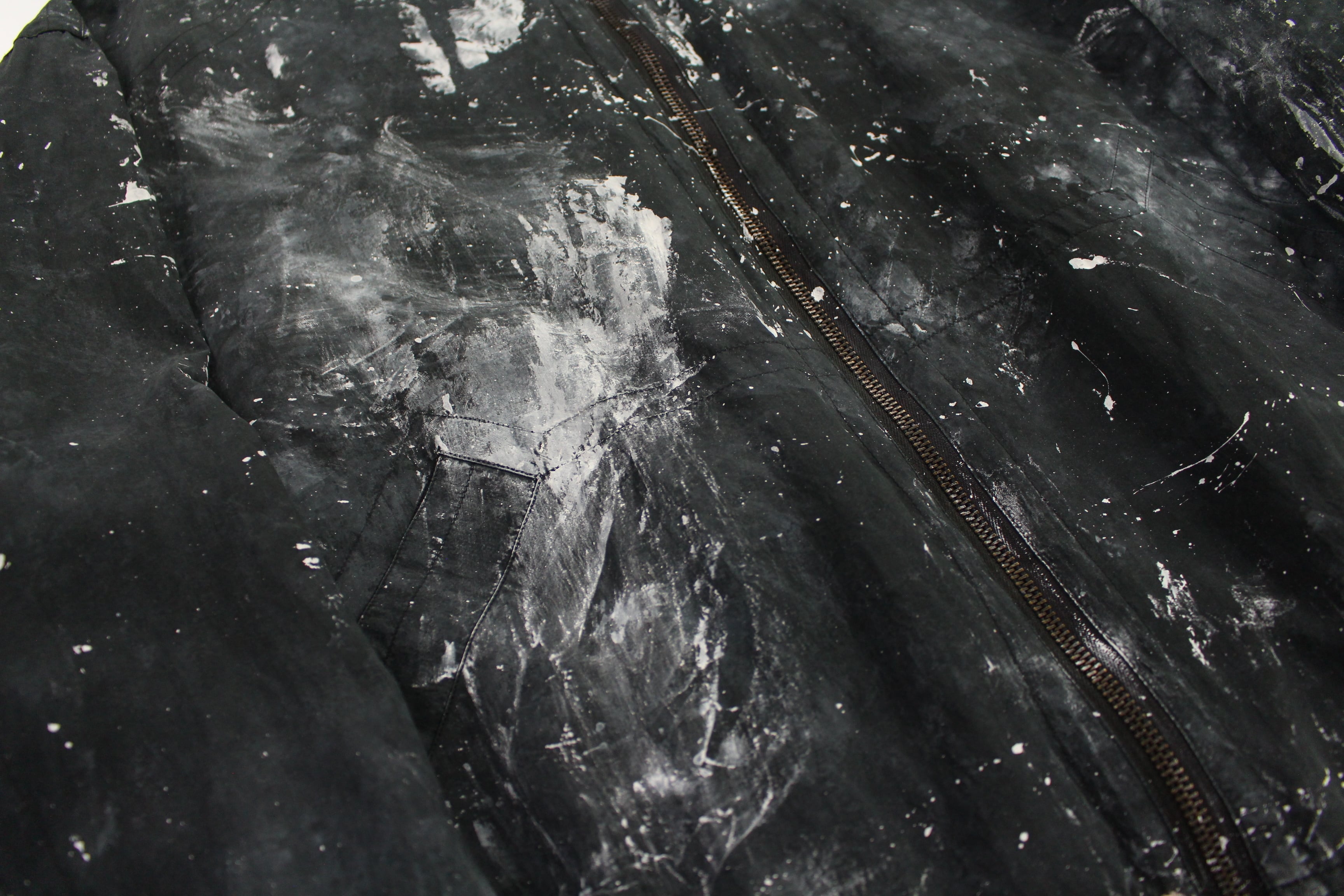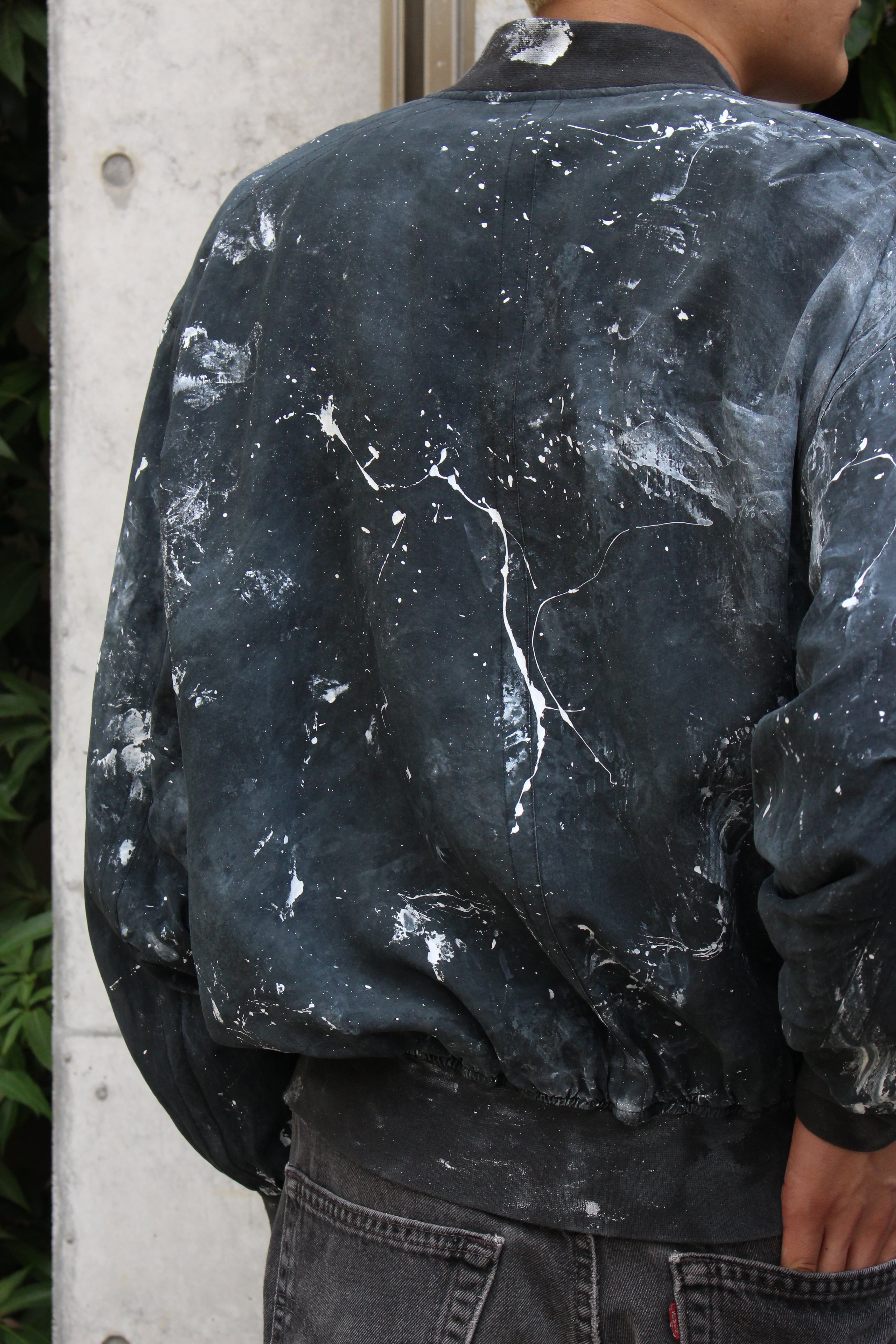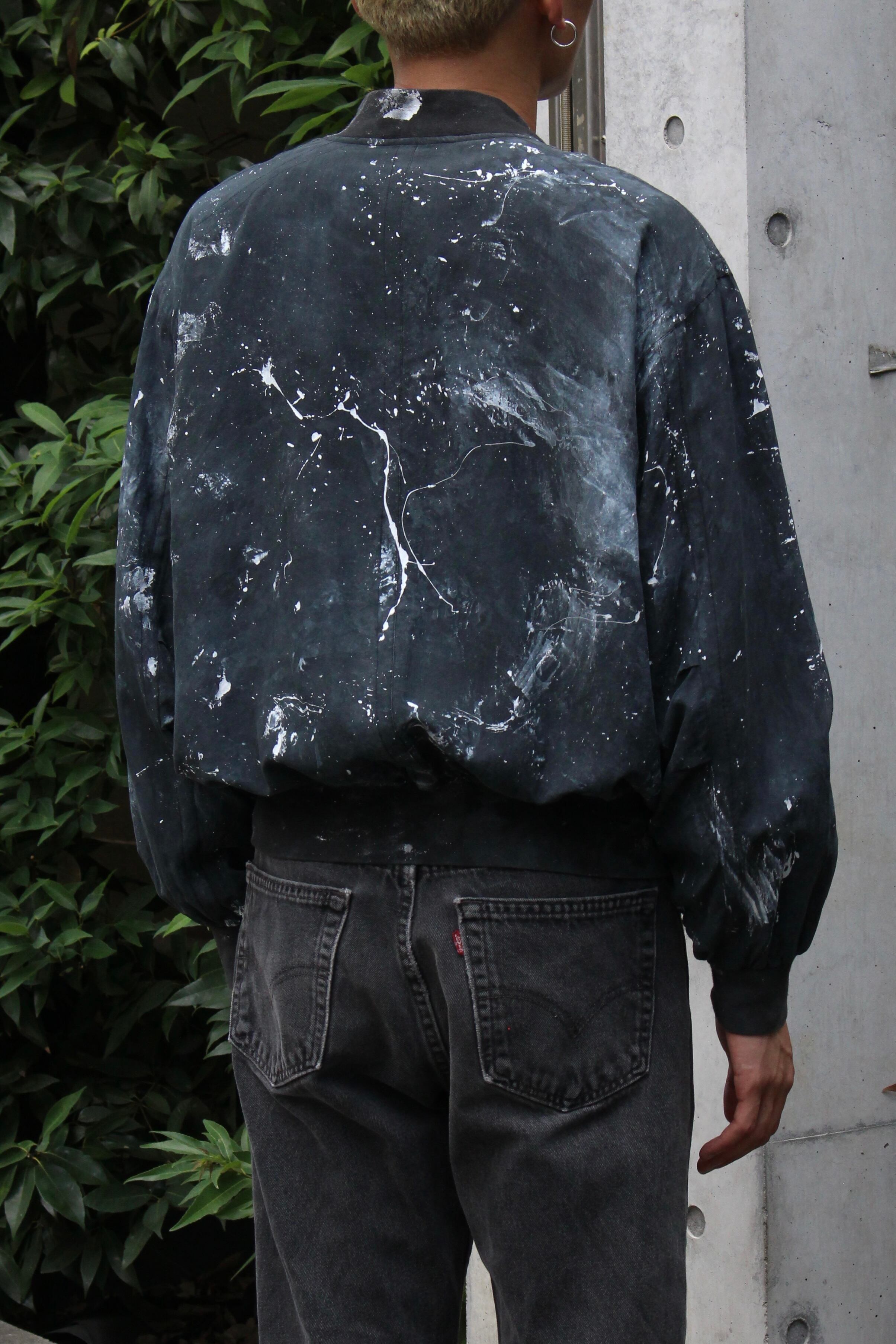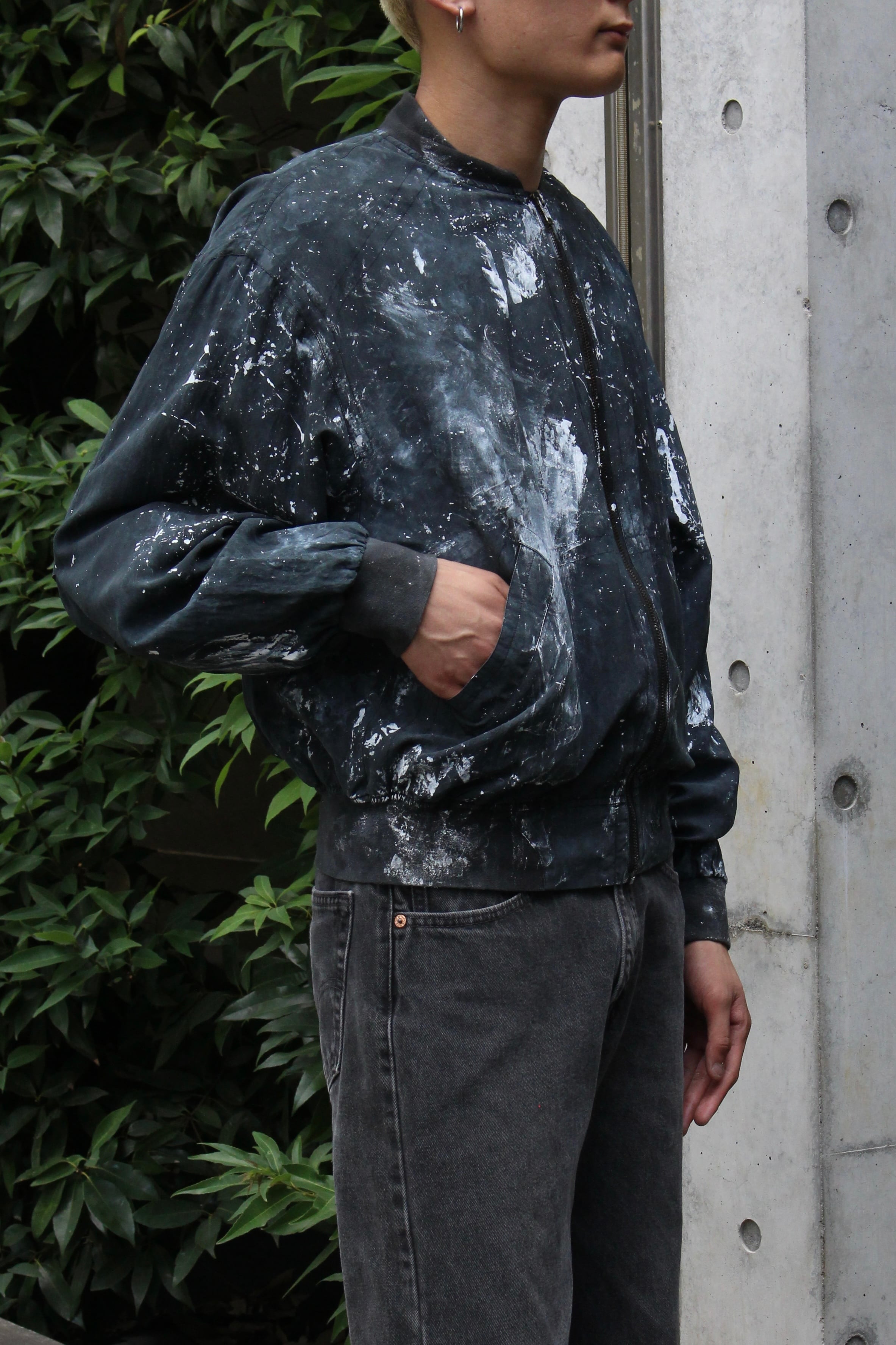 ブラックカラーのシルクボディをベースに、職人の手作業によるホワイトペンキ飛び加工を施したブルゾン。