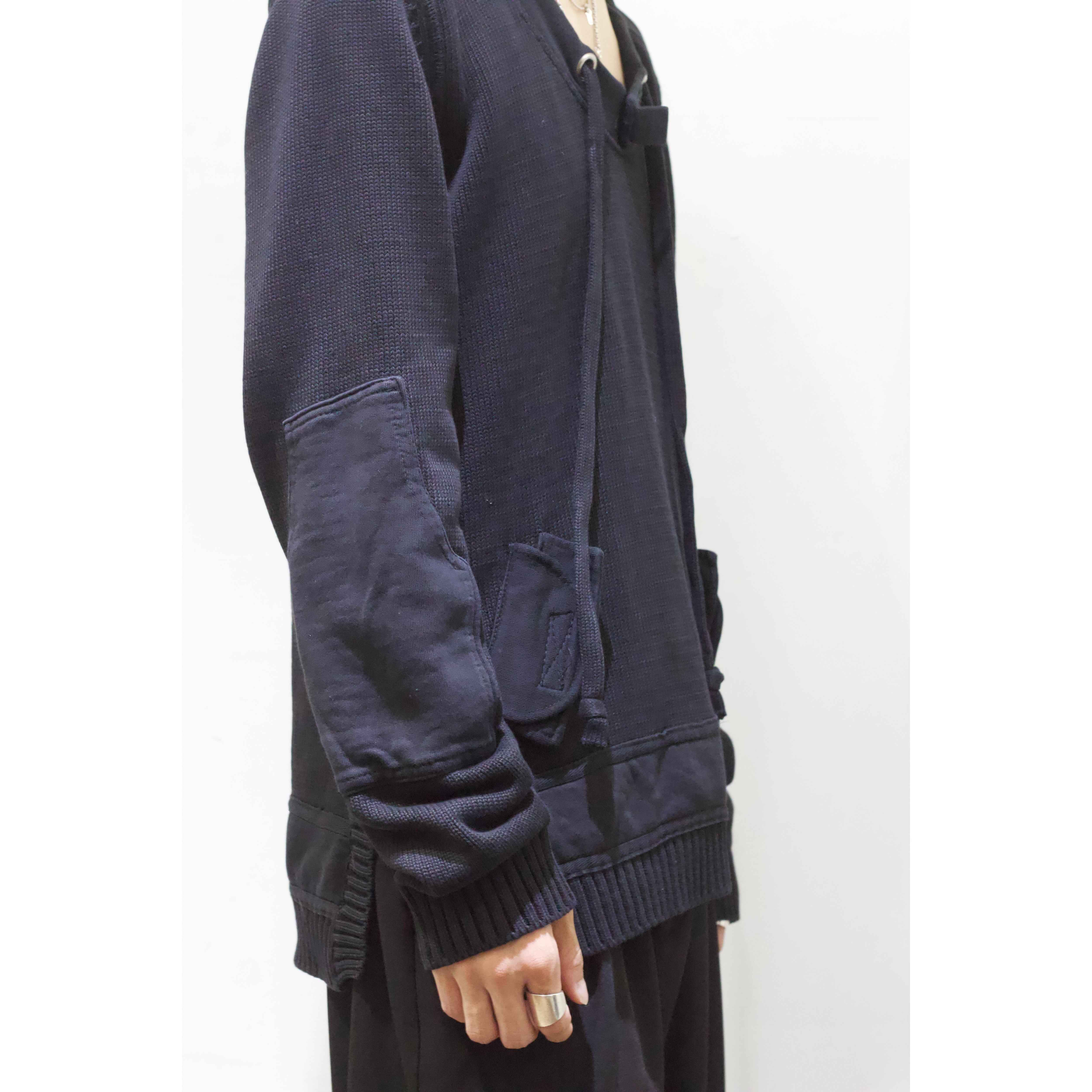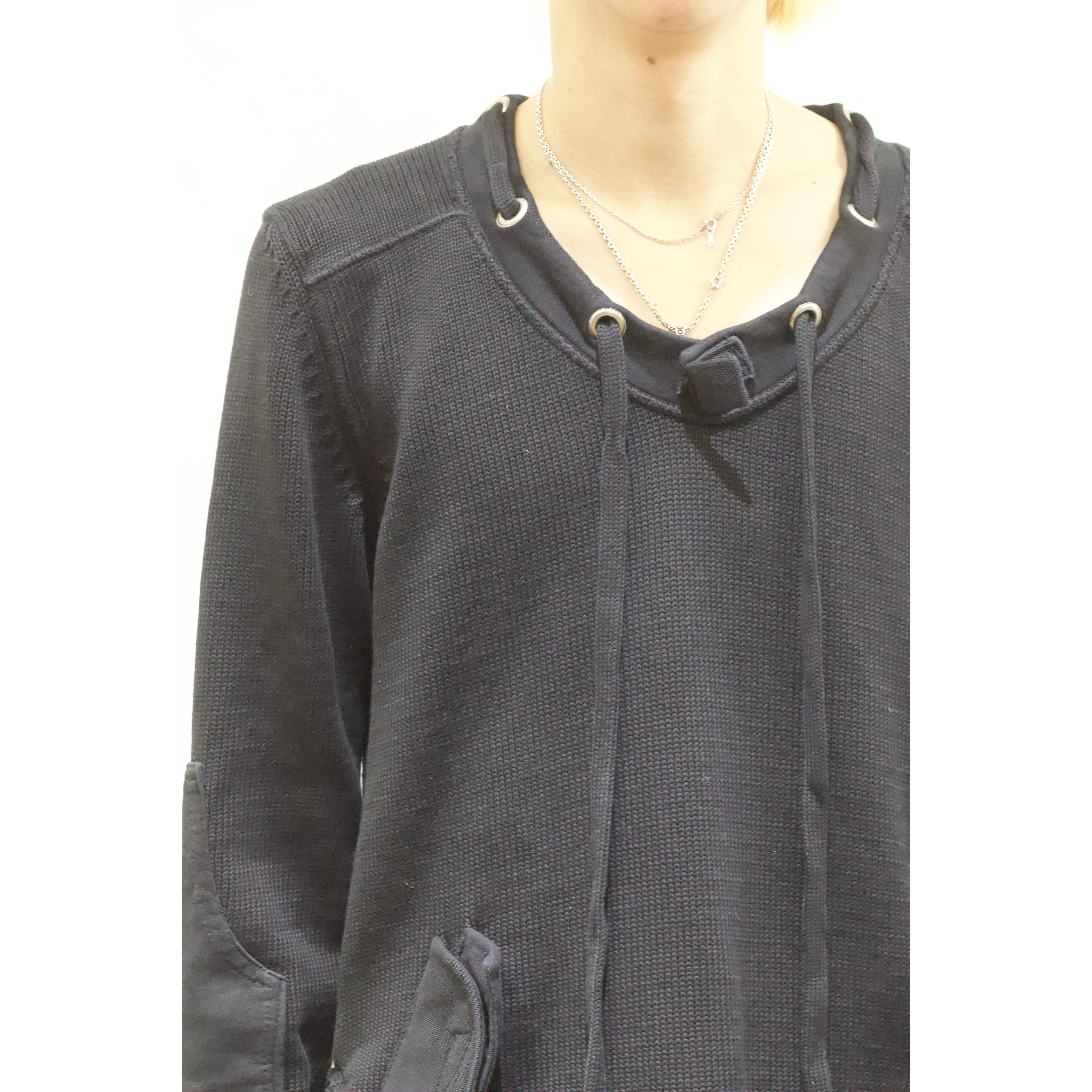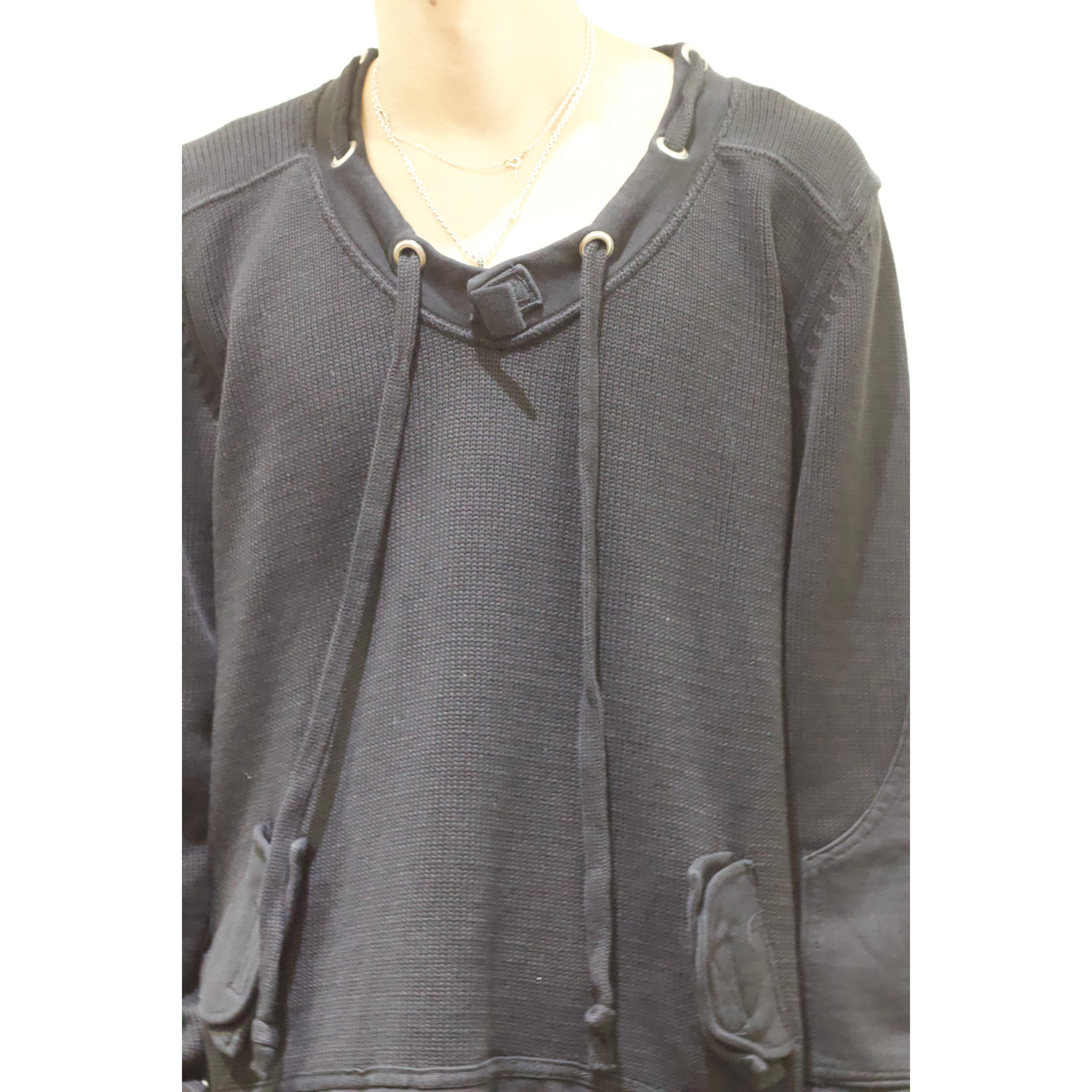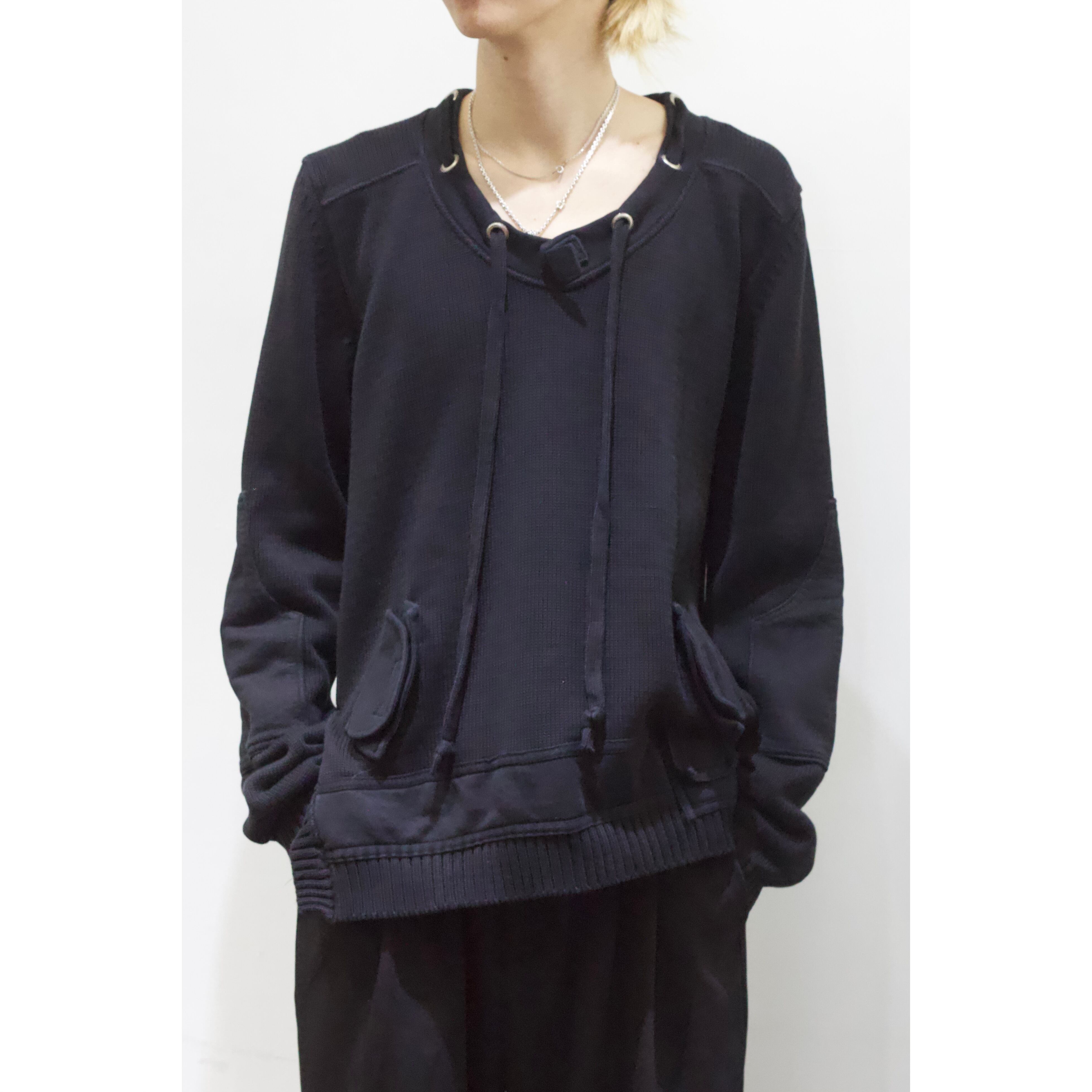 見るからにモード味溢れる唯一無二感の強いニット。首周りにはドローコードが付き両サイドにはベルクロ付きのフェイクポケット。袖には大きめのエルボーパッチが付き圧倒的なデザイン力。