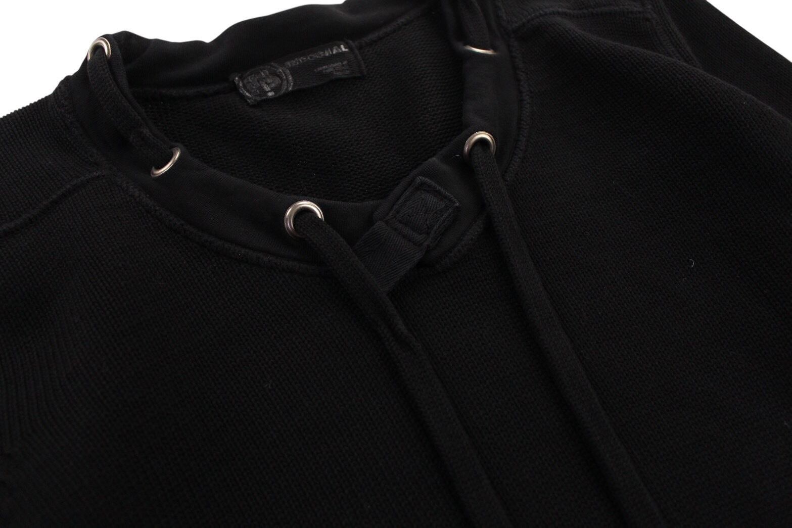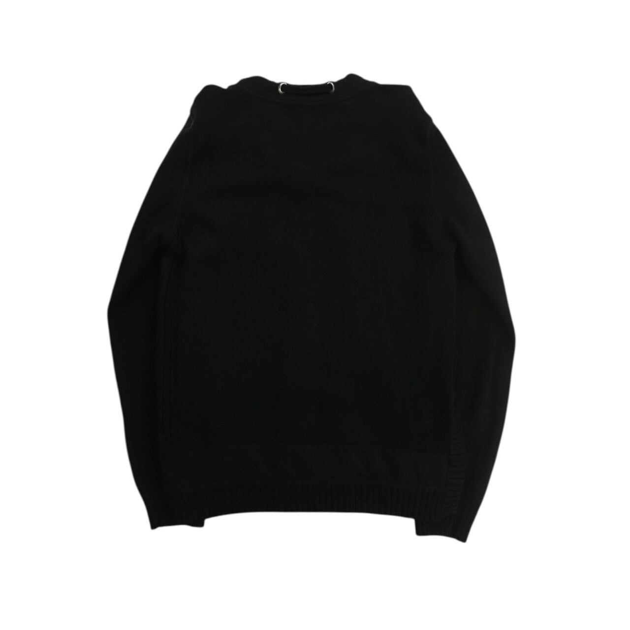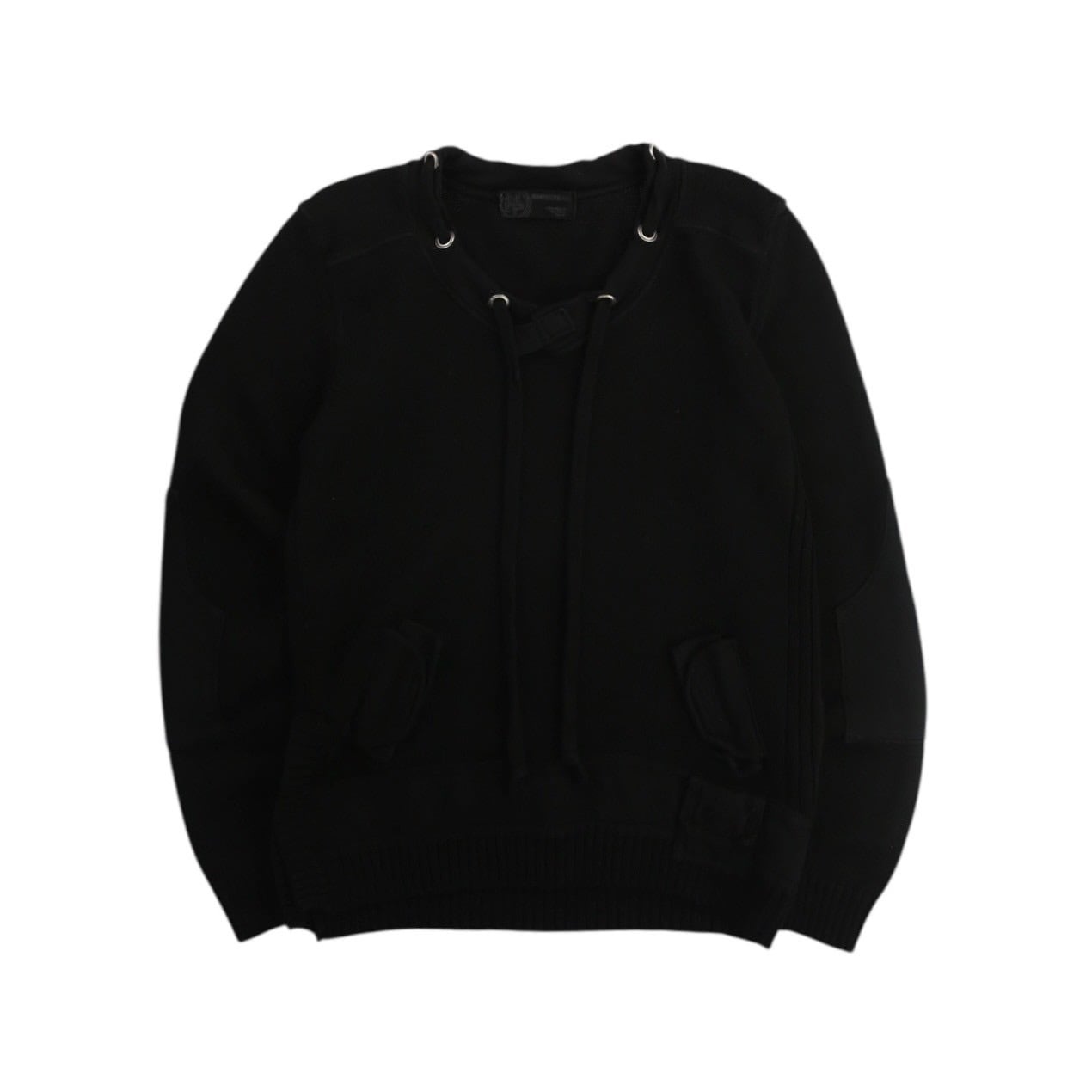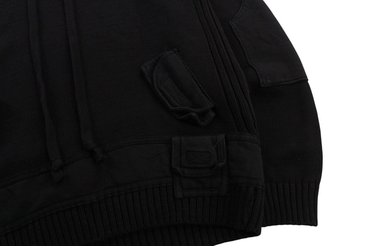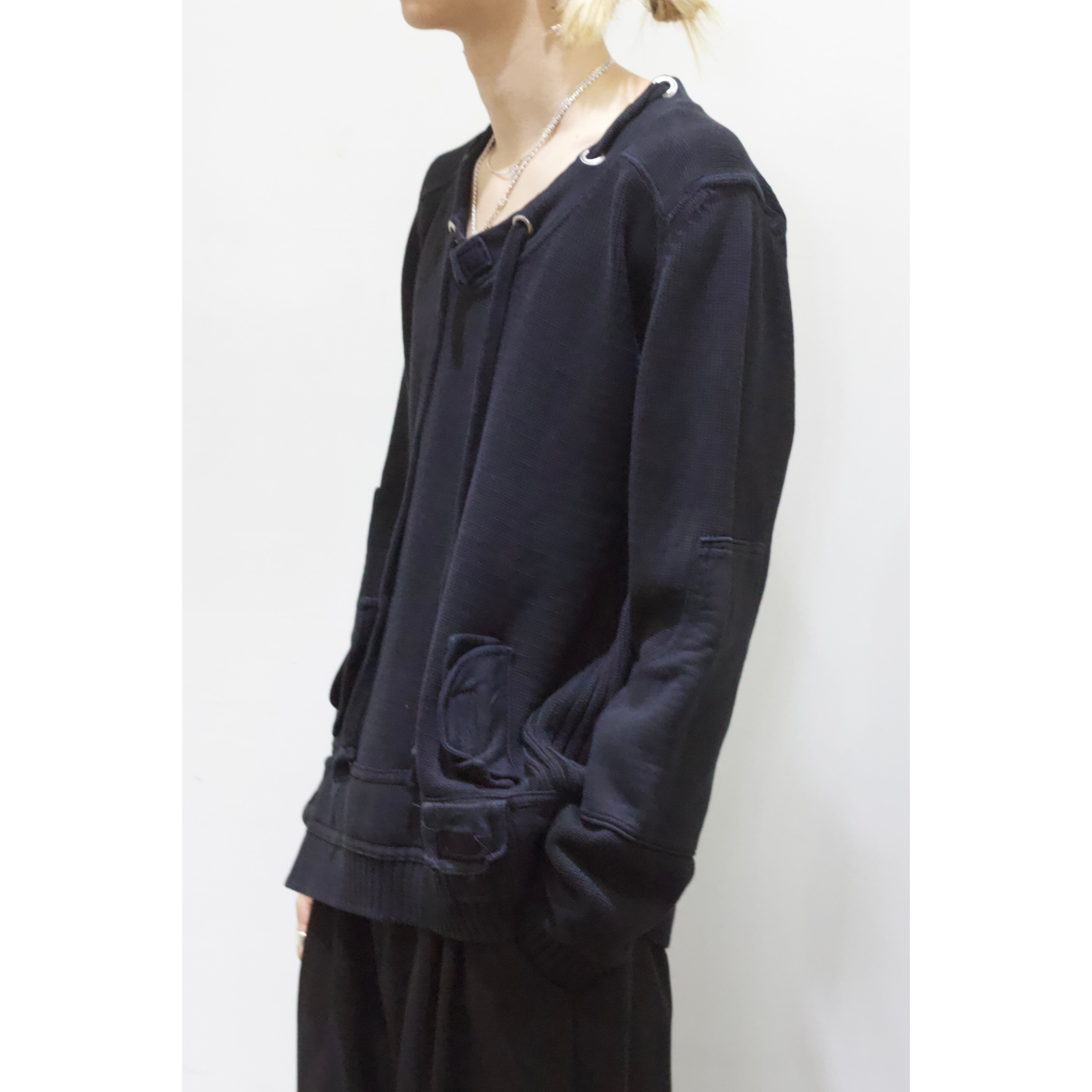 見るからにモード味溢れる唯一無二感の強いニット。首周りにはドローコードが付き両サイドにはベルクロ付きのフェイクポケット。袖には大きめのエルボーパッチが付き圧倒的なデザイン力。