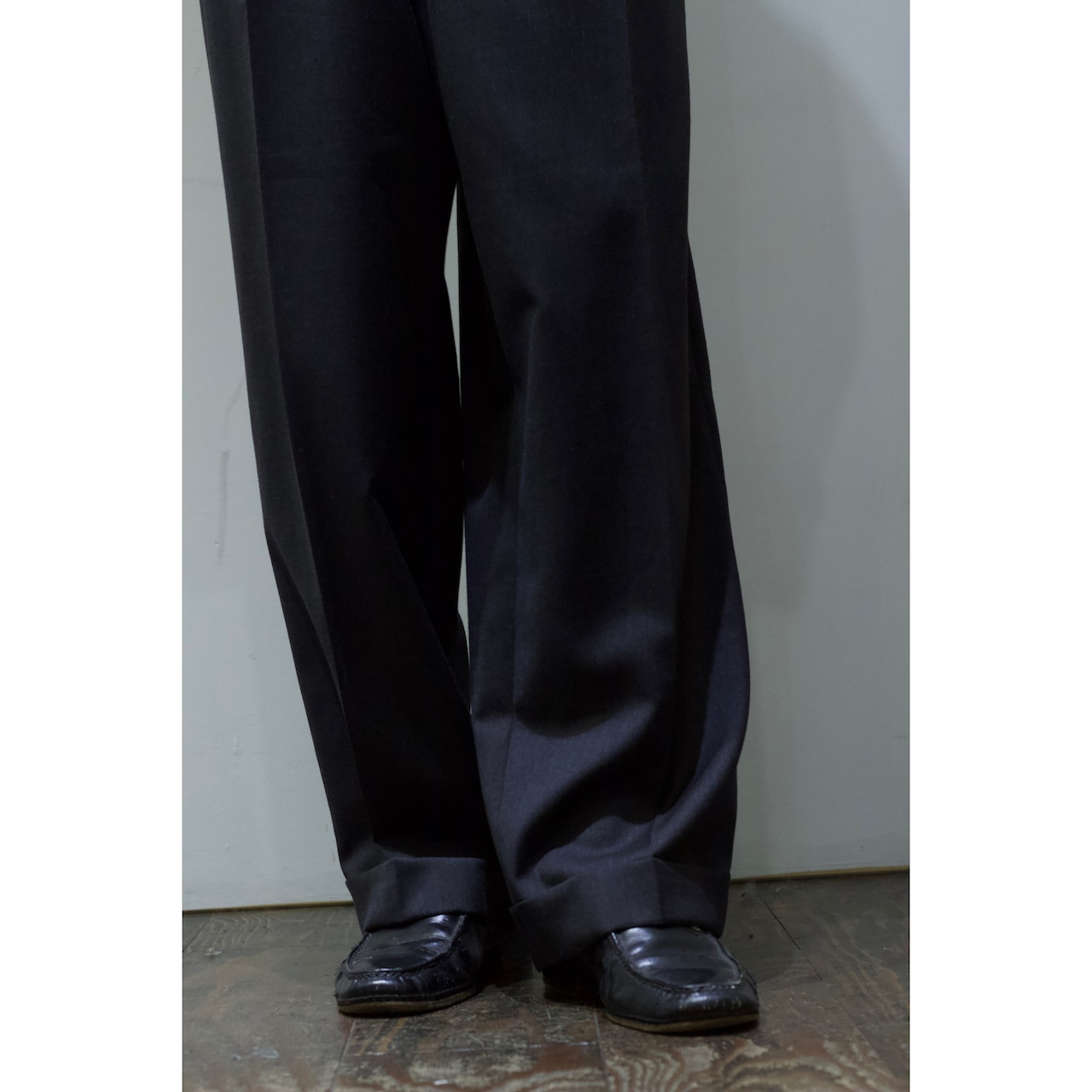 ウエストは広めですがそのウエストから成るワイドなシルエット。生地感も柔らかいのでベルトでギュッと絞っていただければそのワイドさを存分に堪能できます。