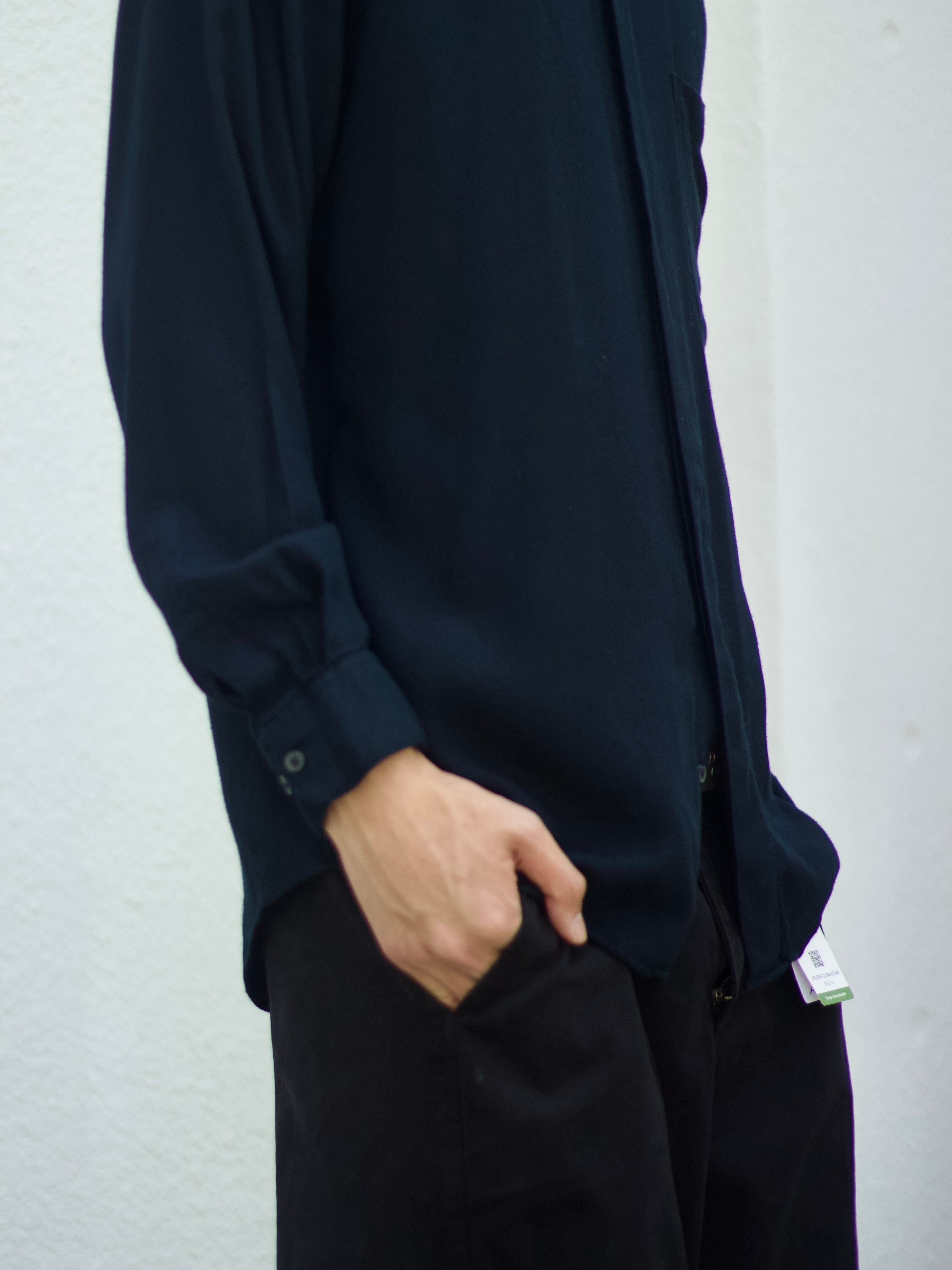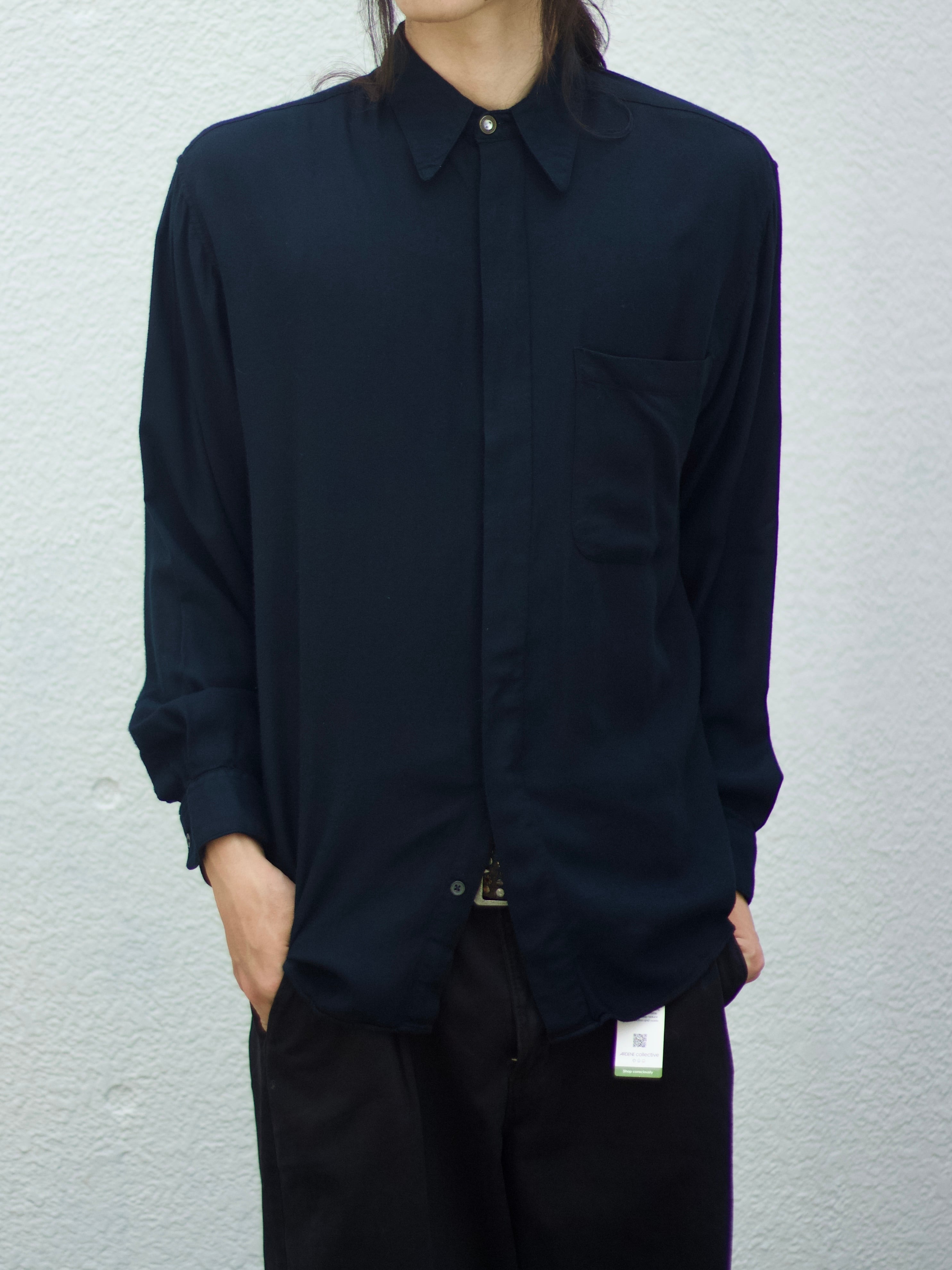 少し起毛しているような生地感で、レーヨンならではのとろみ、落ち感がある良いシャツですね〜