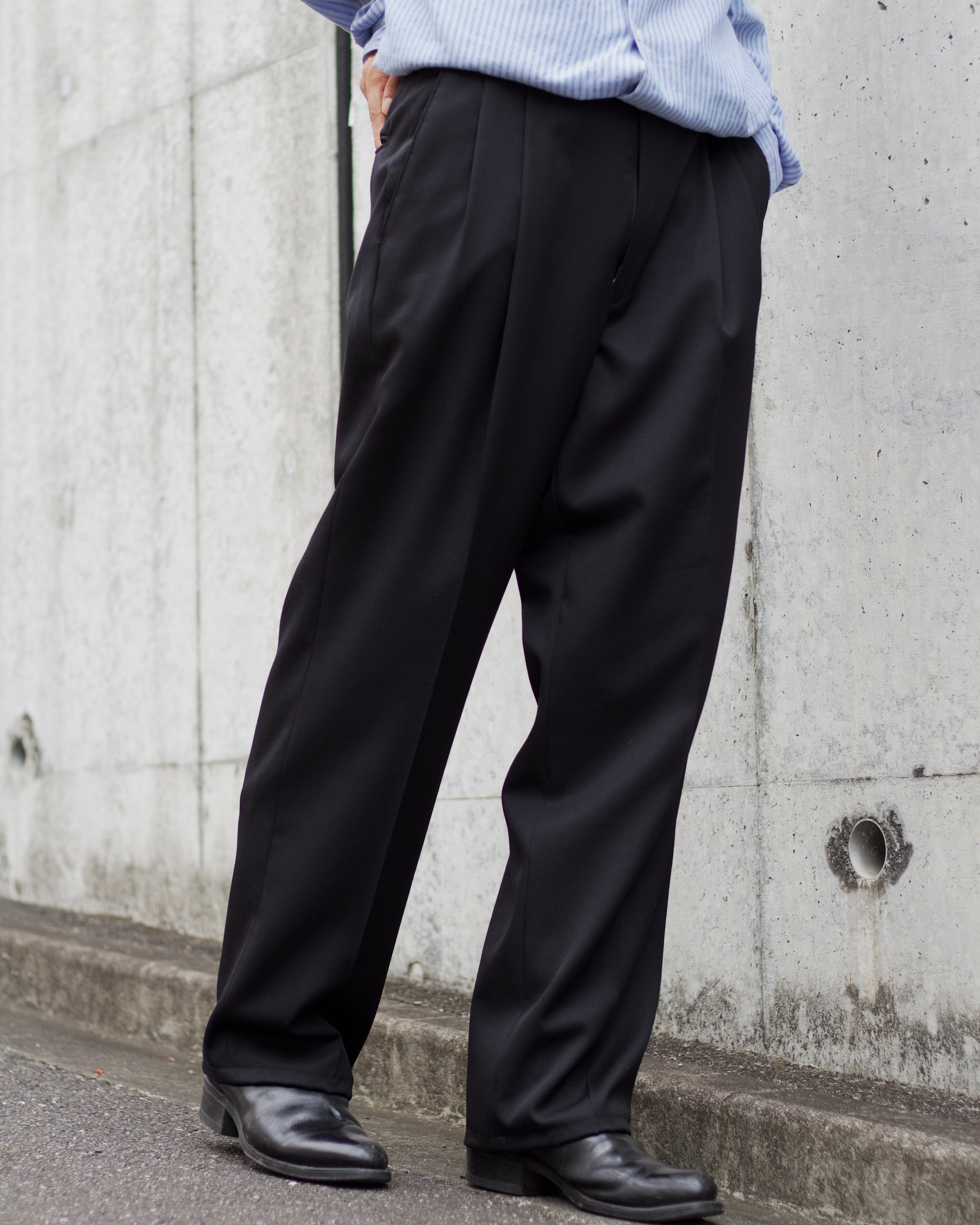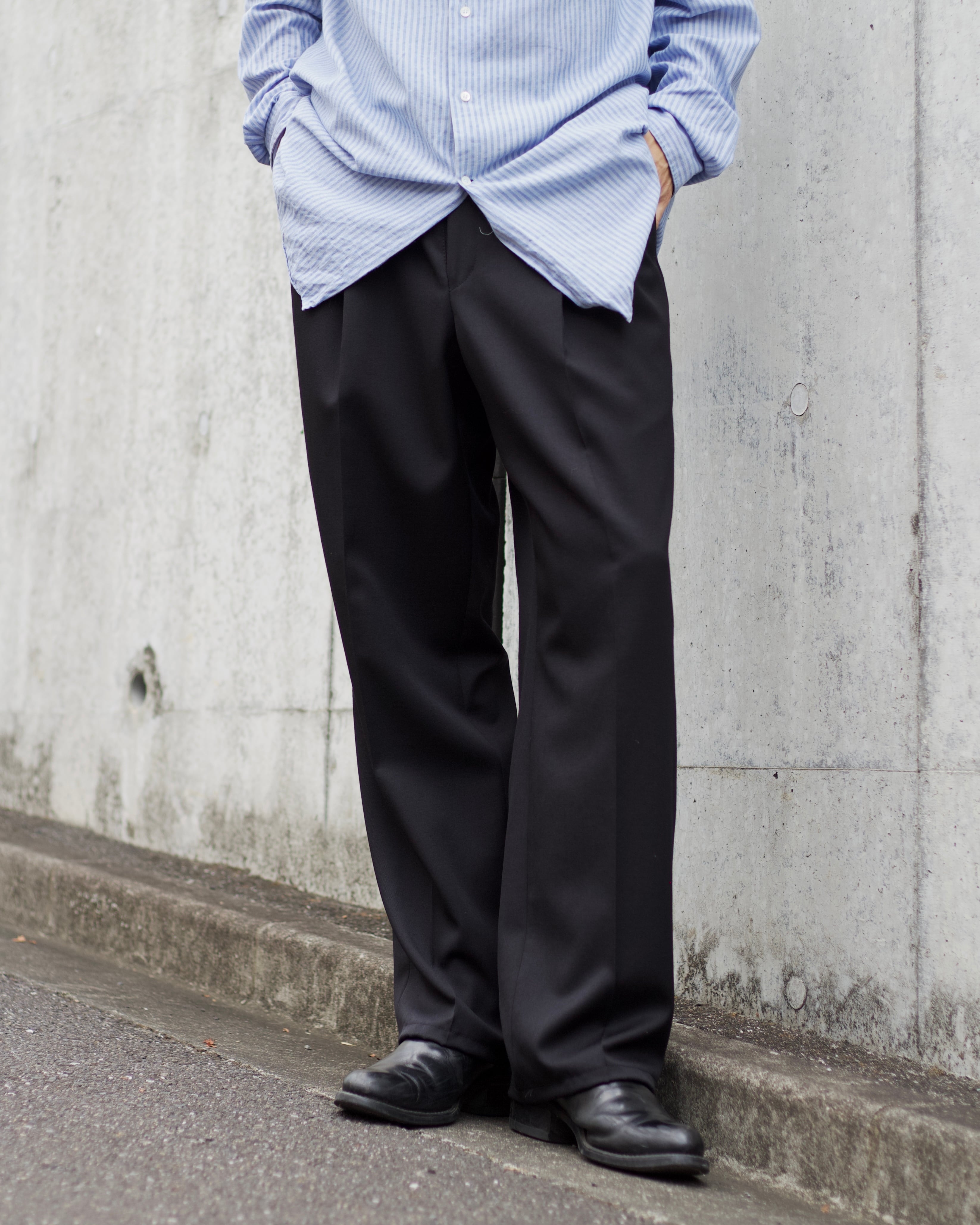 テーパードが少しだけ効いていますが、2タック入っていることで、ワイドになりテーパードが気にならないのでストレートに見えます。