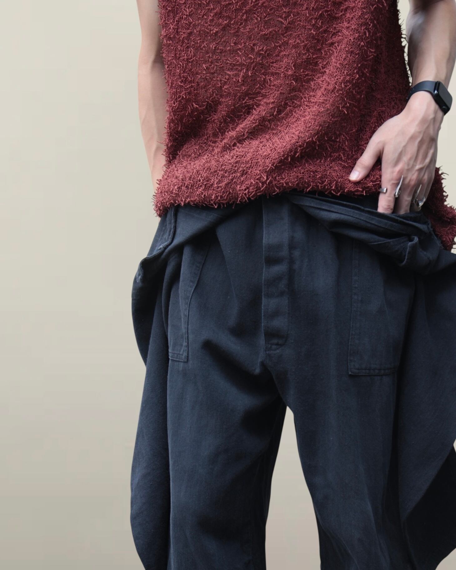 ウエストゴムも入りシェイプの効いたシルエットだったりと、良い意味でワーク感があまり無く細部の拘りはデザイナーズの様なアイテムです☺︎