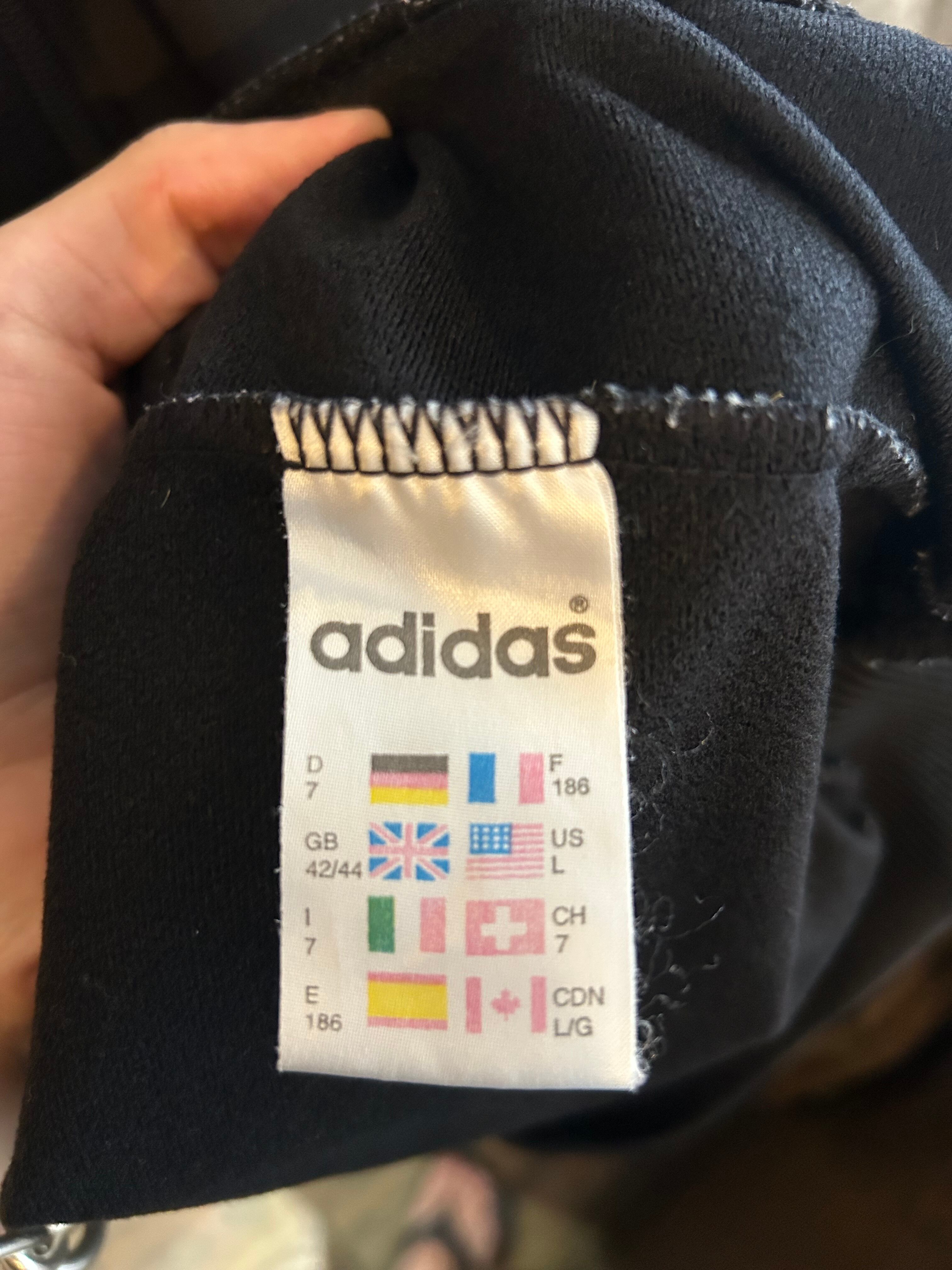 王道adidasのスリーラインデザインにジャージー生地。ブラックボディにブランドを象徴するアーム三本ホワイトライン。