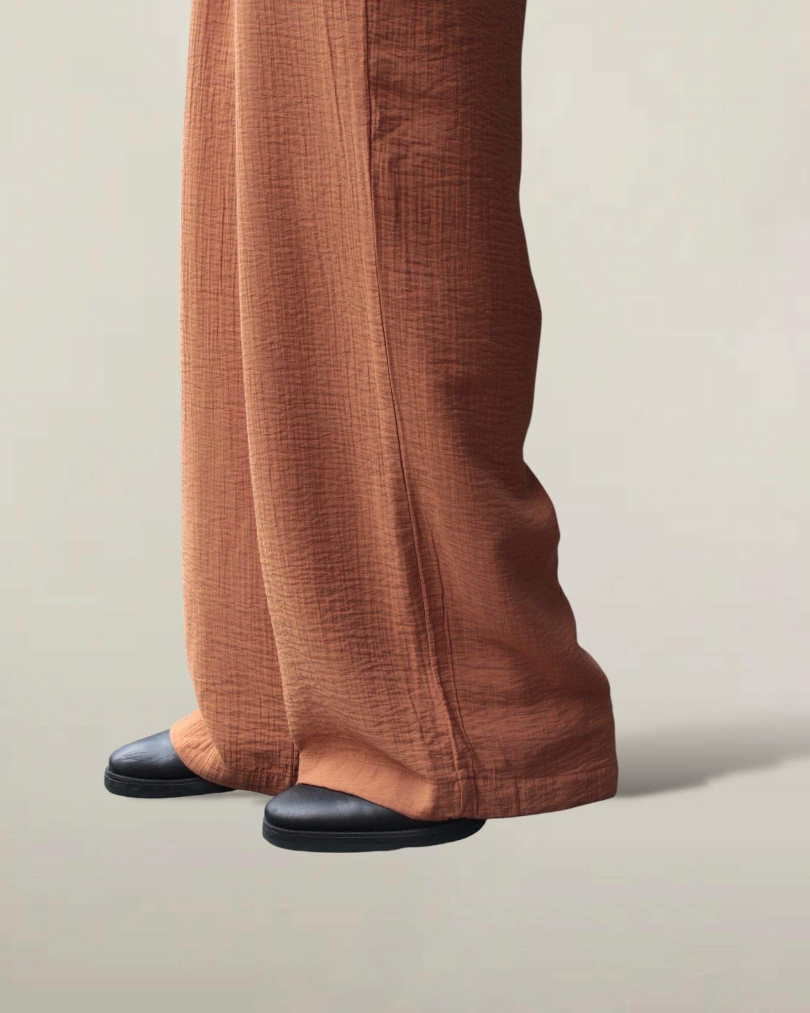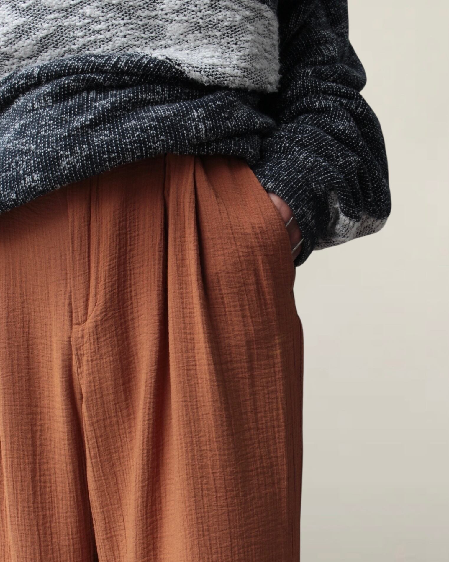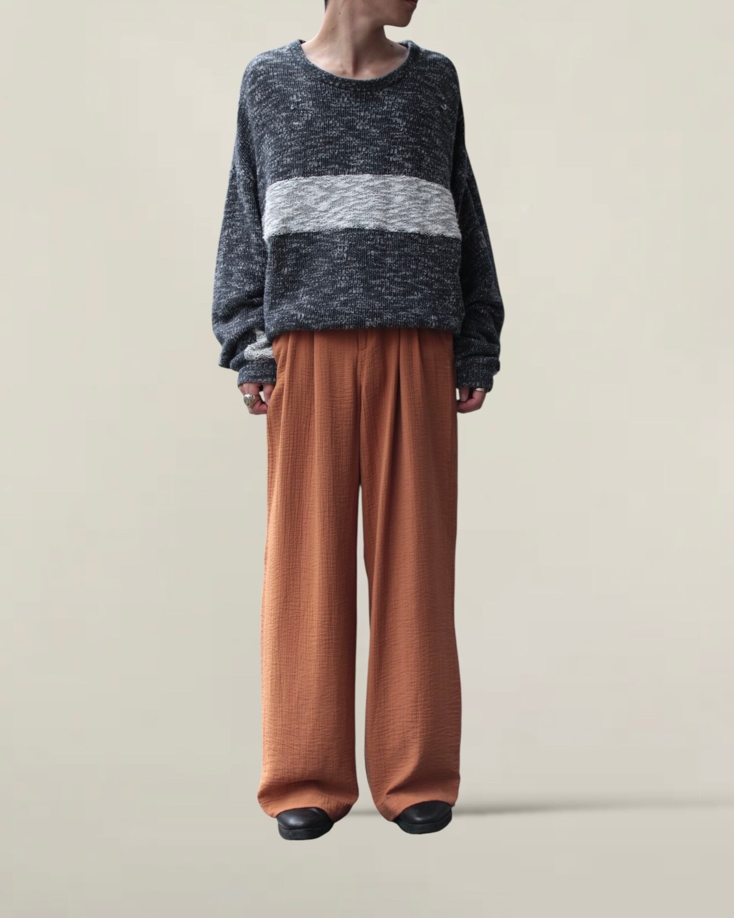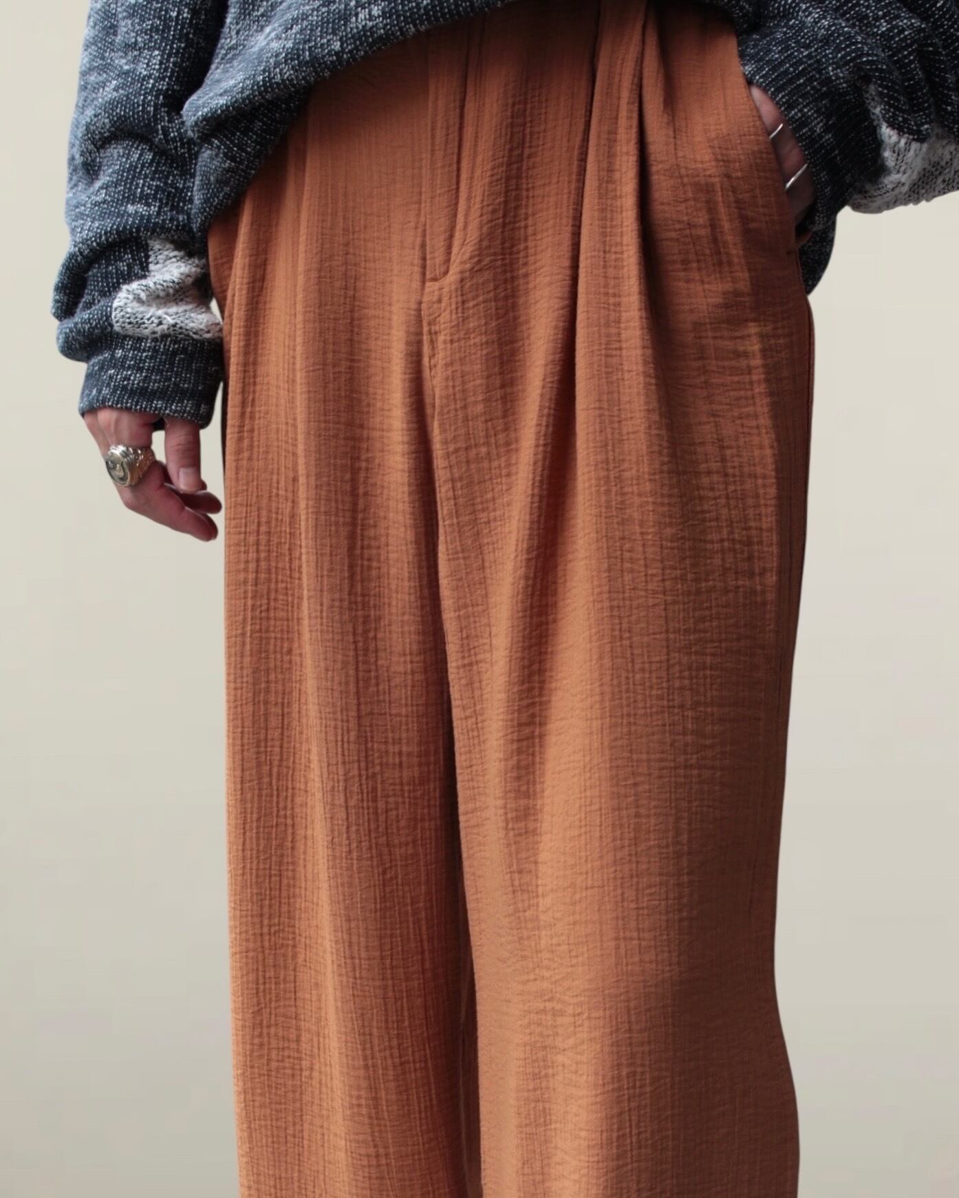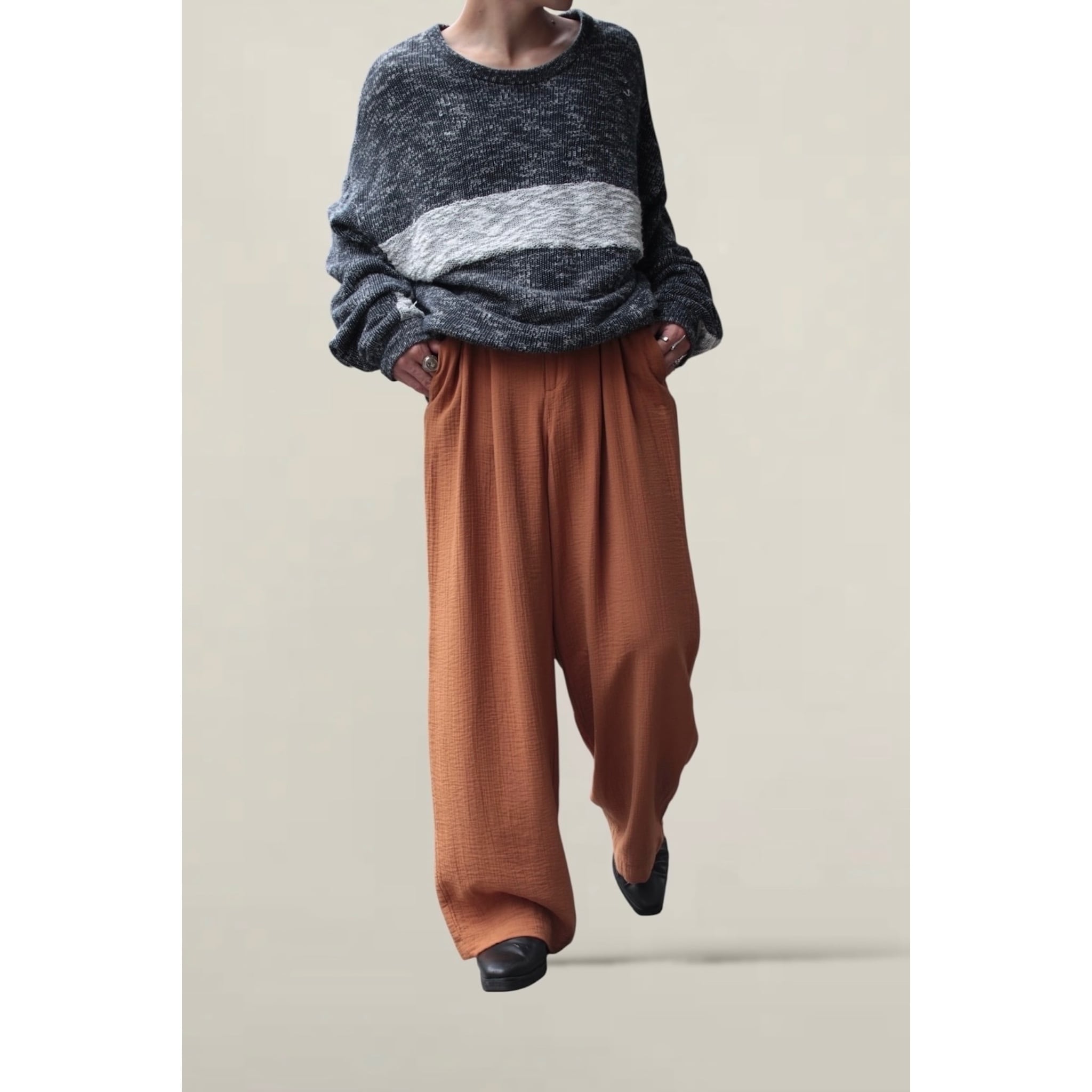 レーヨンのとろみのあるシワ加工の生地感。裾までのドレープが良く動きが感じられる滑らかなスラックス。堪らないです。。