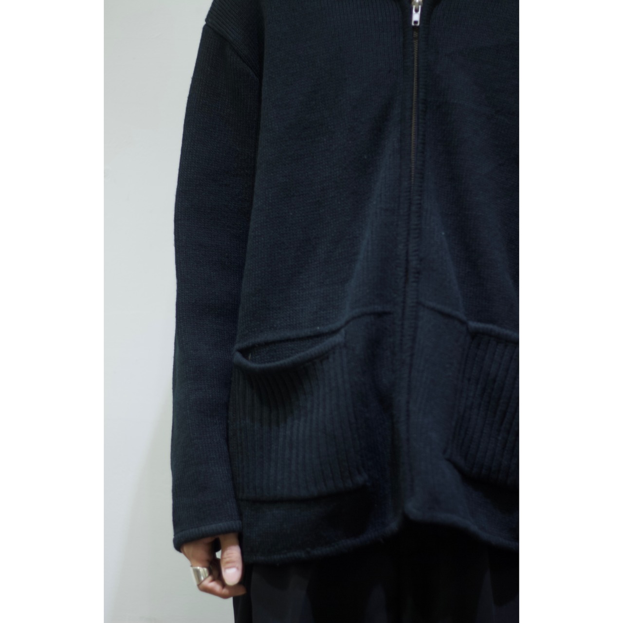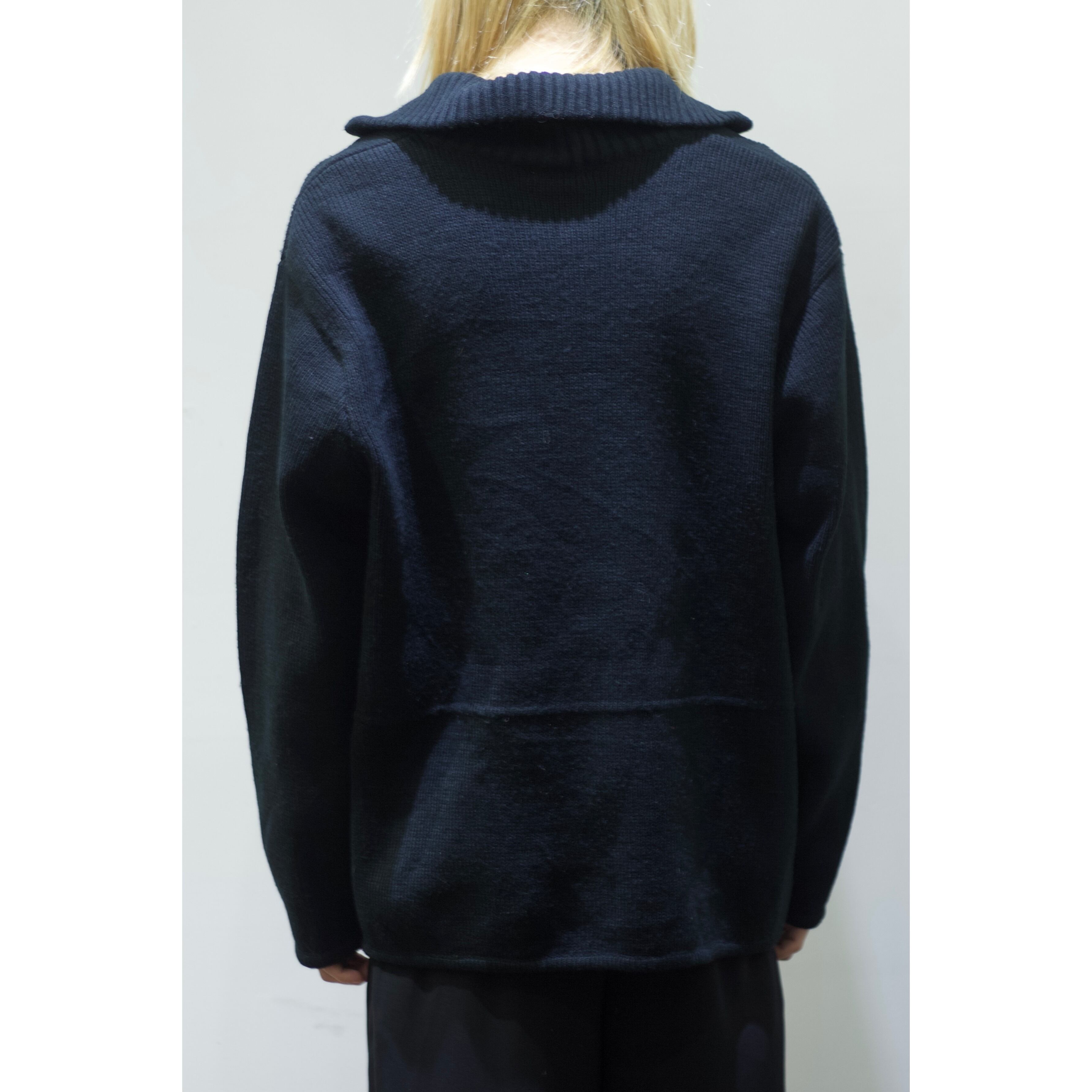 ドライバーズニットの特徴であるハイネック仕様に両サイドポケット。閉めればジップ部分が隠れる比翼デザインも素晴らしい。
