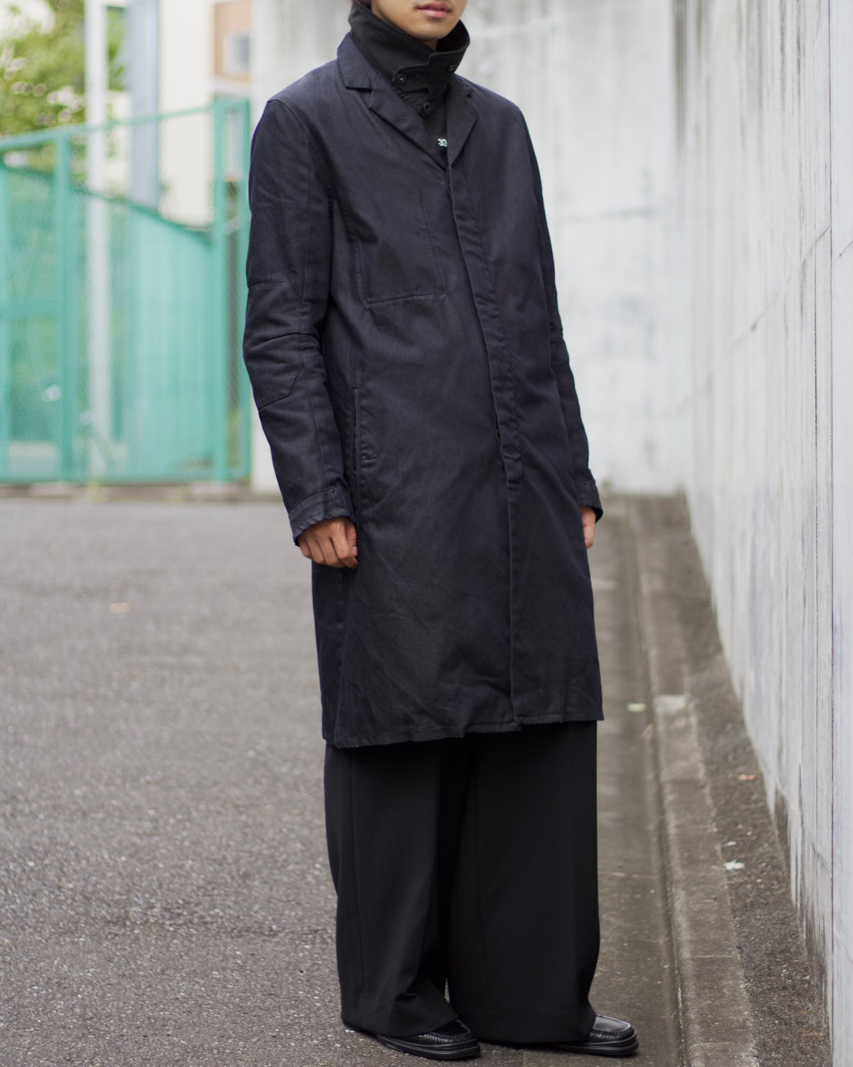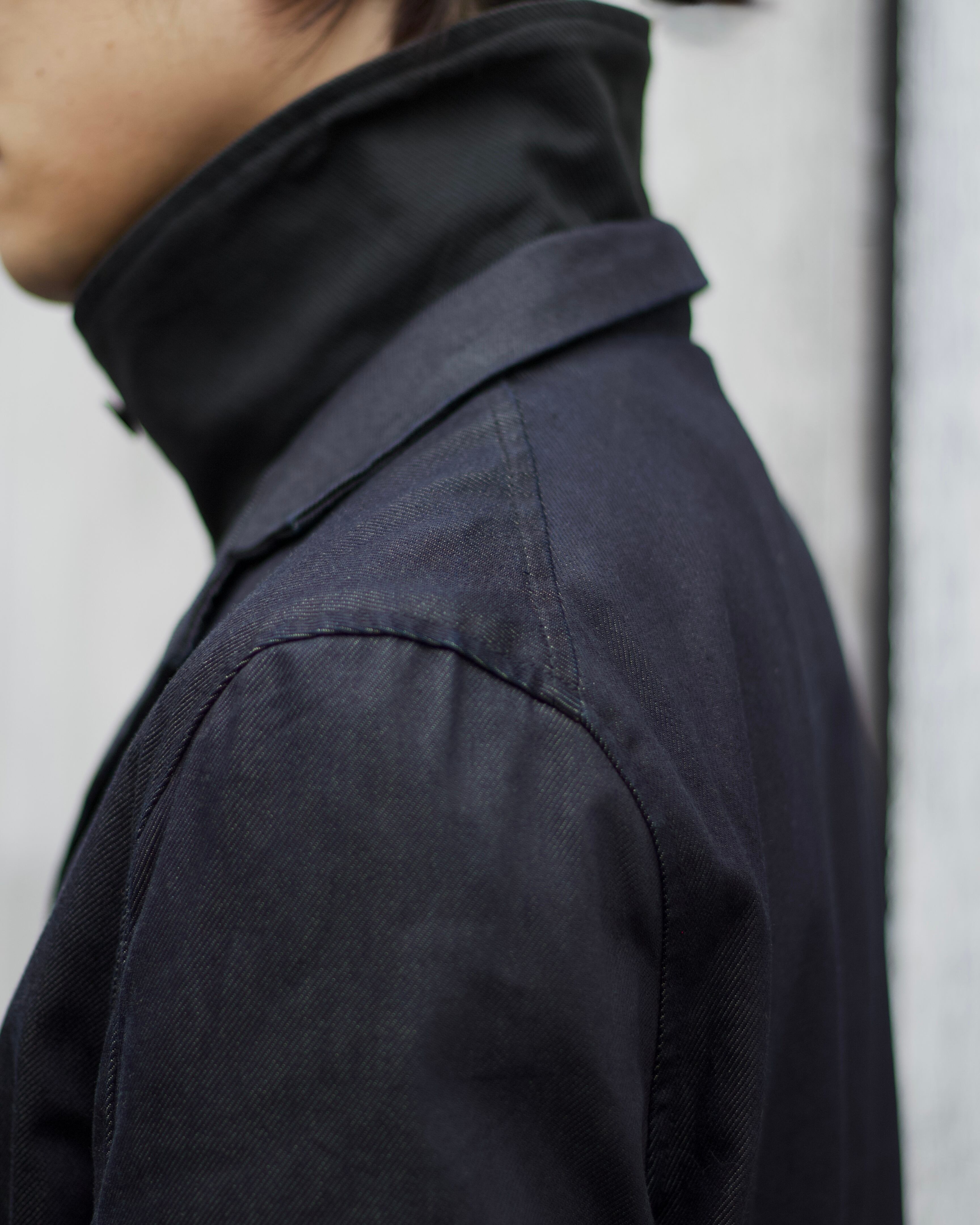 ハイネックのインナーとデニムのオープンカラーコートがドッキングしたデザイン。