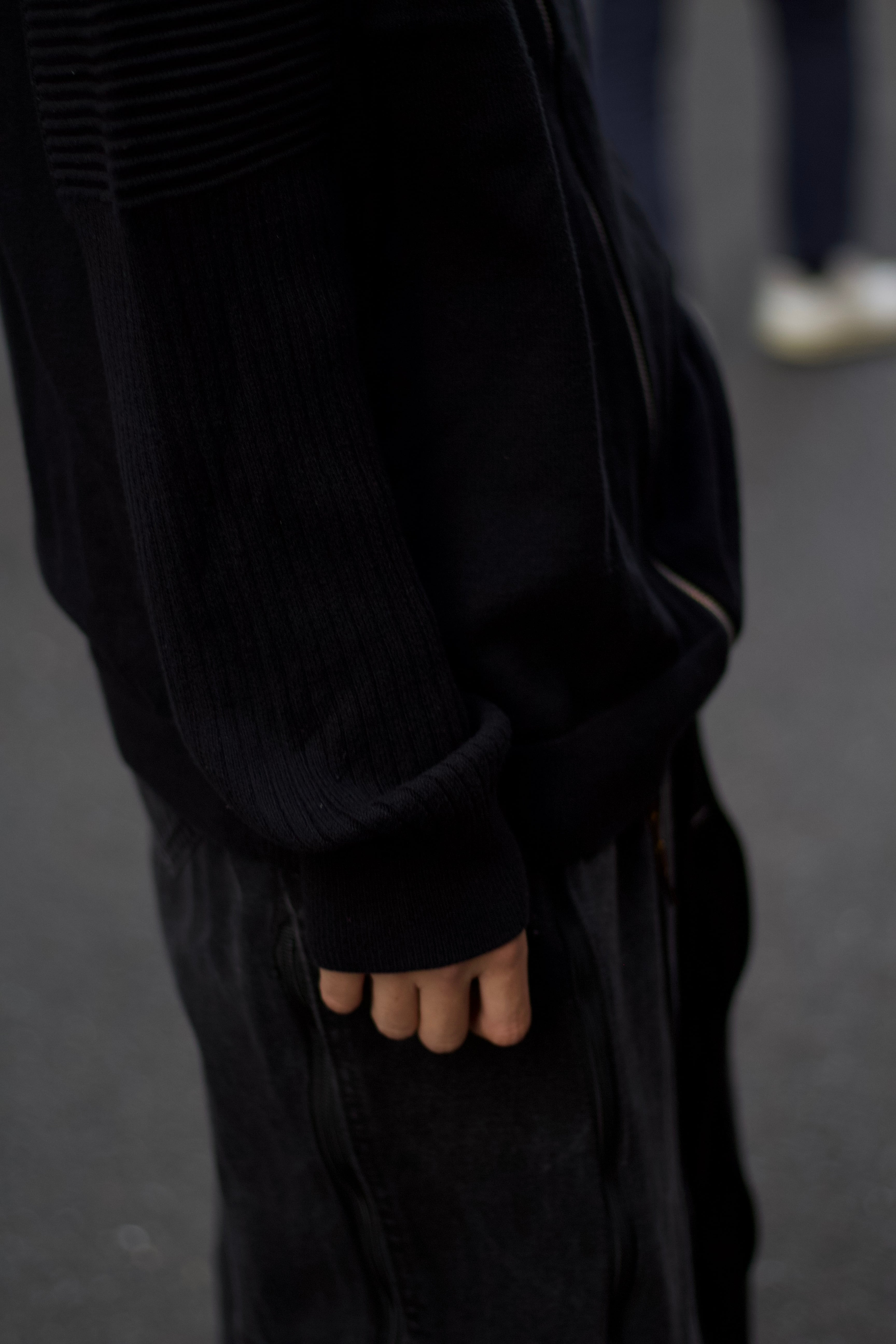 リブ編みのデザインはニットに立体感と、ニットの長い袖丈は攻撃的な雰囲気が今っぽくてかっこよいです〜
