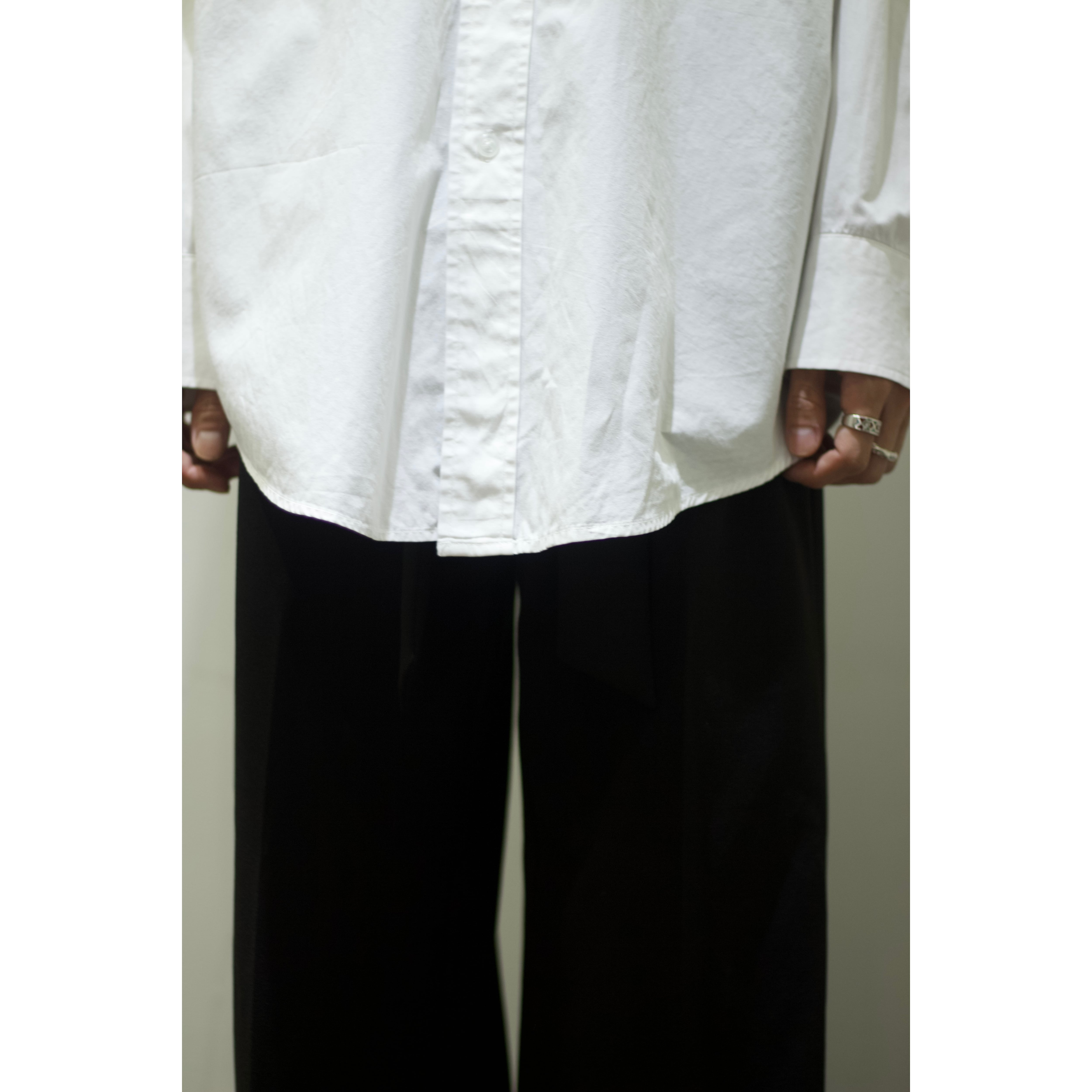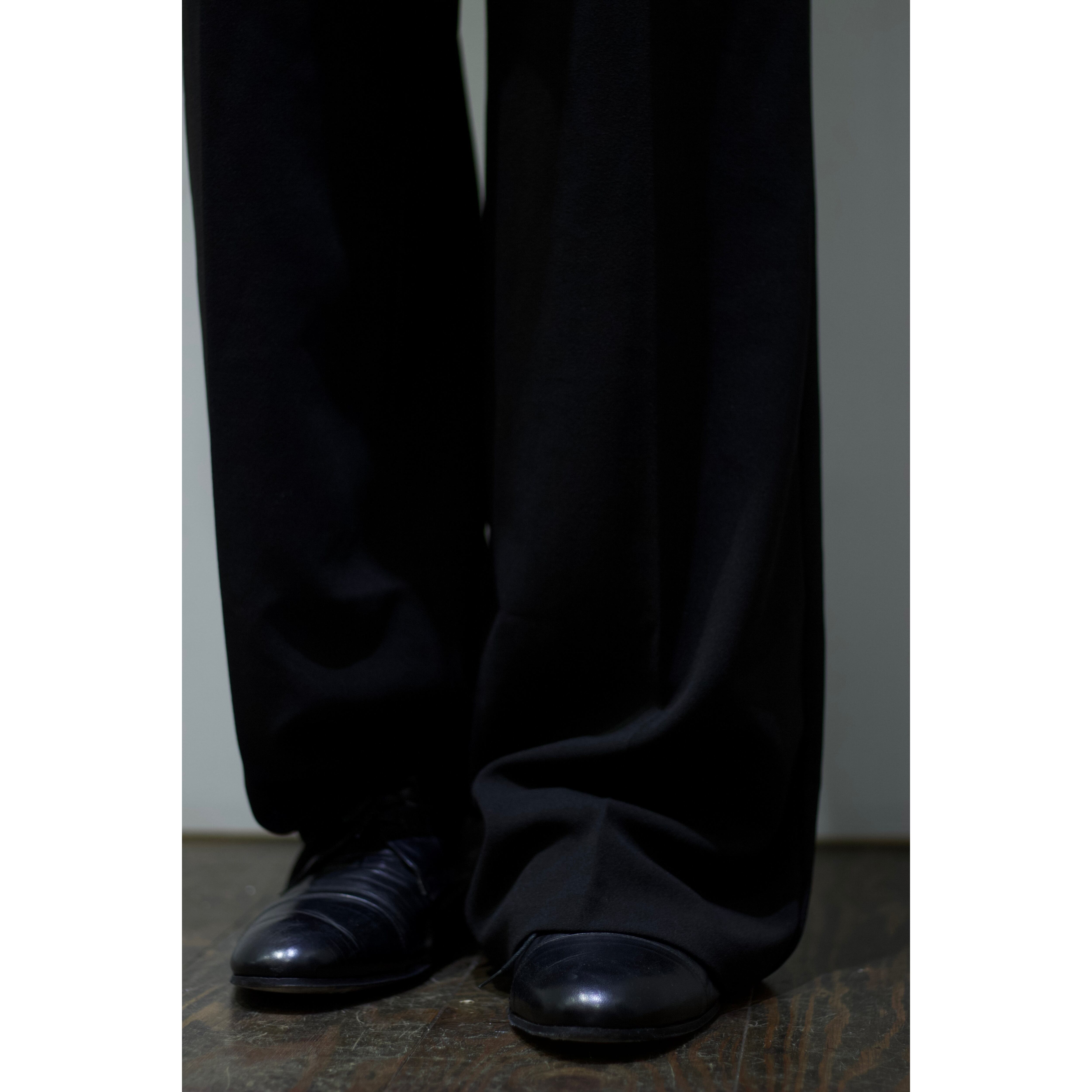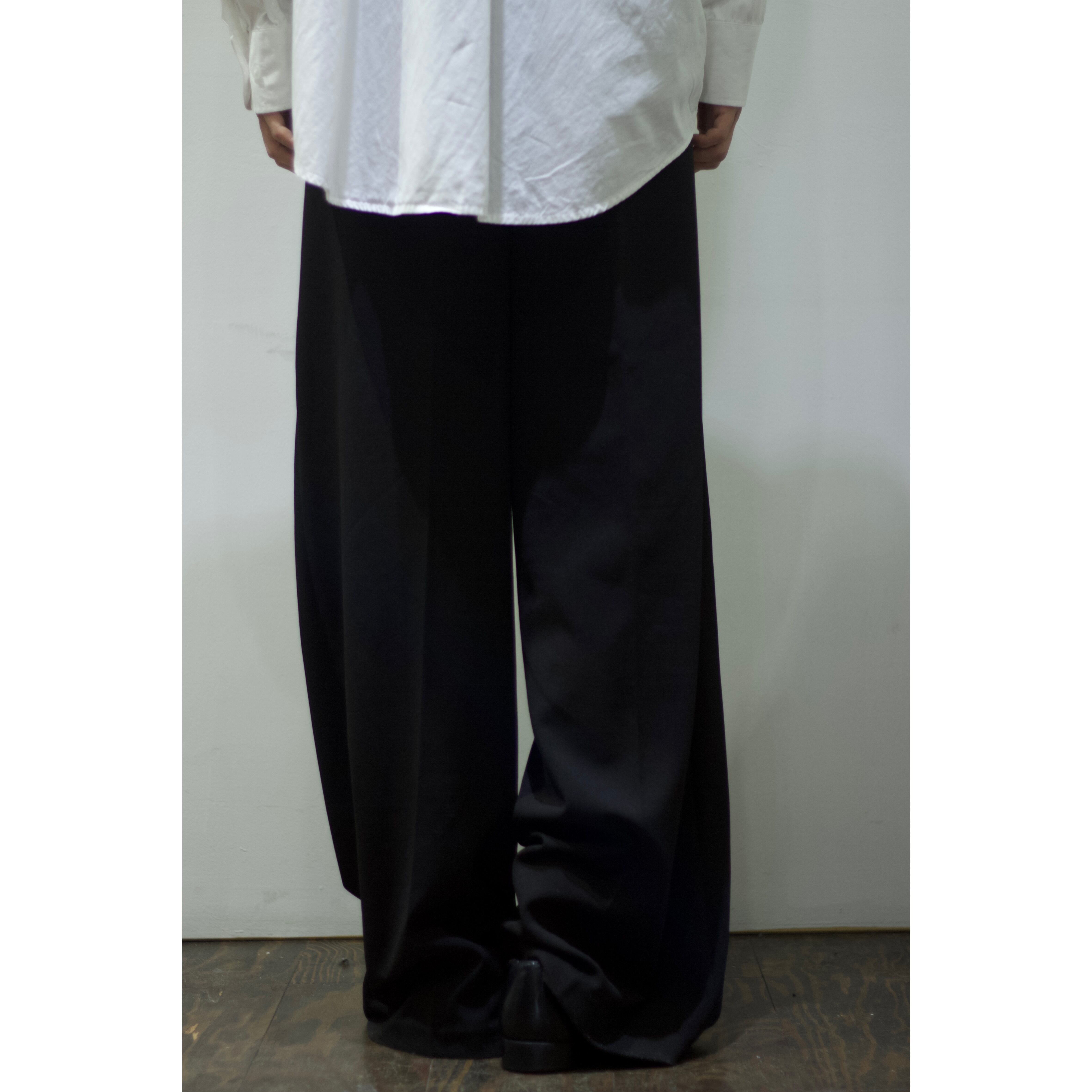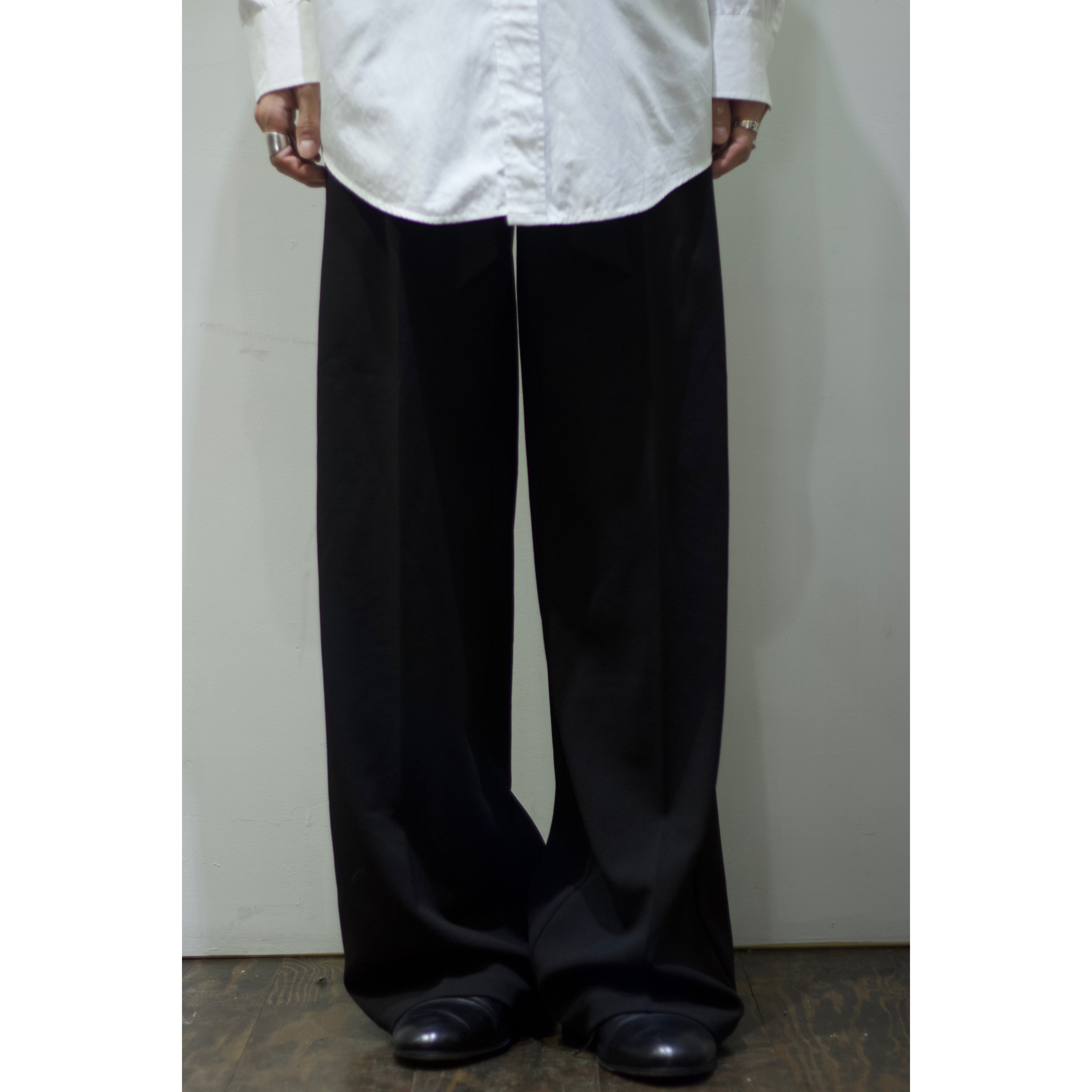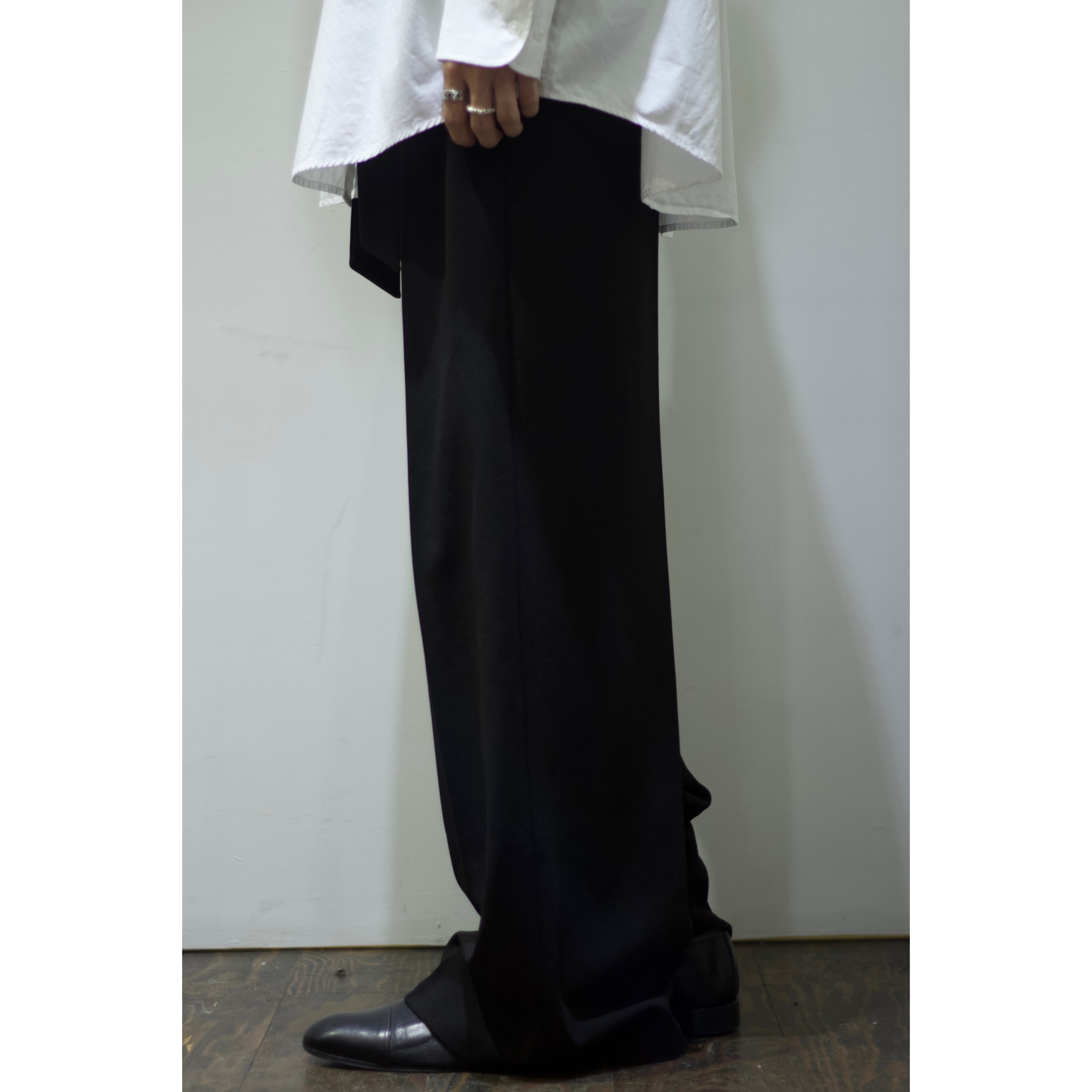 ドレープ感がたまらない裾幅約30cmの裾までストンっと落ちるワイドシルエット。ファブリックとシルエットが絶妙にマッチした古着らしくない逸品。