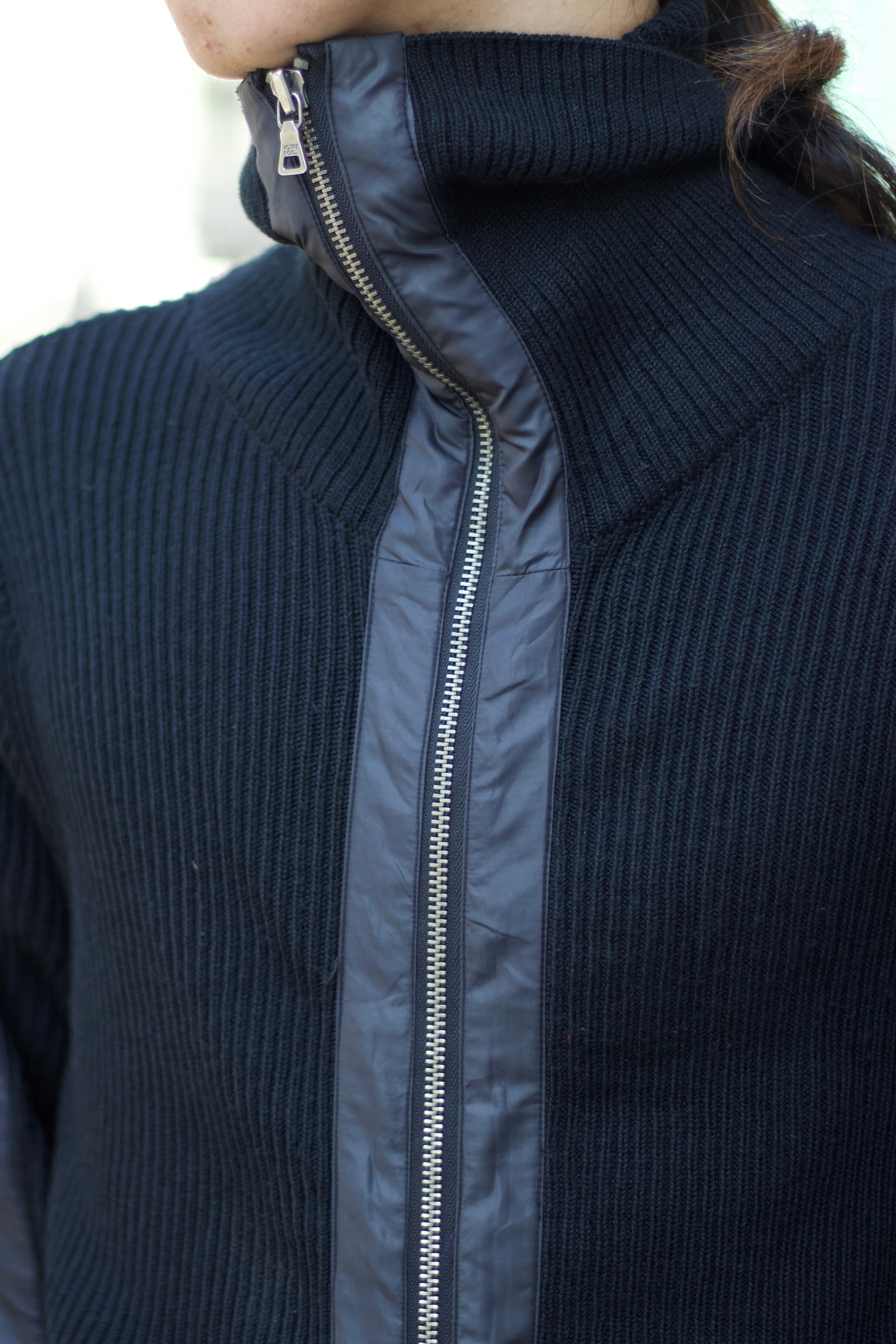 ハイネックタイプでも、襟タイプにも変幻自在な万能な一着。