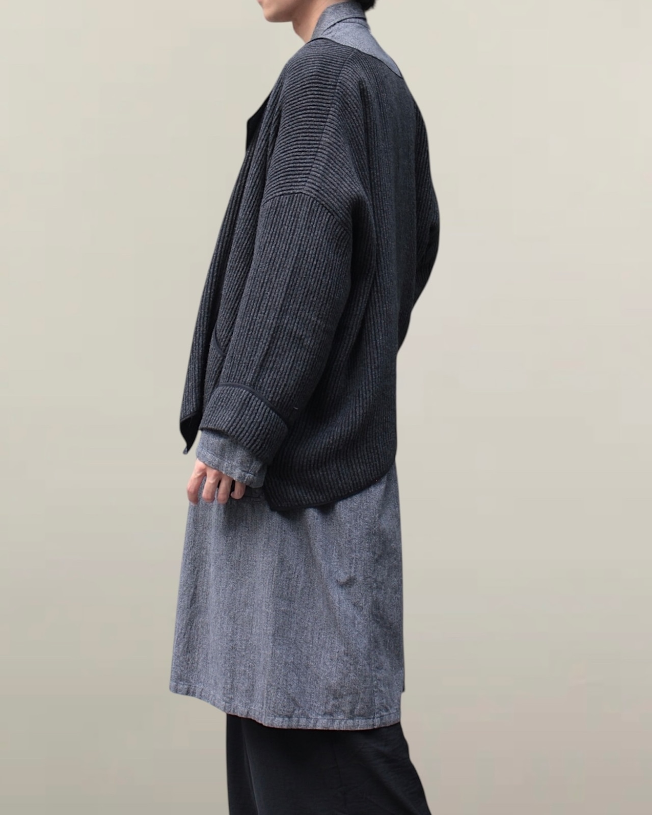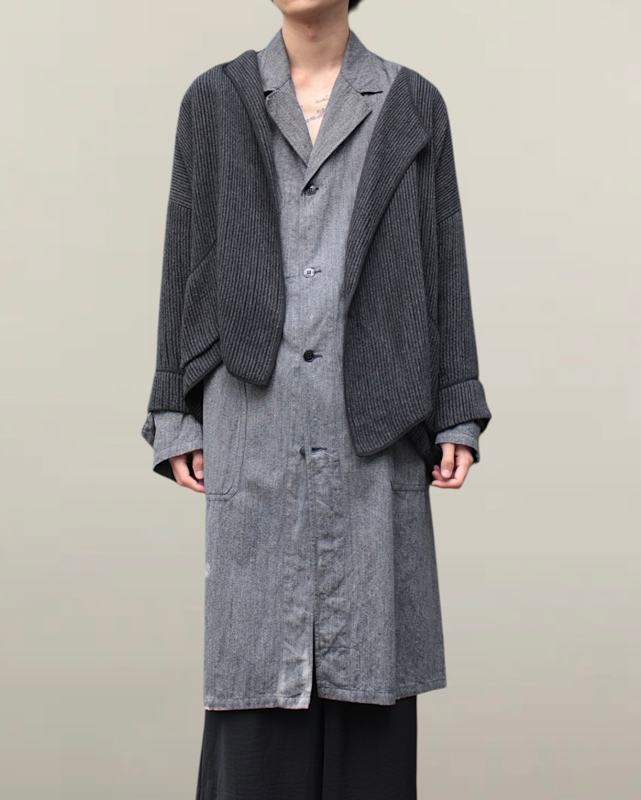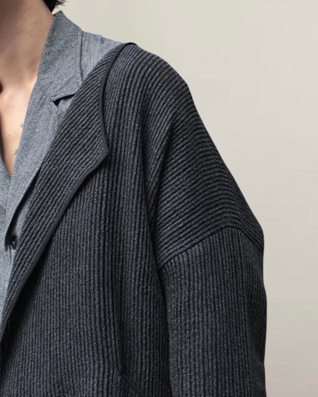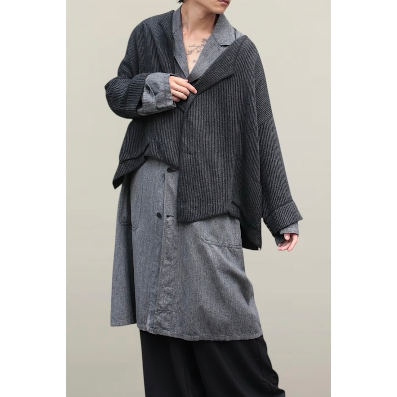 大きな身幅に半円のようなパターン、ボタンレス仕様のラフな一着。