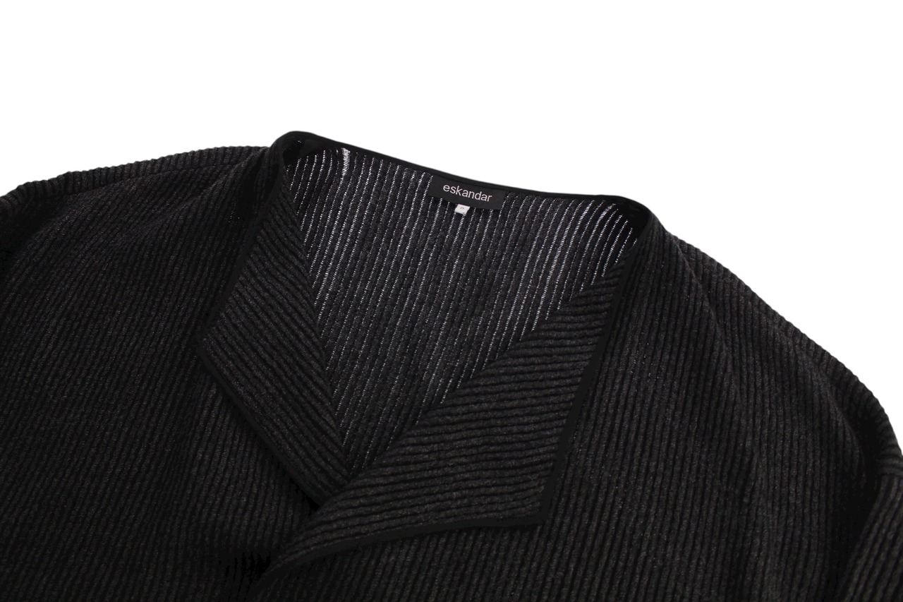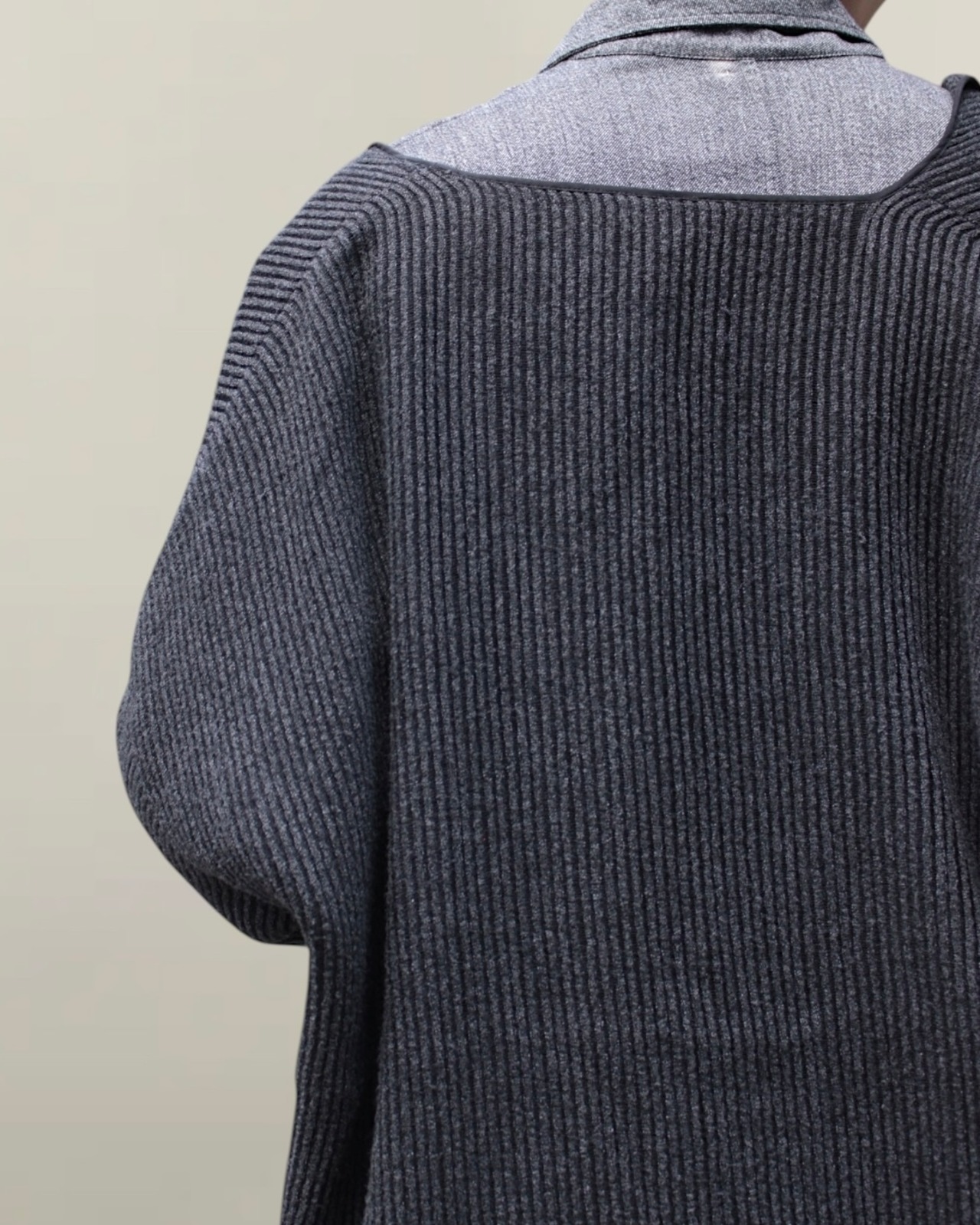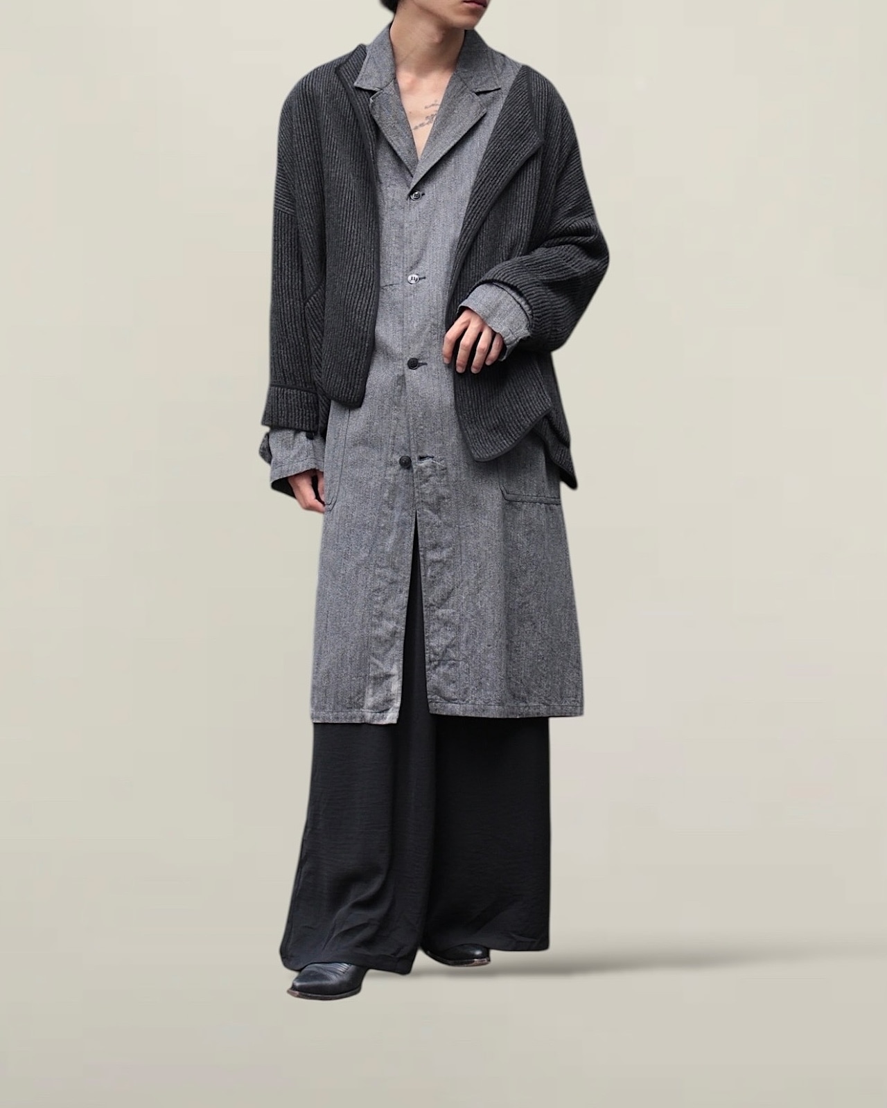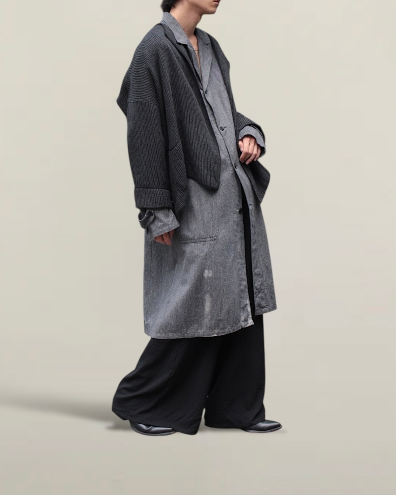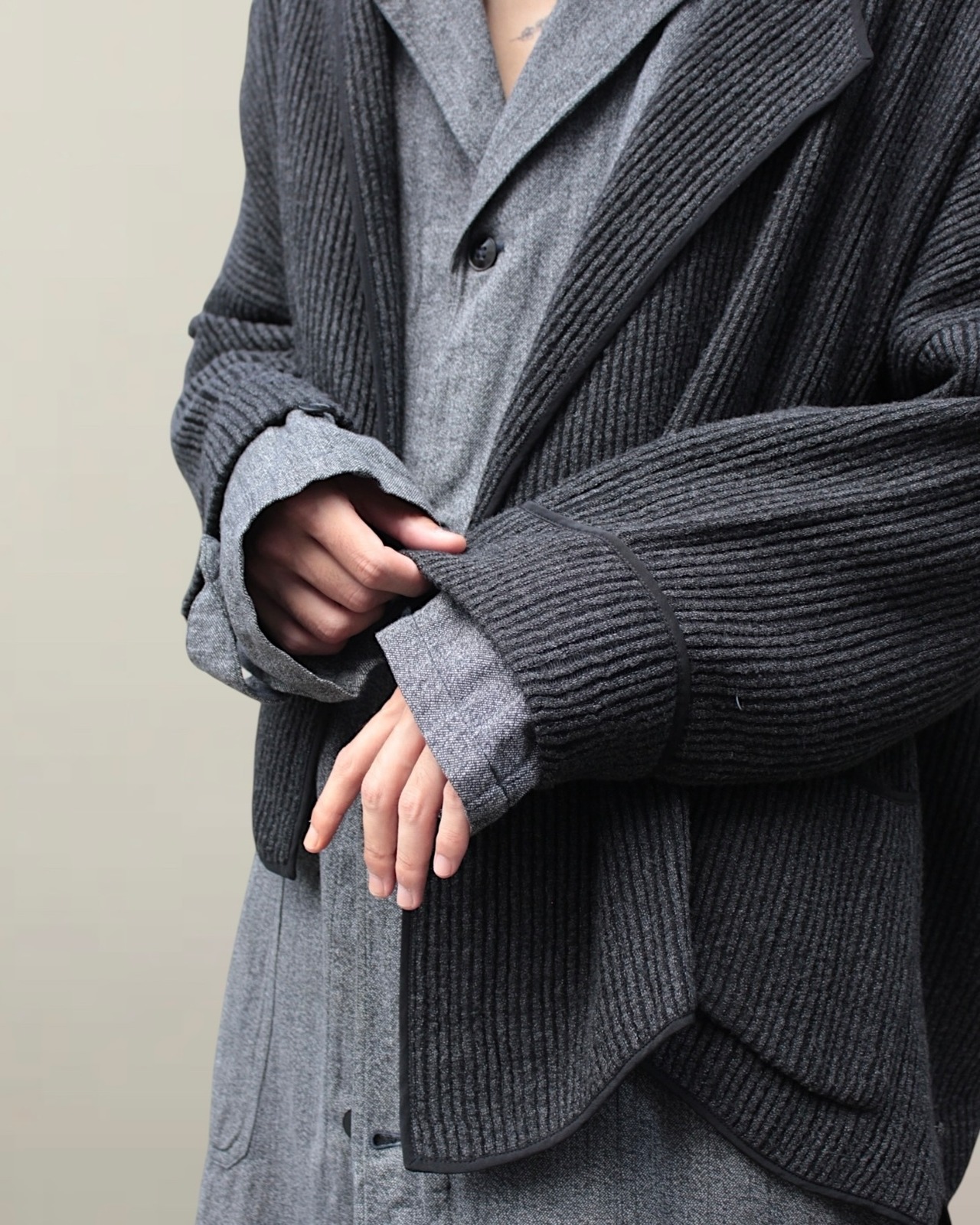 大きな身幅に半円のようなパターン、ボタンレス仕様のラフな一着。