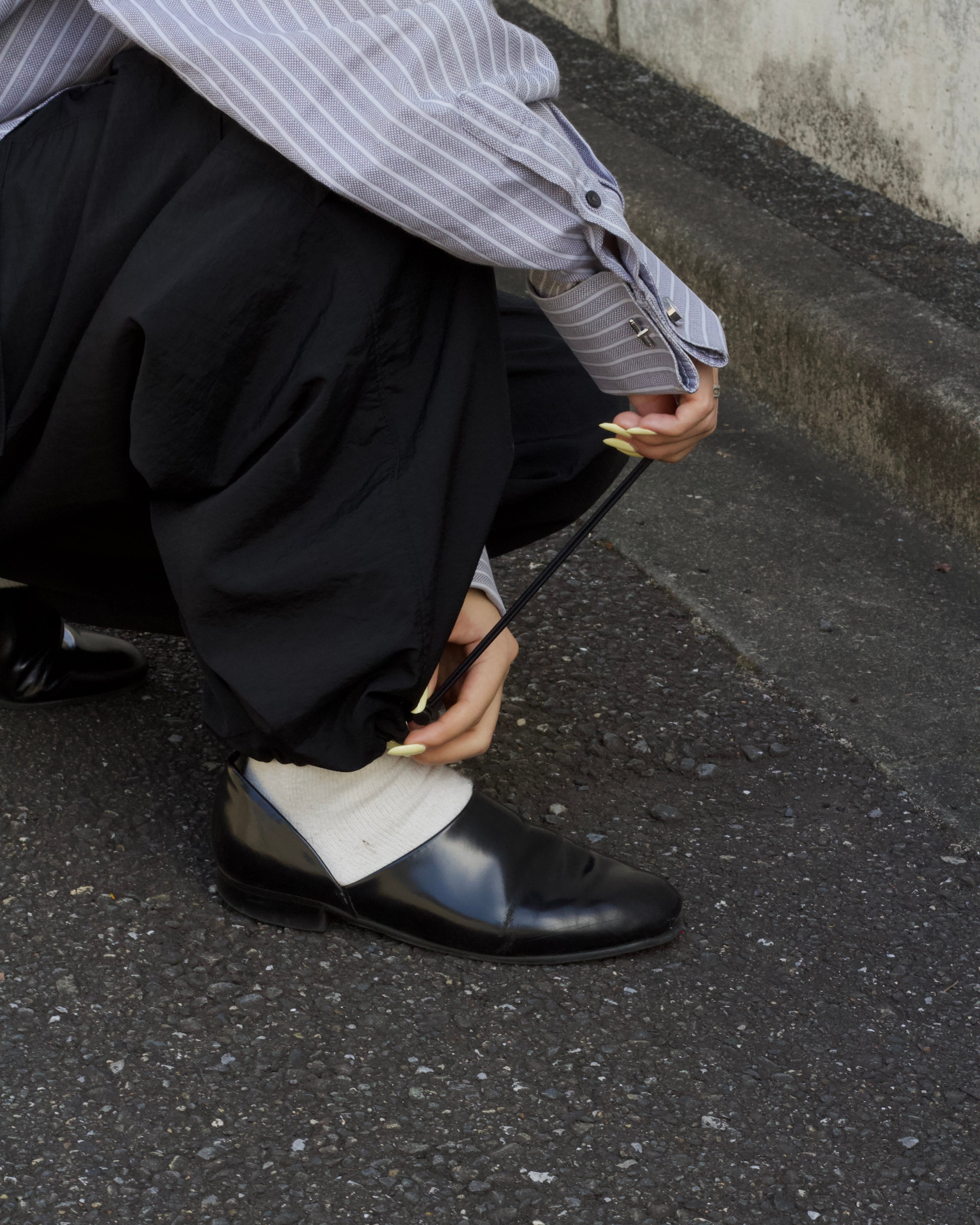 裾までズドンと落ちるワイドストレートの綺麗なシルエットで,裾のドローコードで絞って変化をつけて履くことも可能です!