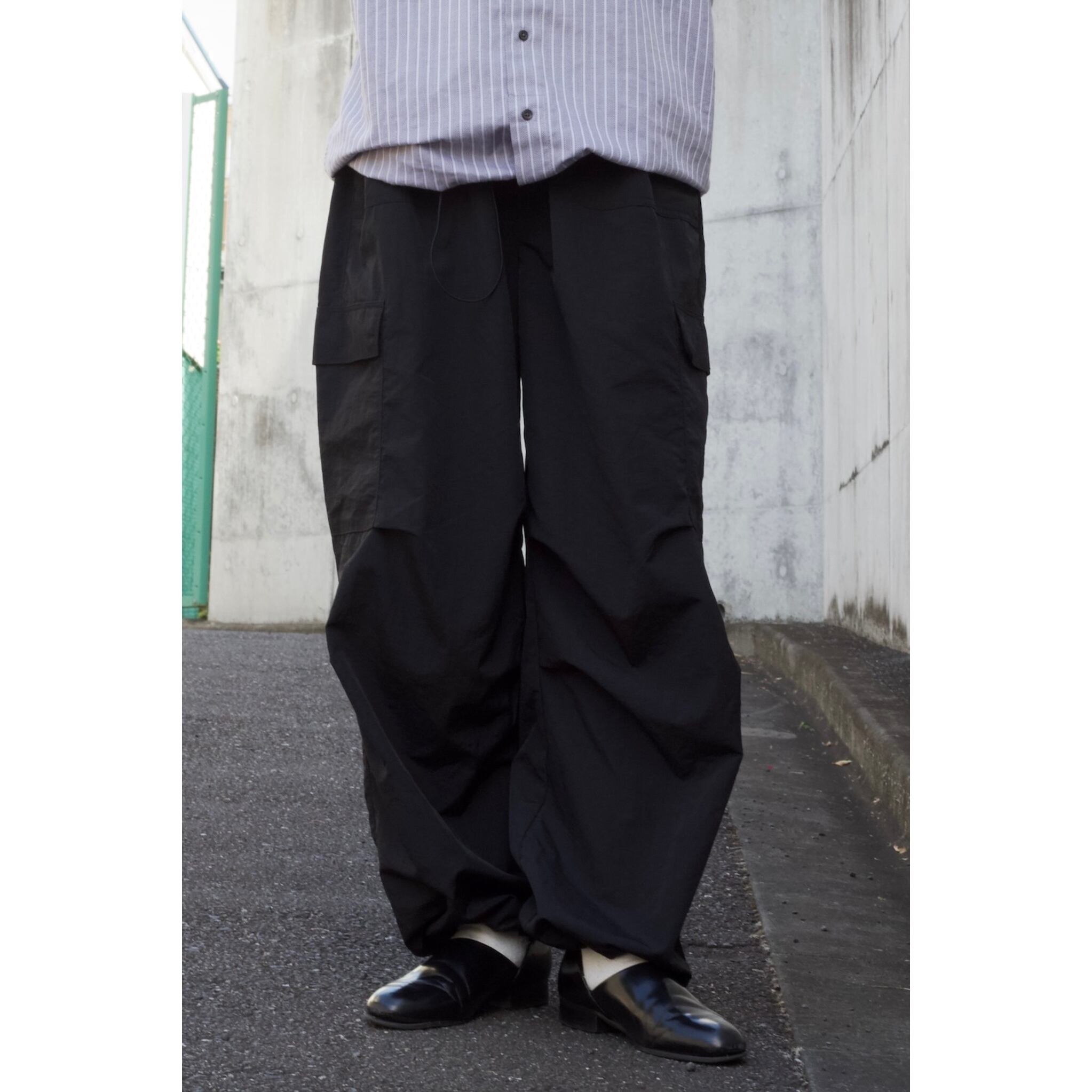 ナイロン100%のテック生地のワイドイージーパンツ。ウエストゴム&ドローコードでノンストレスで着用できる,あるとなにかと履いちゃうパンツ。