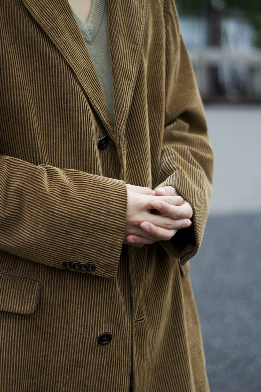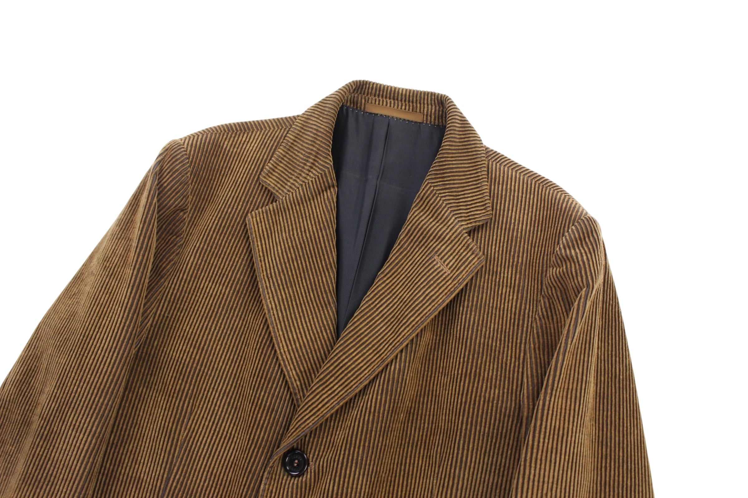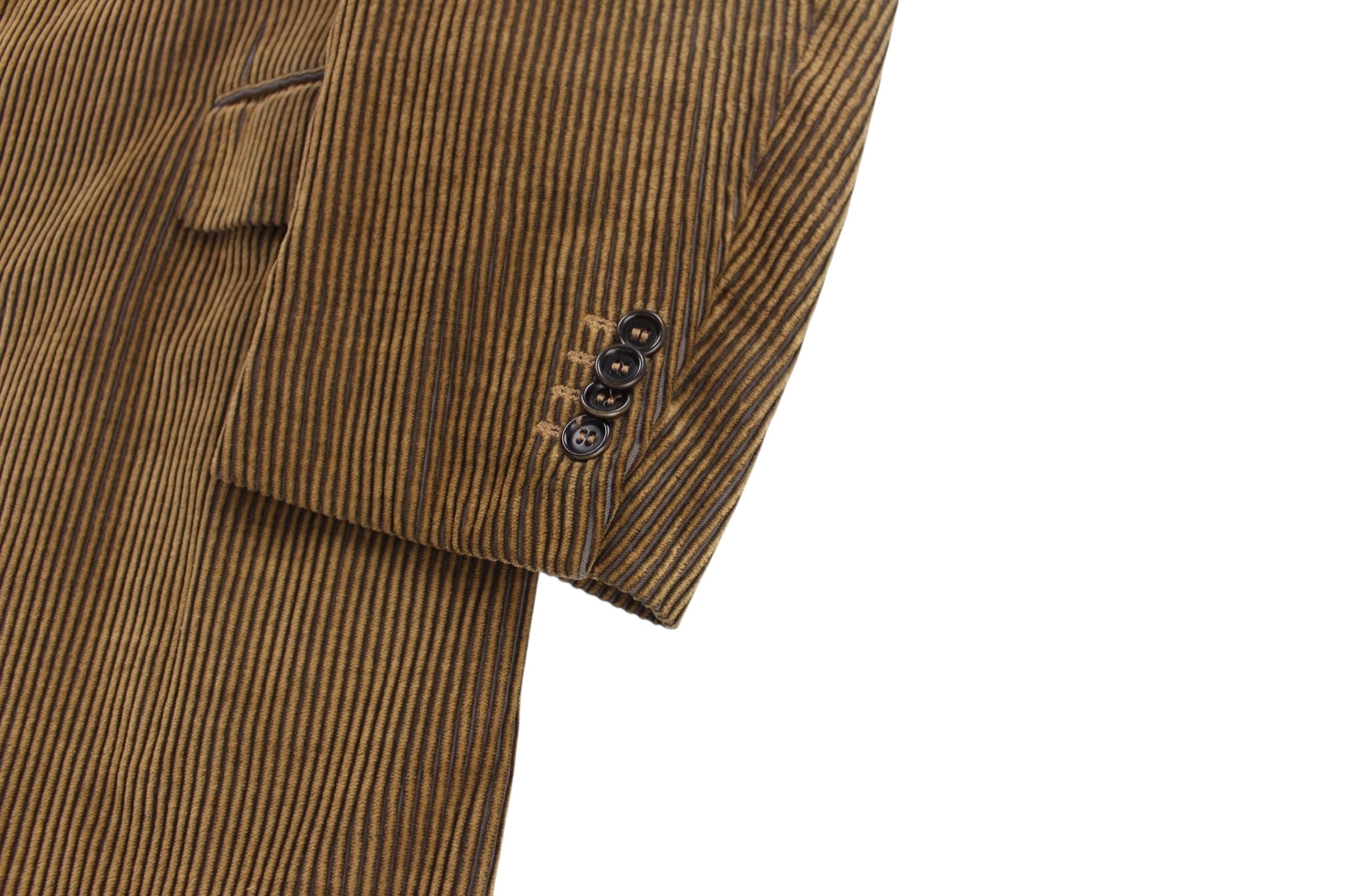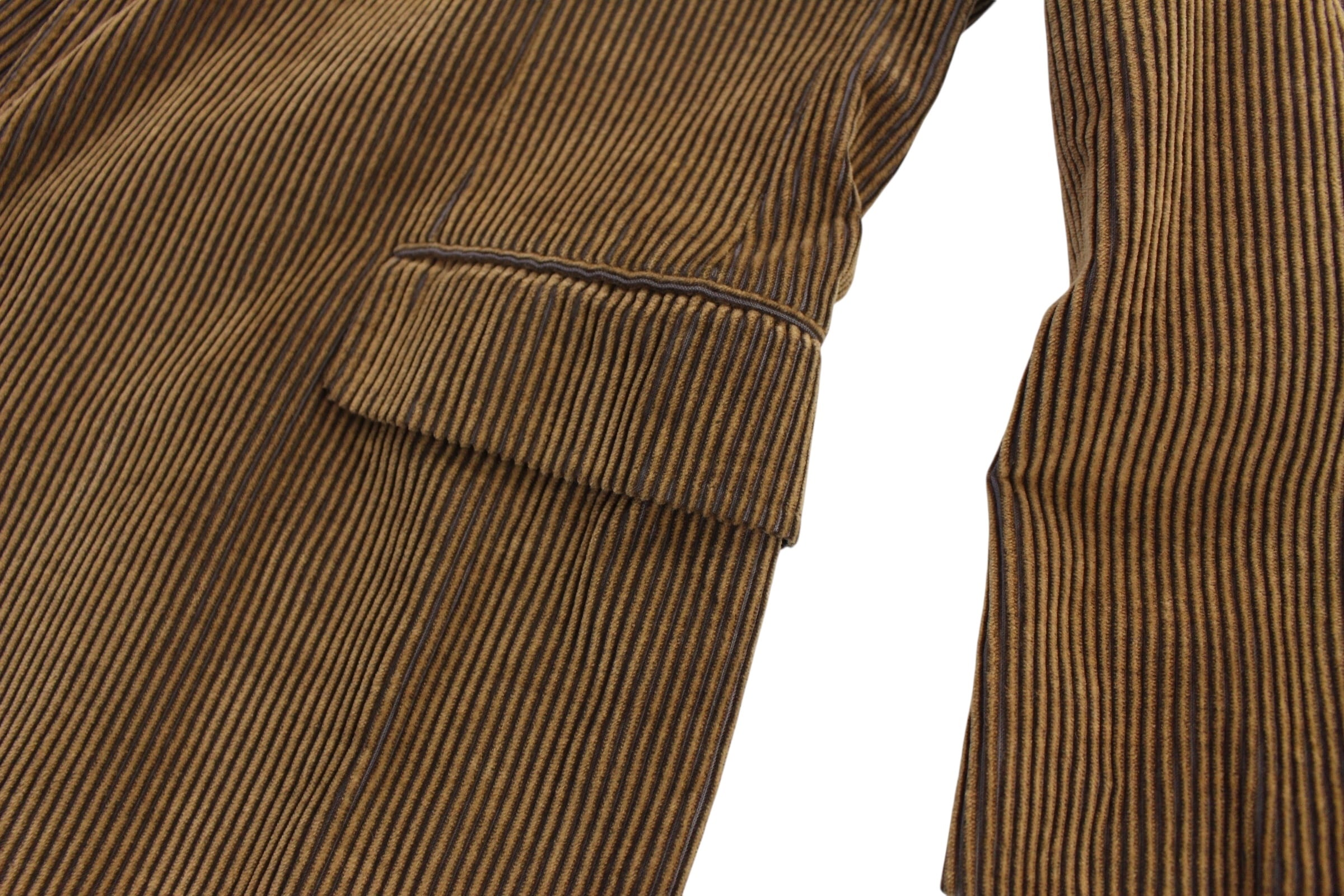 ブラウンの温もりと知性が共鳴するように、クラシックなテーラリングと柔らかな光沢を放つ太畝のコーデュロイが絶妙に溶け合う1着