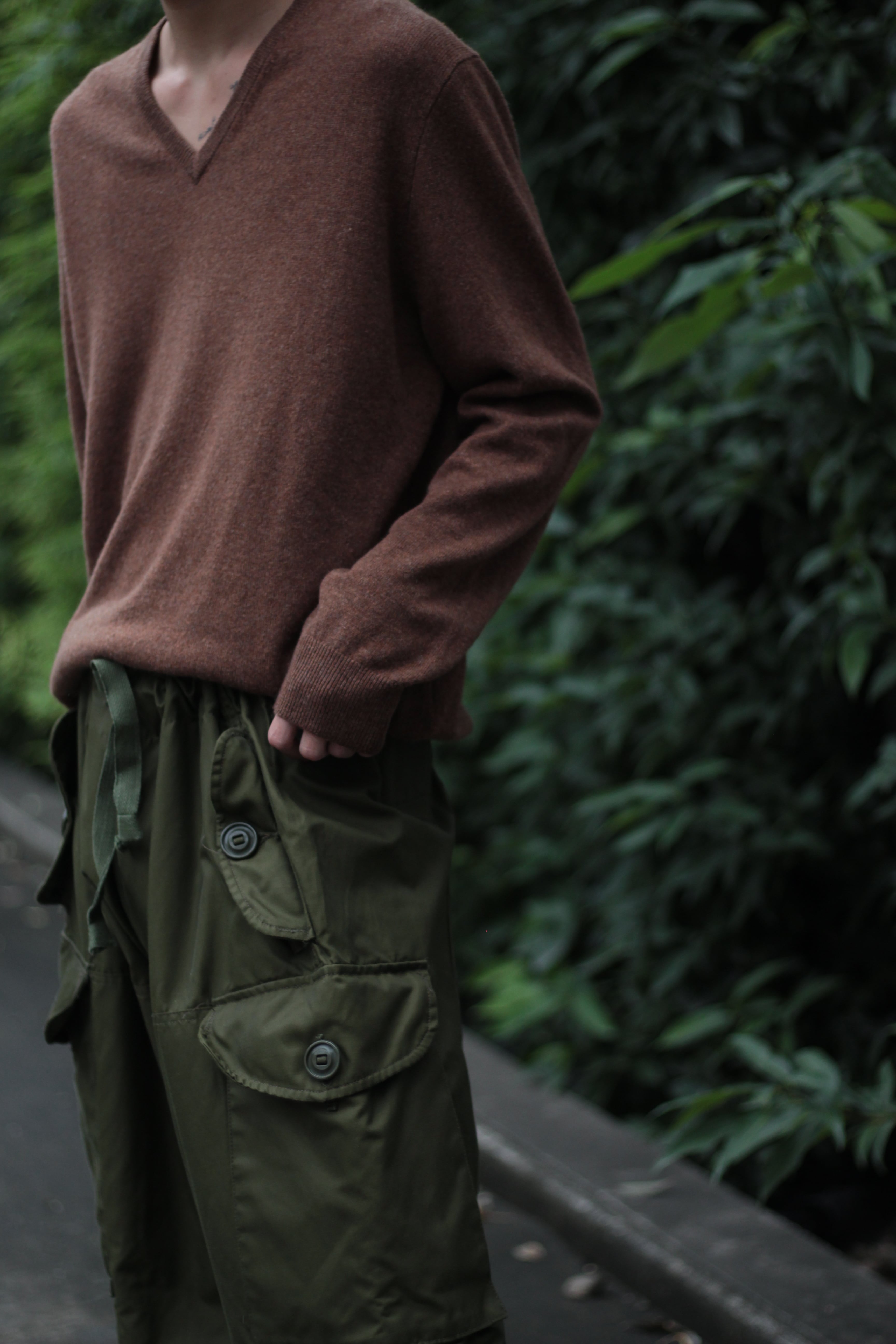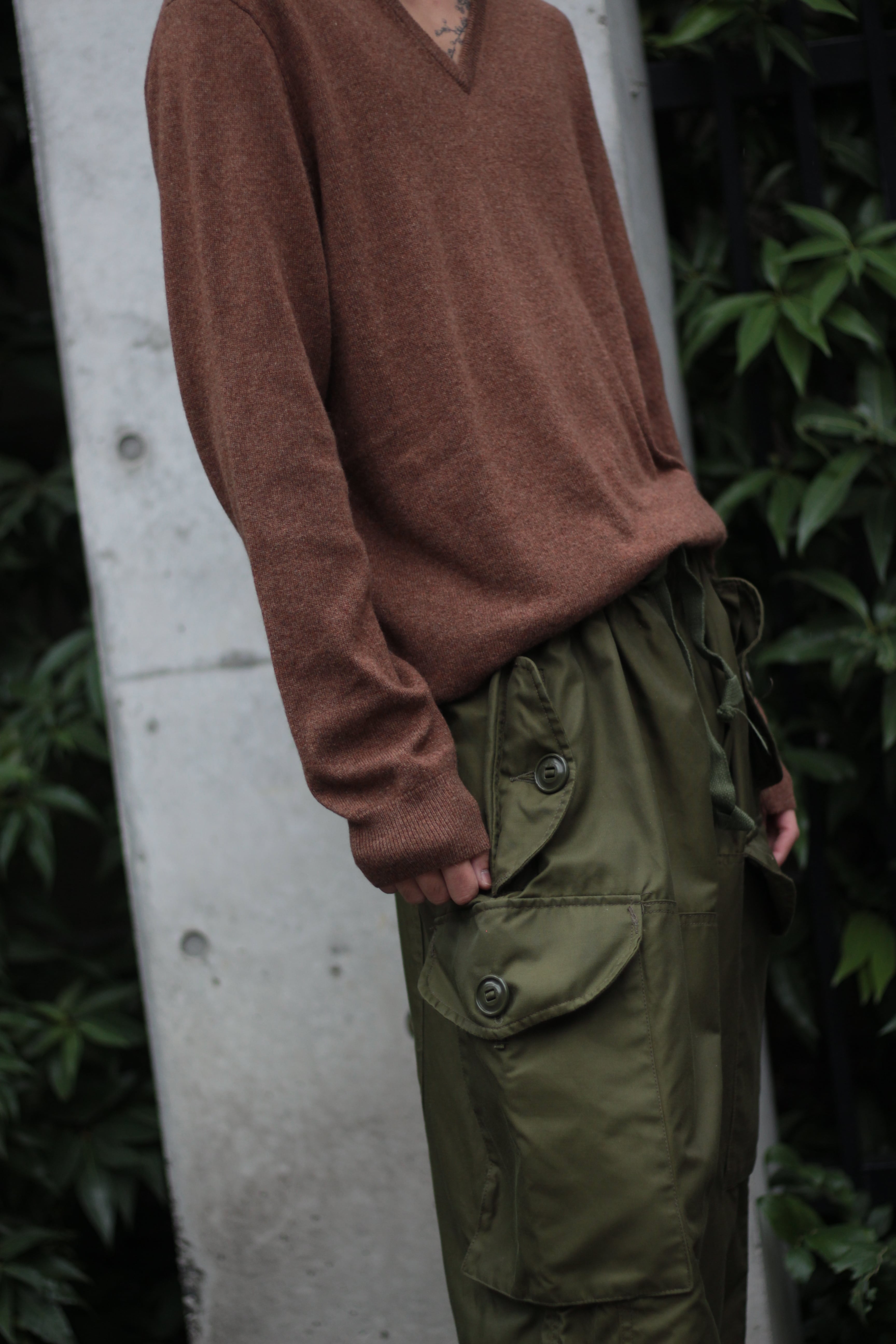 探すと意外とない深みのあるブラウンカラーに程よい抜け感をだすVネックタイプ。