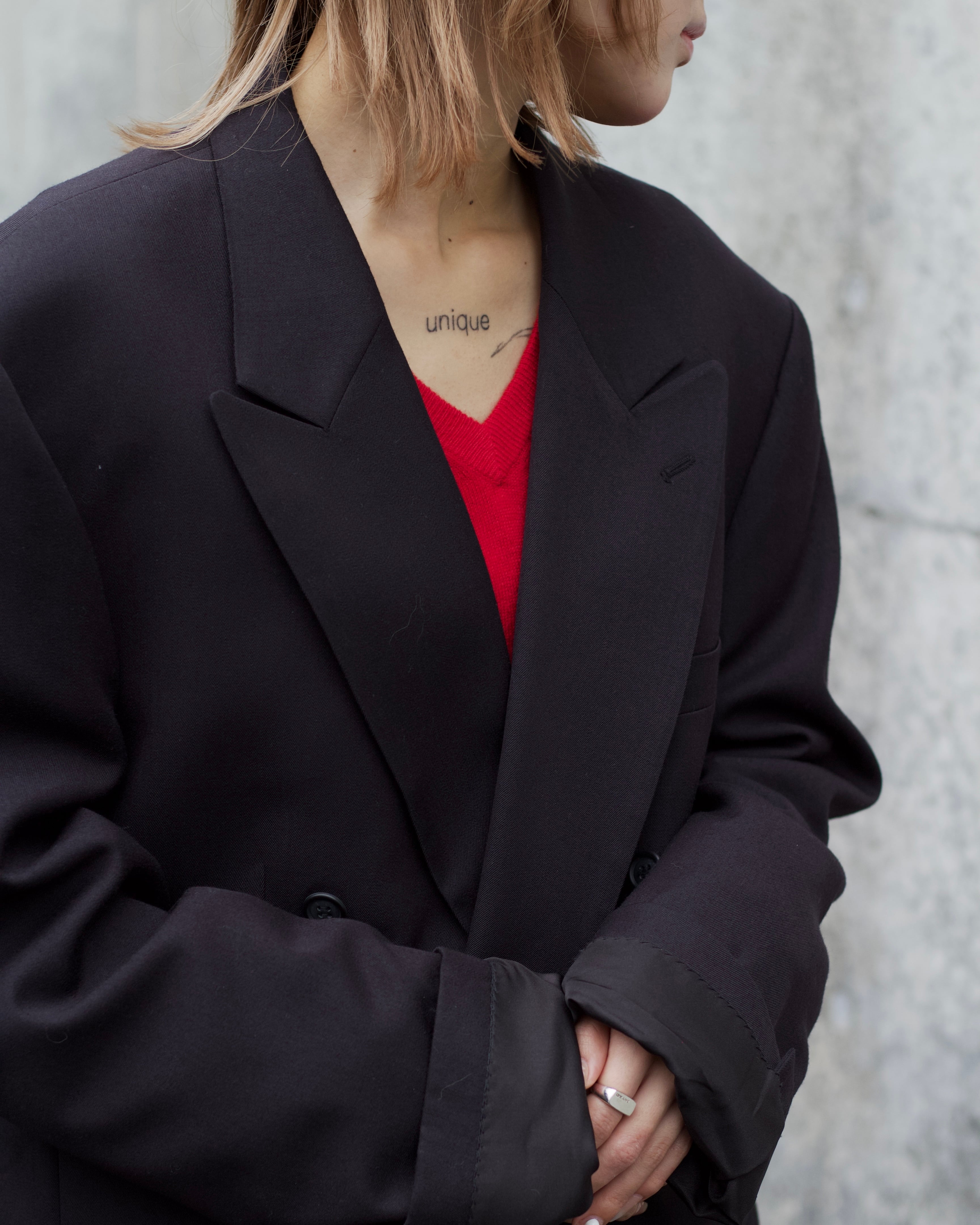 ダブル仕様ならではの存在感があり、フォーマルからモードスタイルまで幅広く活躍。