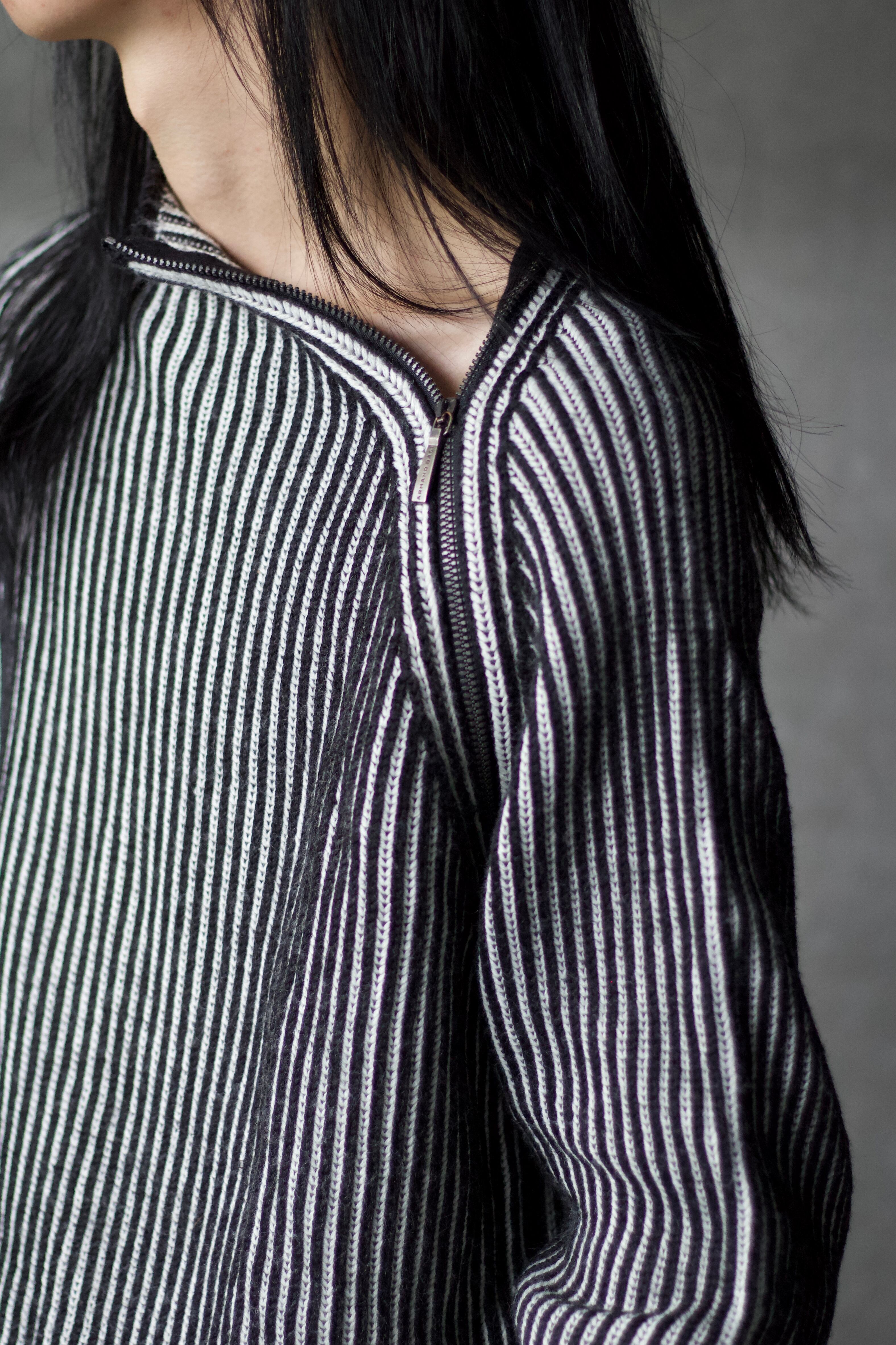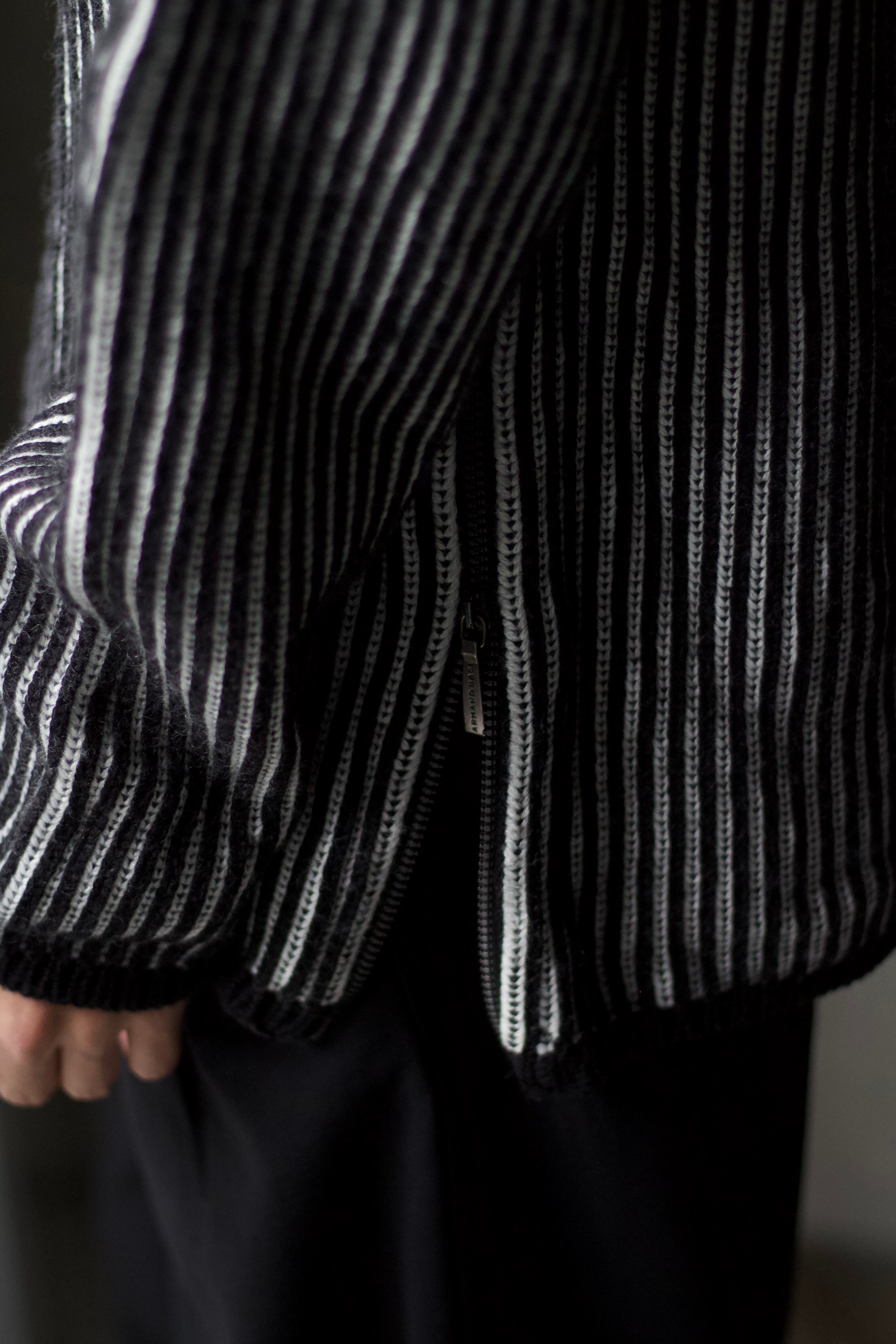 カラーリングも白黒のシンプルな一着。ギミックは聞いているが、総合的に落ち着いたニットの印象があります。