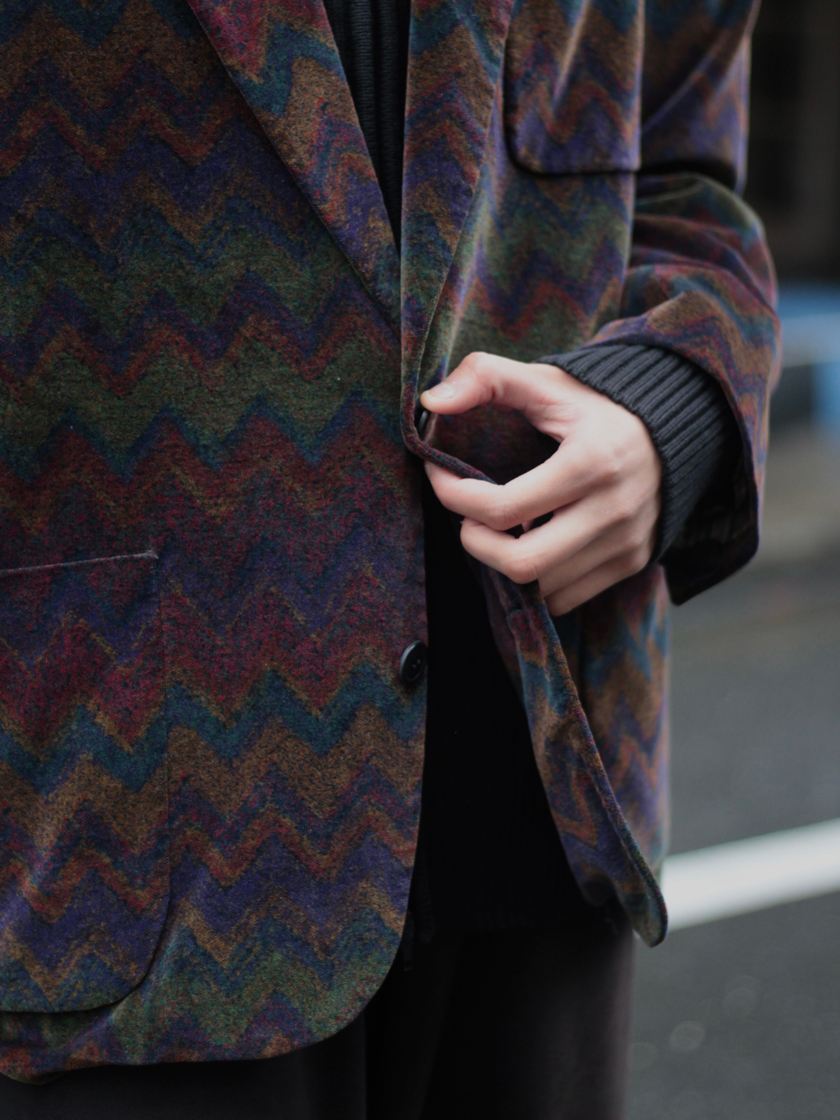 ベロア地の表面がすごく滑らかな手触りに日のあたりによって見せるラグジュアリーな光沢が非常に上品な印象で、表面のシェブロンストライプという山柄が一面にデザインされており、ランダムに配色されていますが、全体的にトーンが統一されてまとまりを感じられる、まさにアートな一着◎