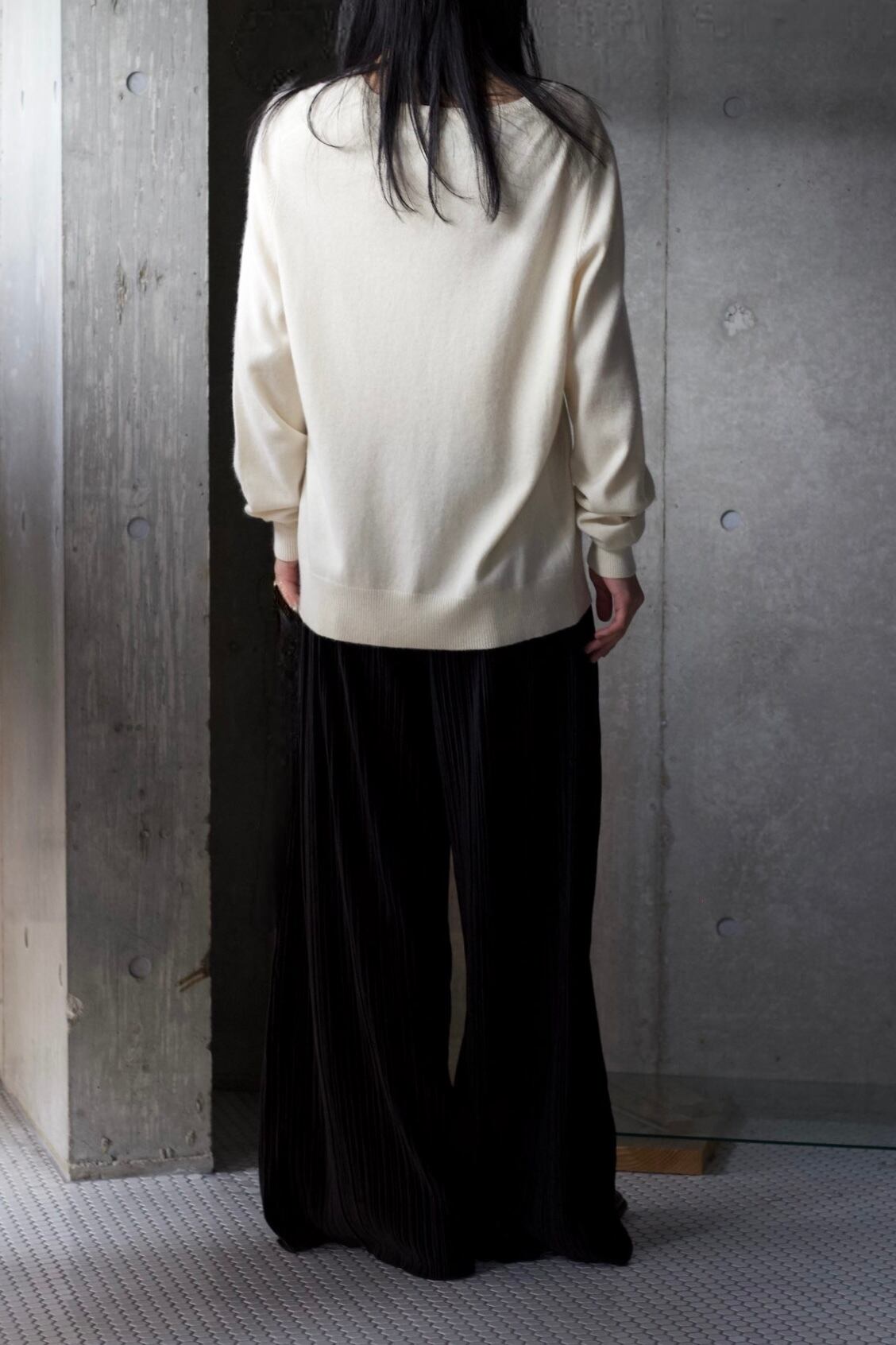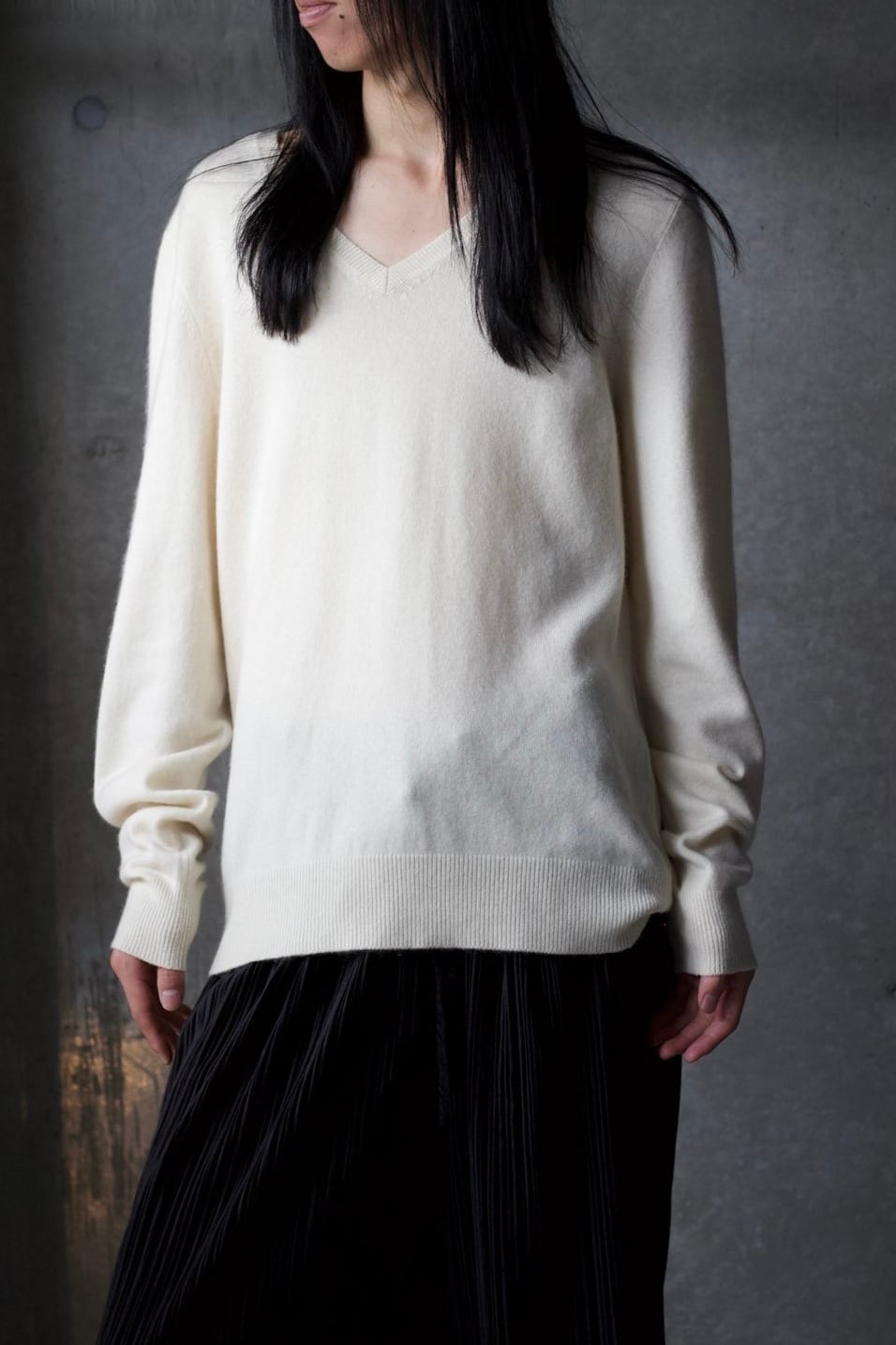 vネックなので、首元にネックレスやシャツのレイヤードを楽しめます。