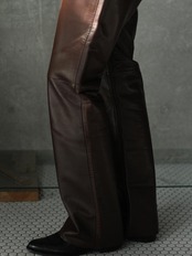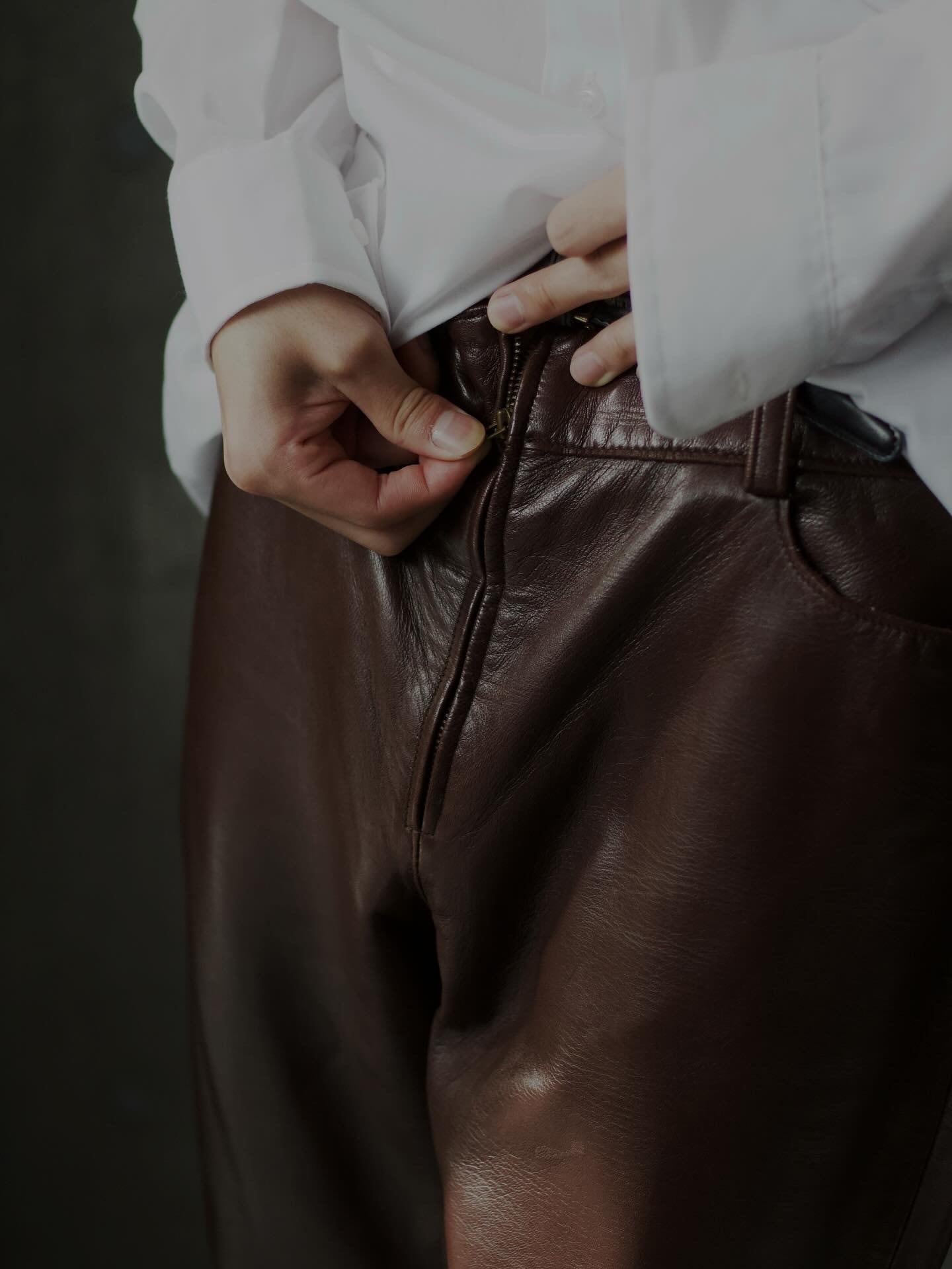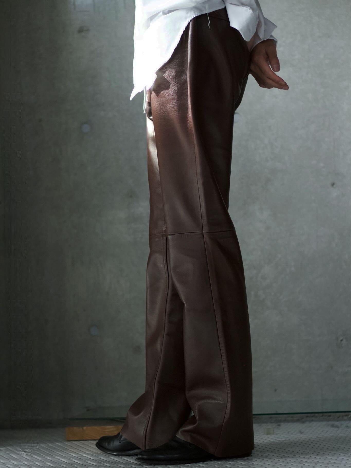 レザーパンツってどこか男臭い印象がありますが、この一着は、上品でドレスな印象です。
