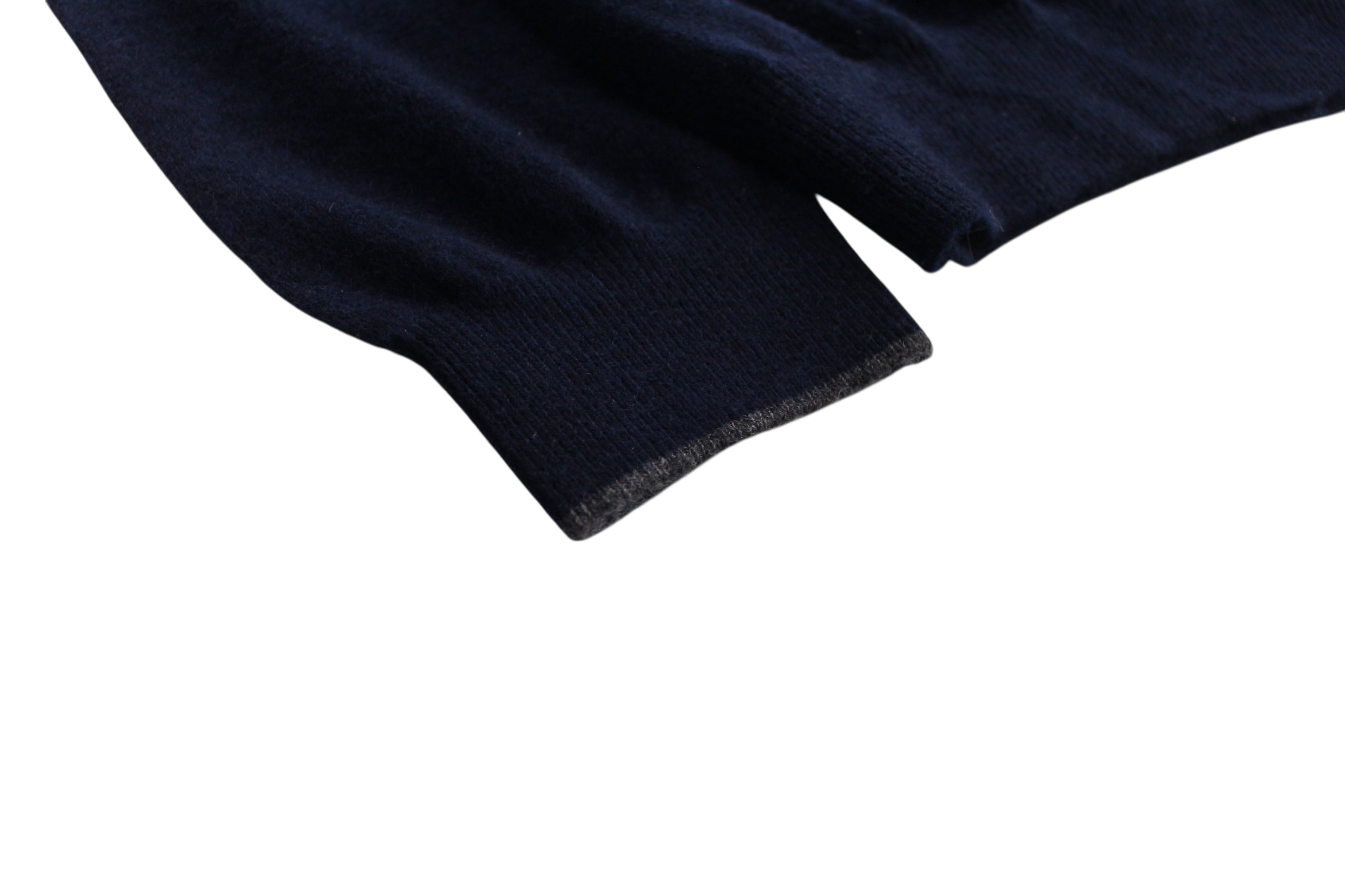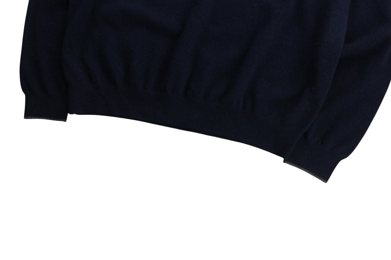 また写真では伝わりづらいのですが、ネイビーのカラーリングになっており、程よい上品さとクラシックさを持っている印象があり、これからの時期に活躍するような落ち着いたニットです。