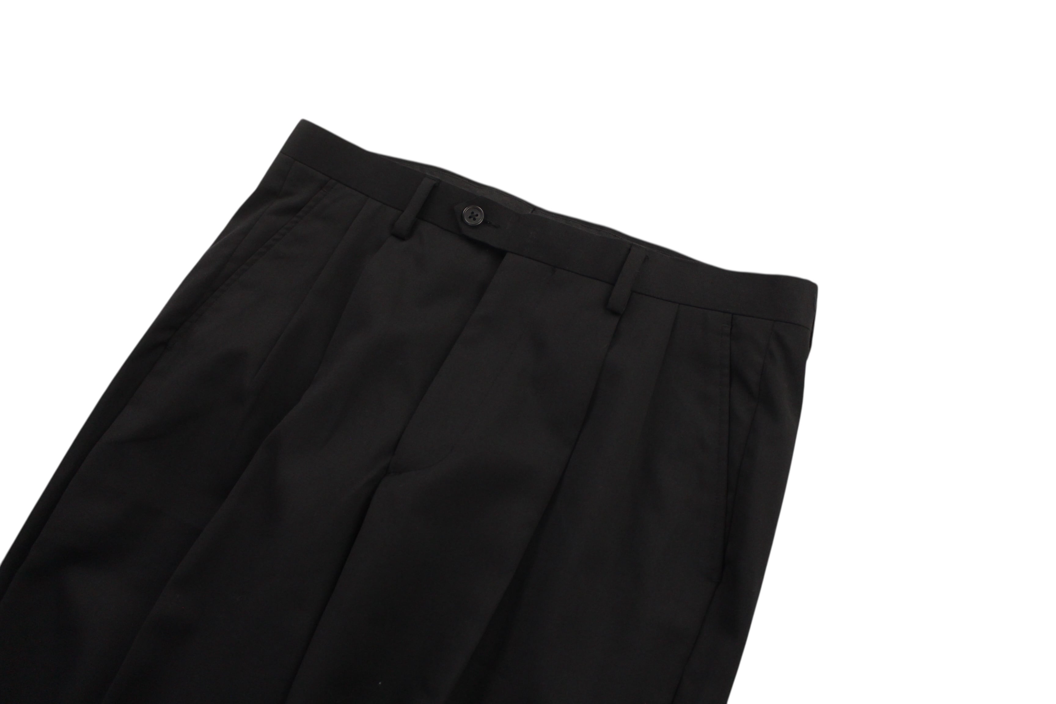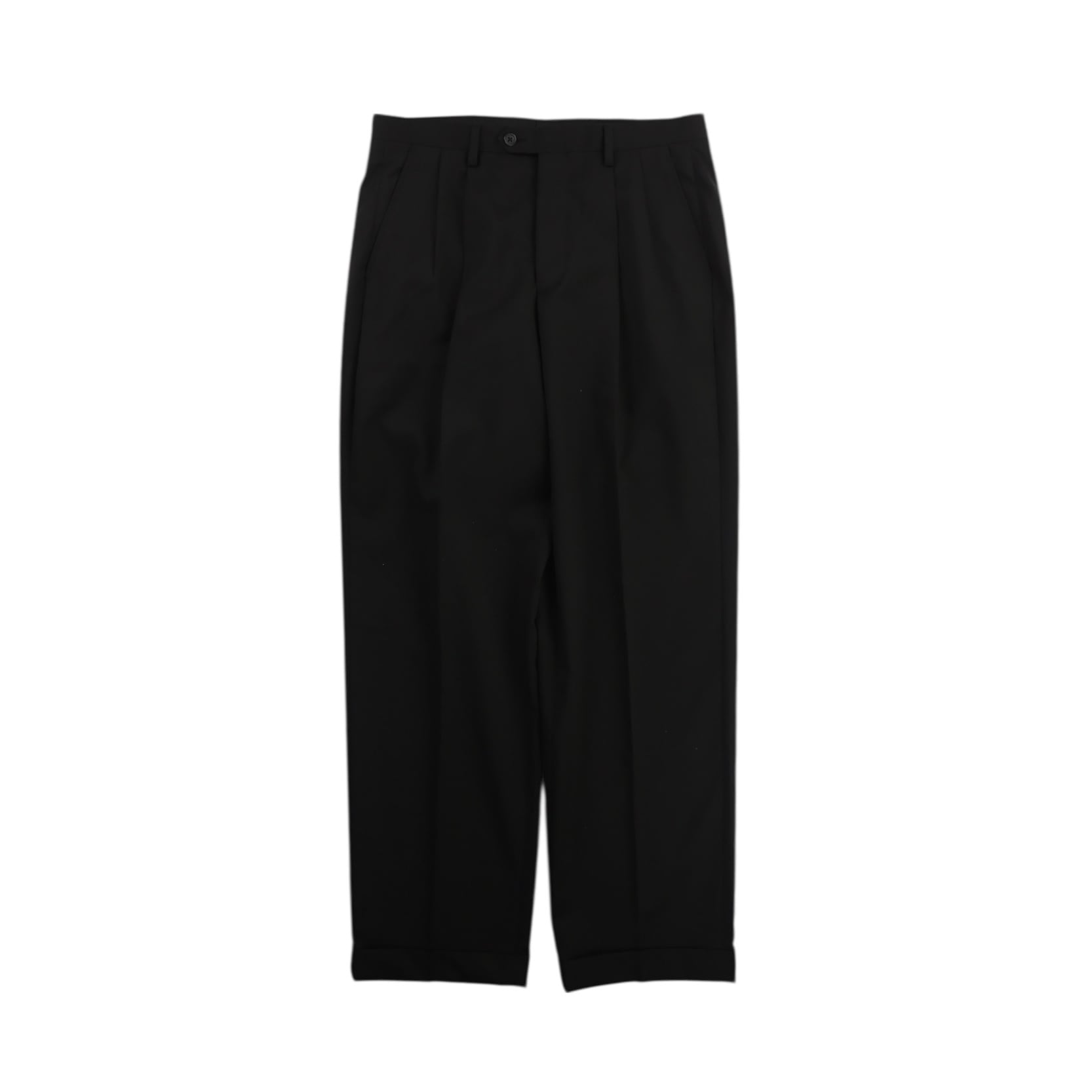 ブラックカラーのモダンな色使いながら、腰回りに2タック入ることで、たっぷり履くことができるワイドシルエット。