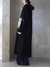 フード付きのロングウールコート。