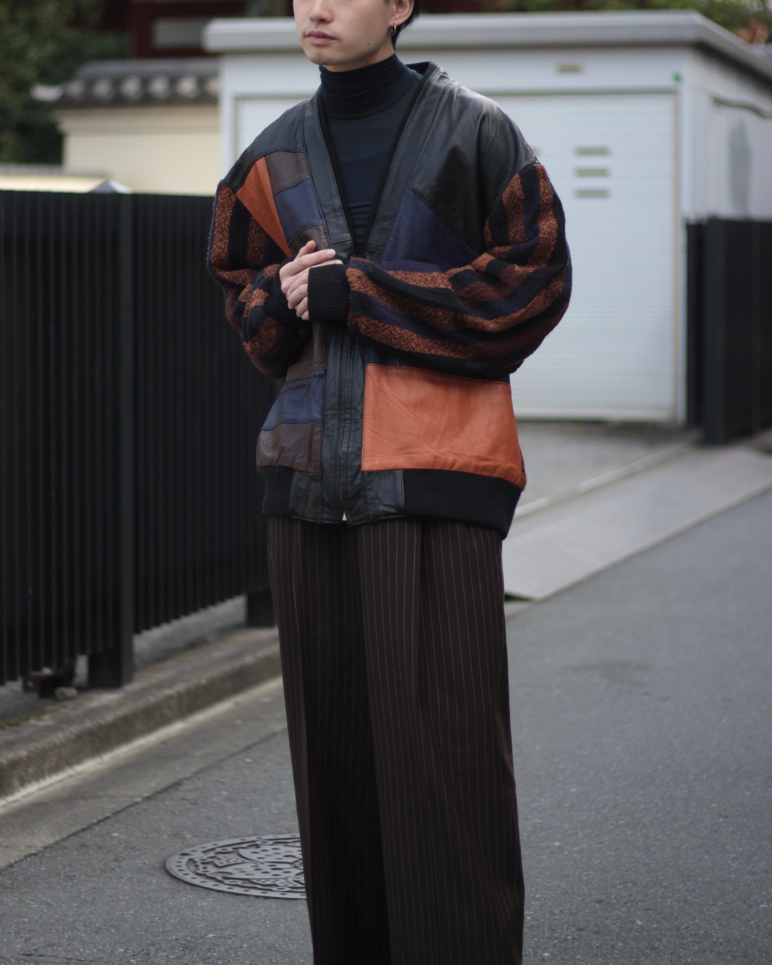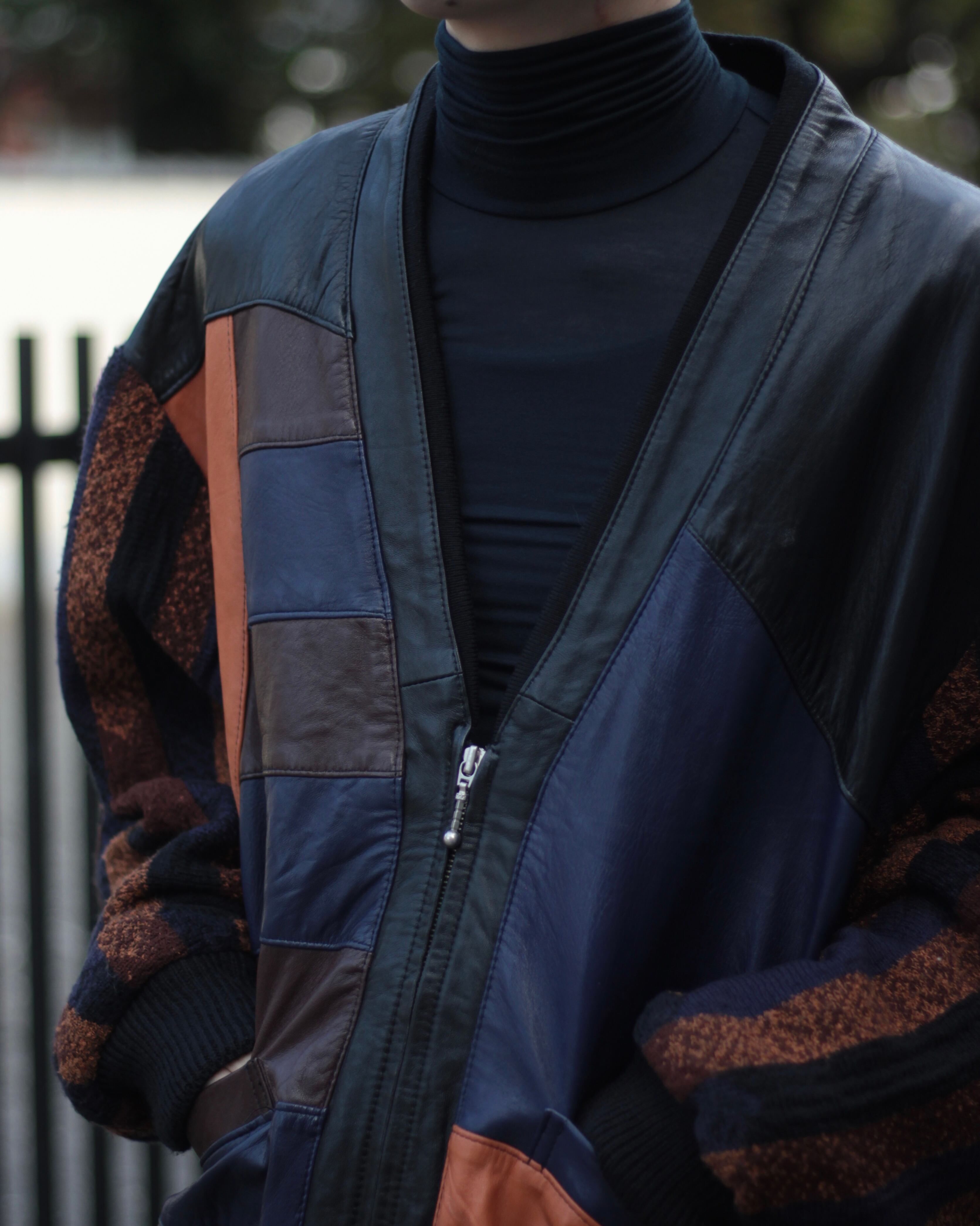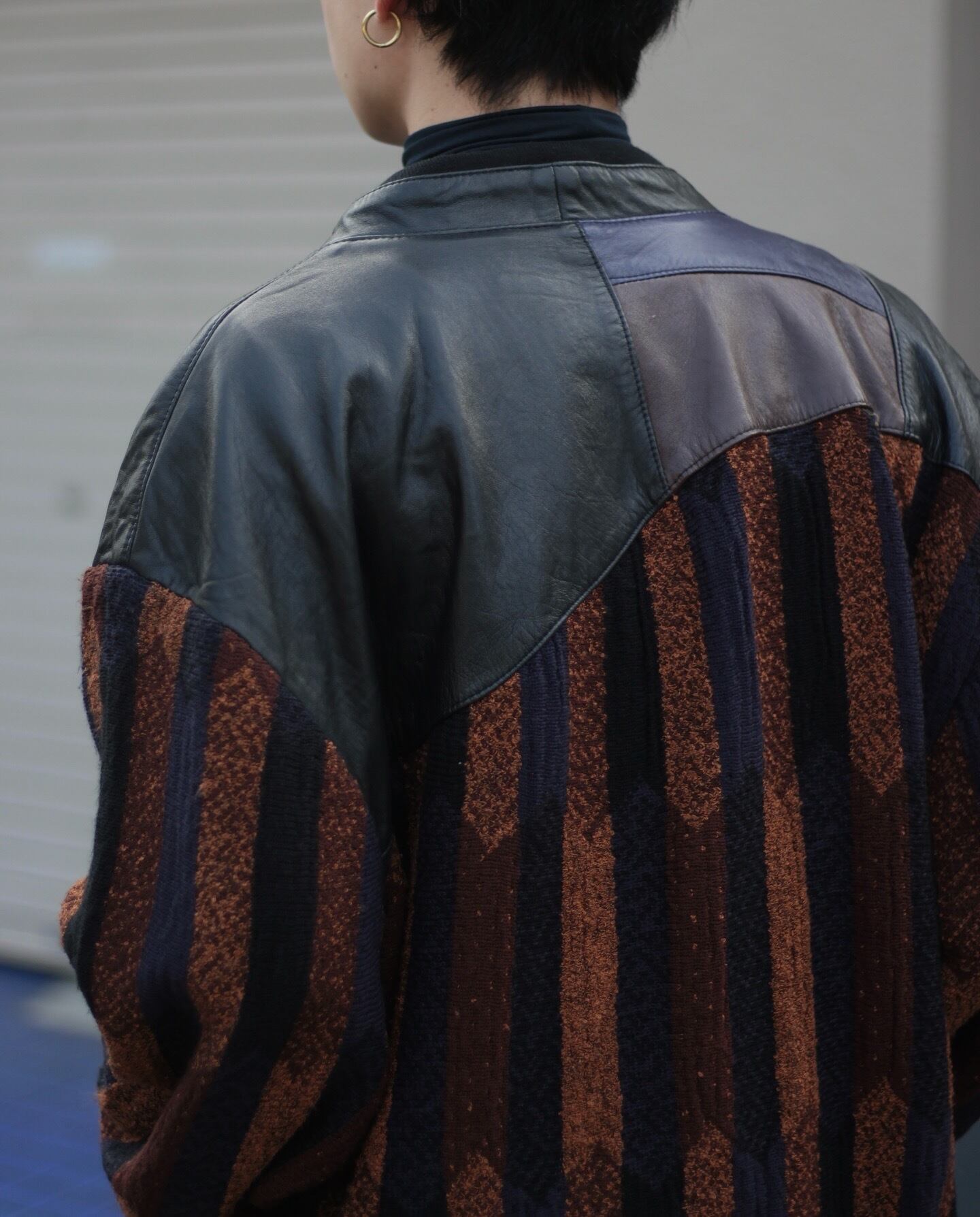 "SAXONY" real leather switching 3D knit cardigan OT-20012