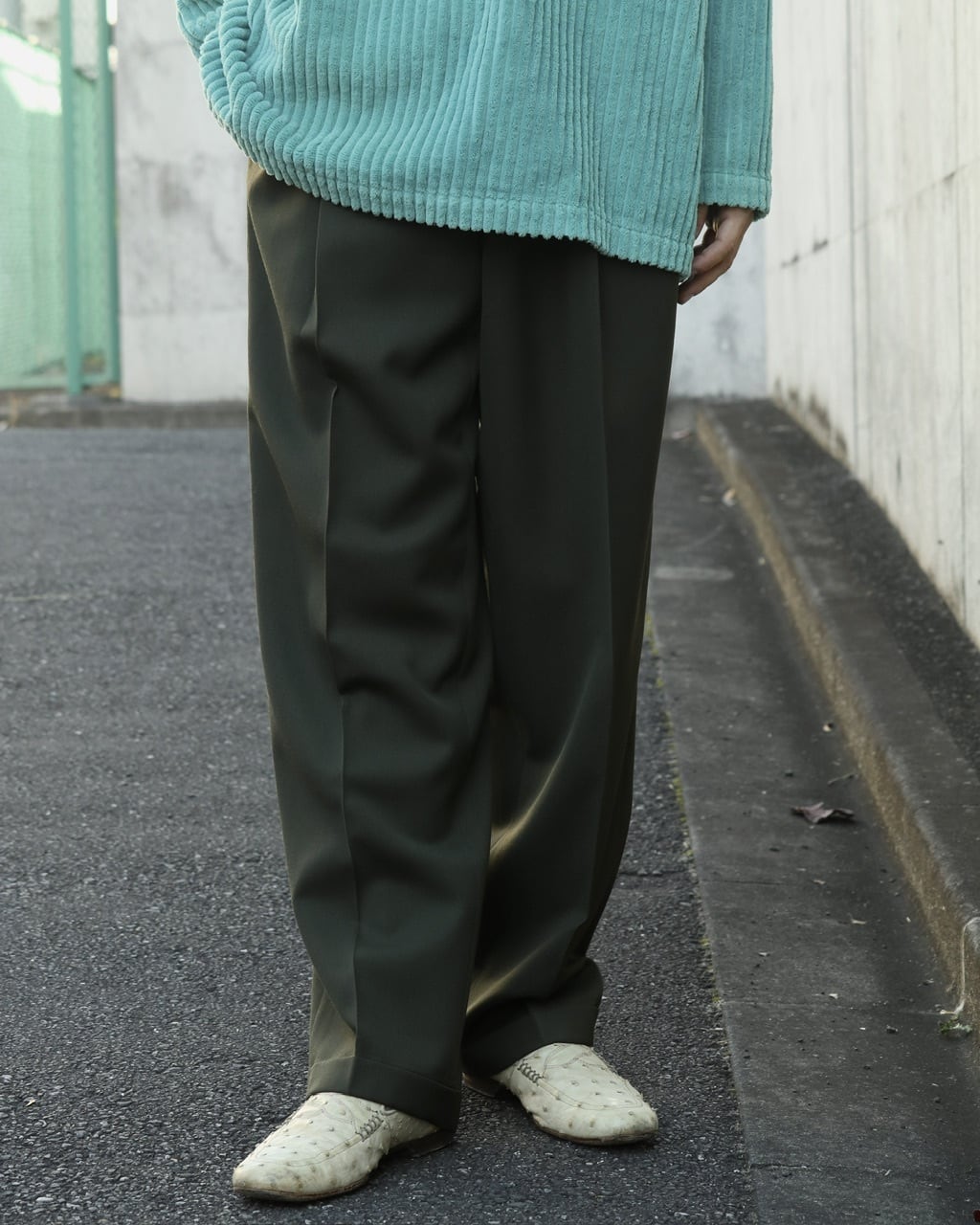 テーパードが少しだけ効いていますが、3タック入っていることで、ワイドになりテーパードが気にならないのでストレートに見えます。