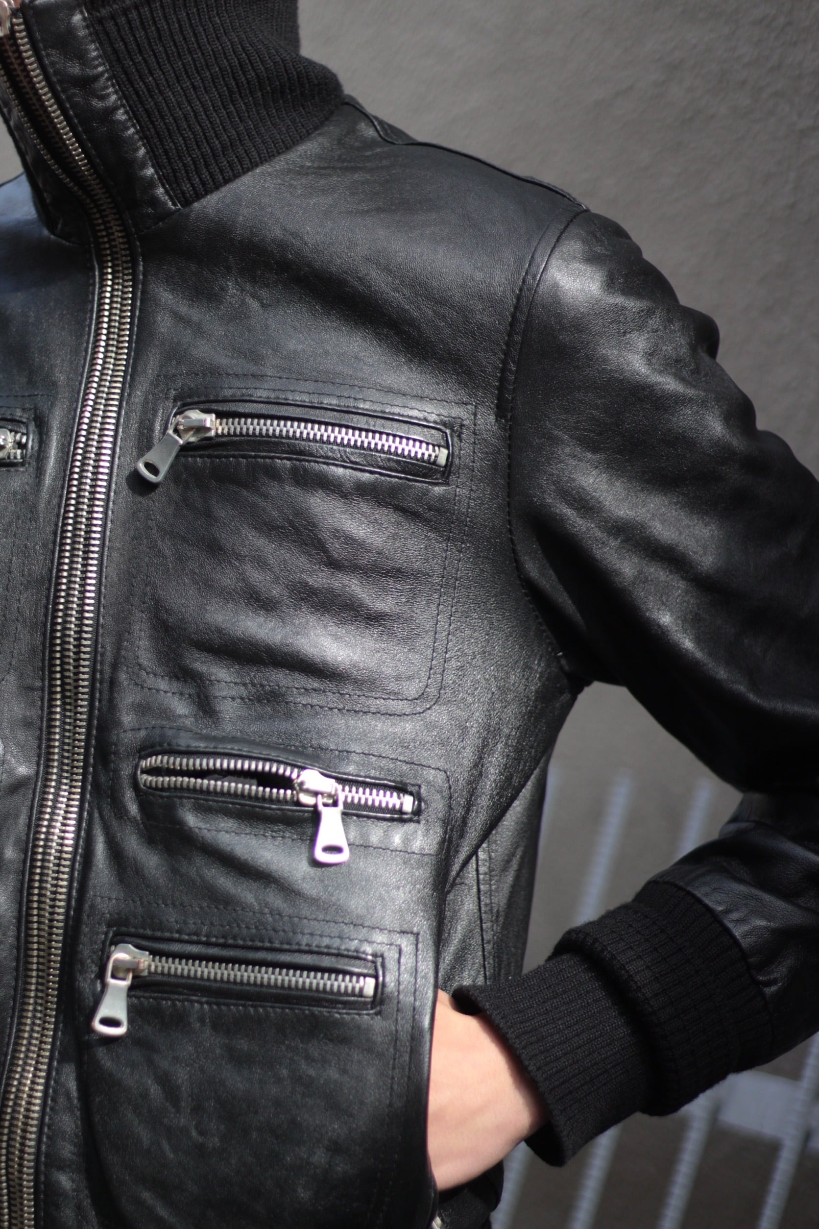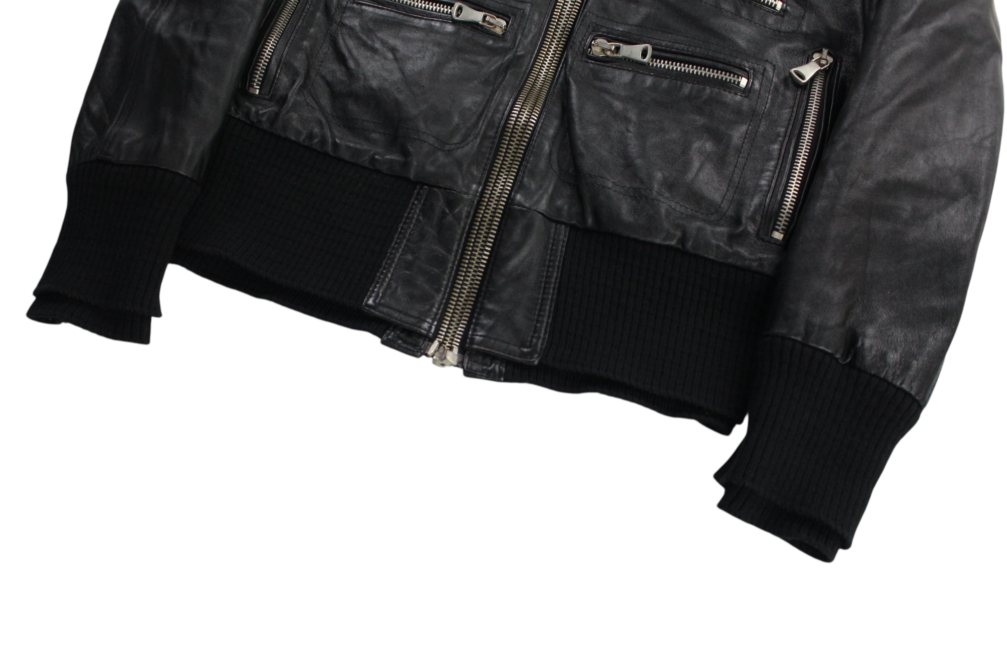 襟と袖口、裾には分厚いリブ編みを使っていてレザーのハードさにニットの柔らかさがミックスしたイタリアンモードらしいアクセント。