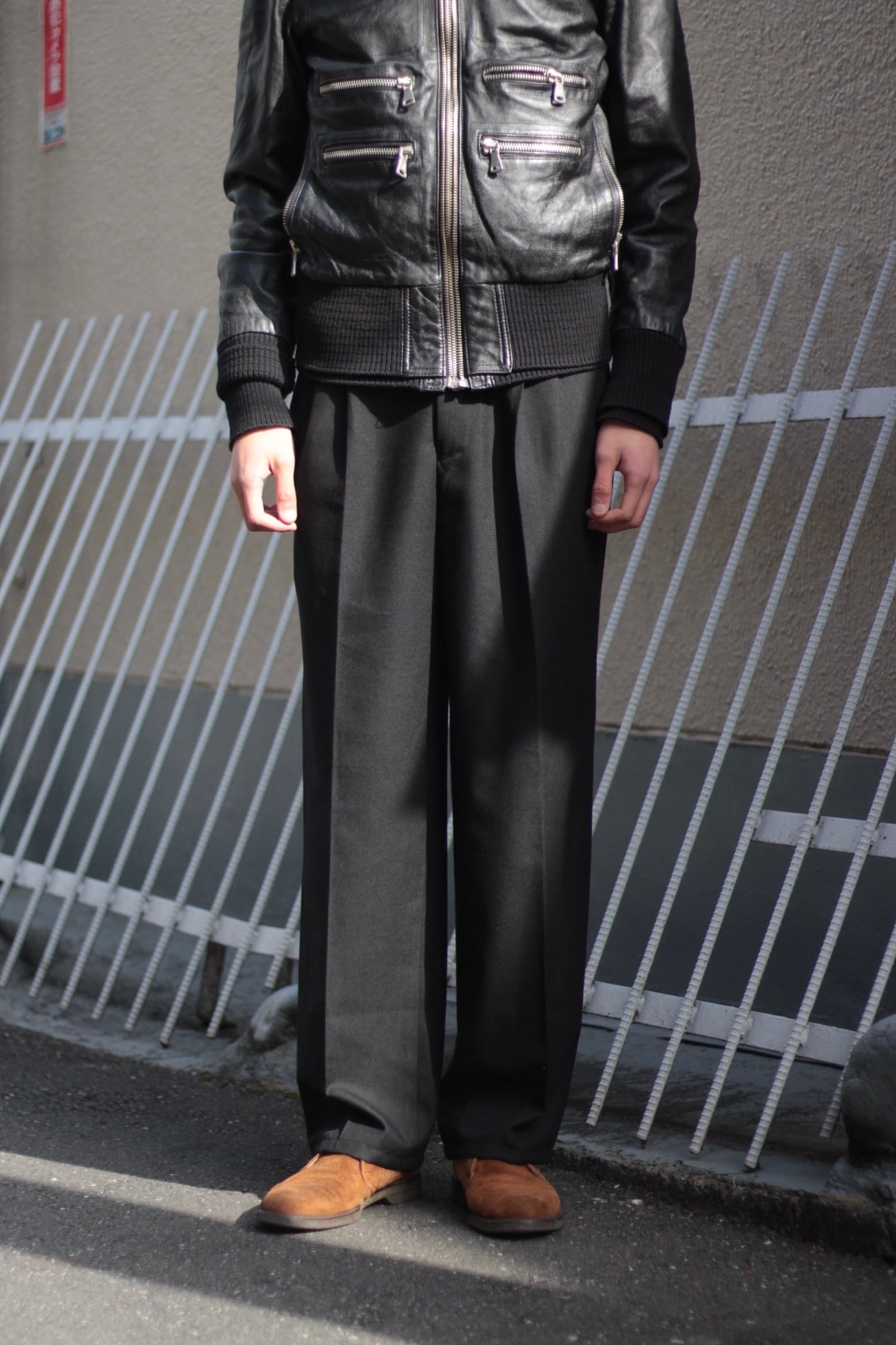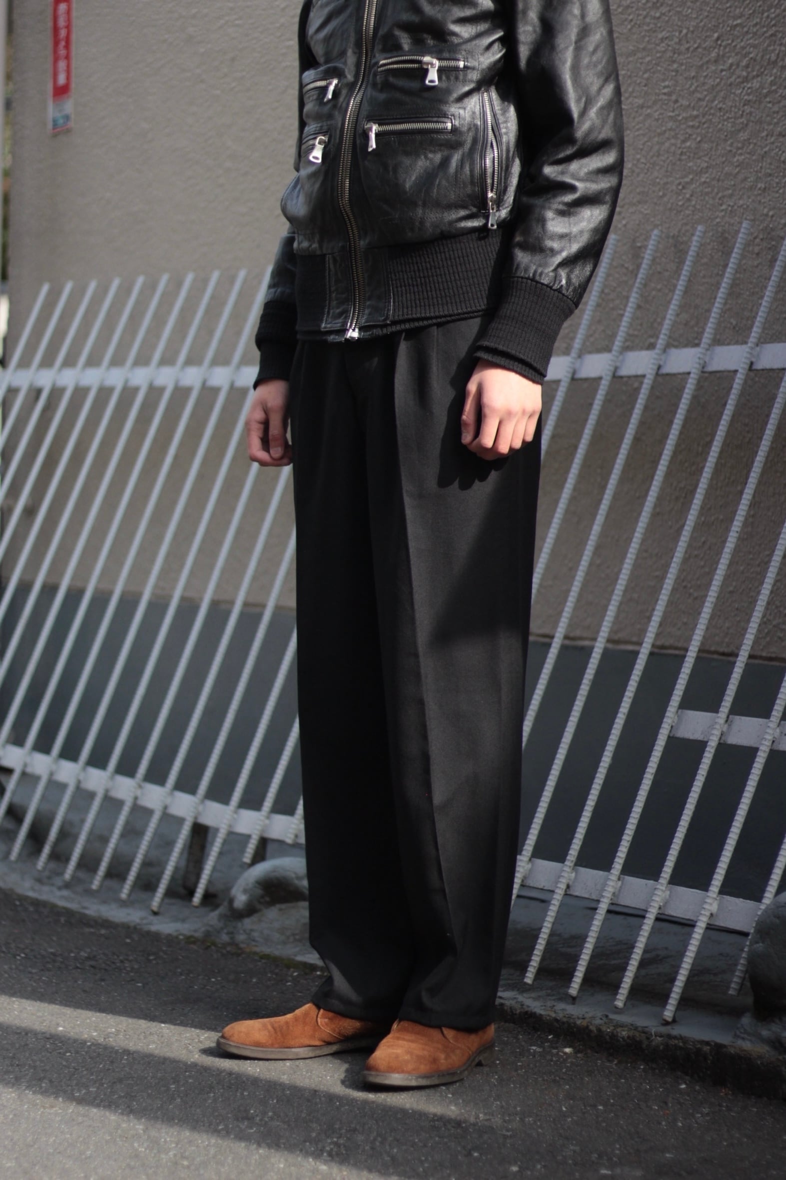 フロントには深めの2タックを入れて適度なゆとりを確保しつつ、シルエットはストンと落ちるワイドストレート。