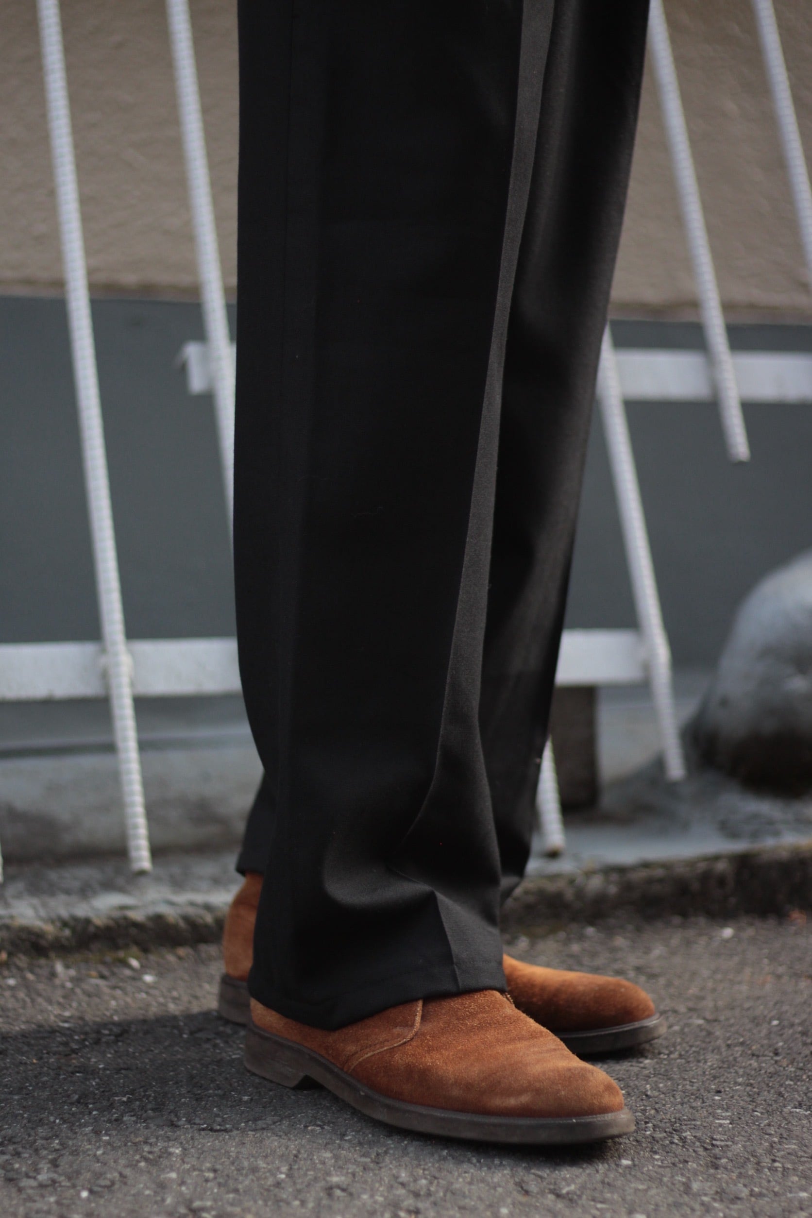 ブラックカラーの上品さに、ポリエステル・レーヨン・ウールを混紡した落ち感のあるファブリックが相まって、古着とは思えないほど綺麗な仕上がりの一本です。