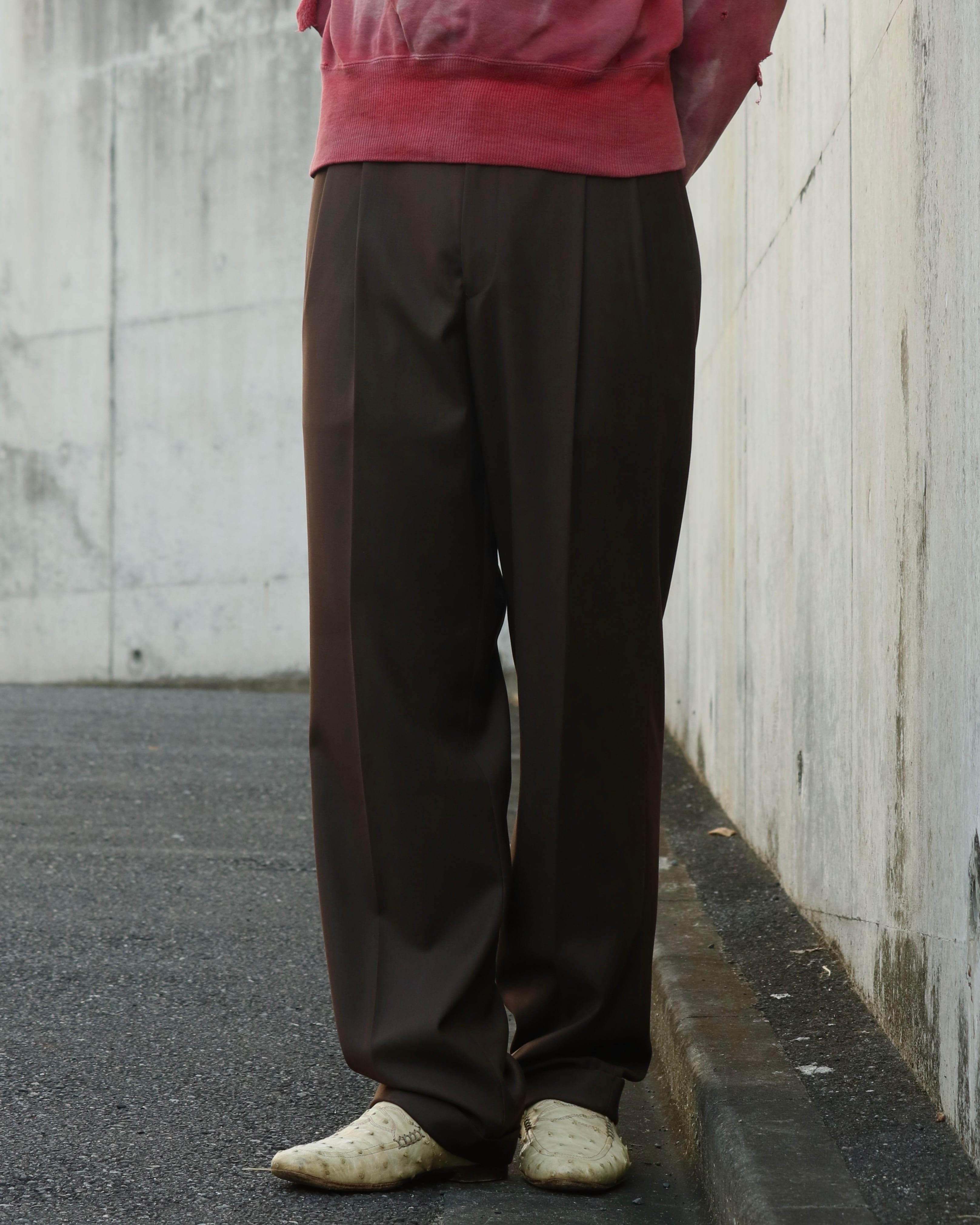 フロントに入ったタックが特徴的なワイドスラックスが入荷しました。