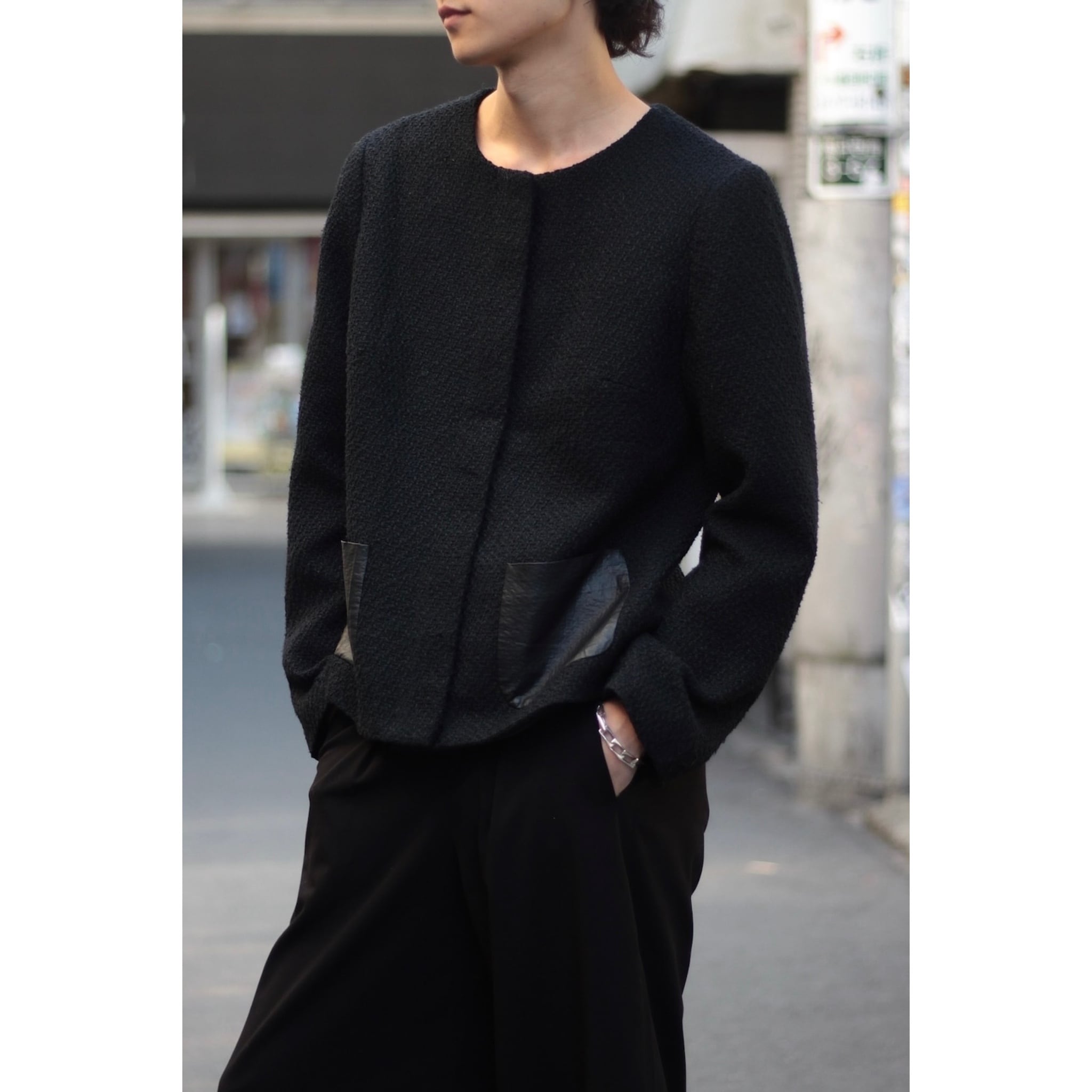 faux leather switching no-collar tweed zip jacket【OT-20028】