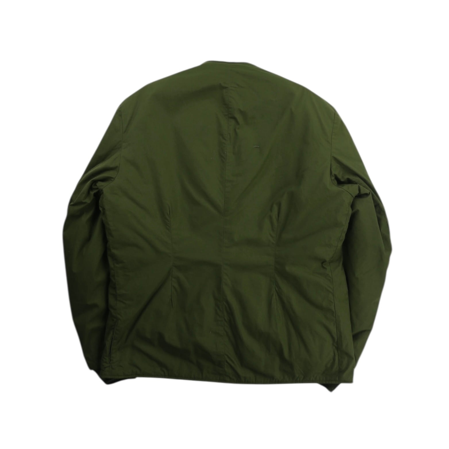 襟なしのシンプルなデザインも落ち着いた雰囲気で、非常にコーディネートしやすいアイテム。
