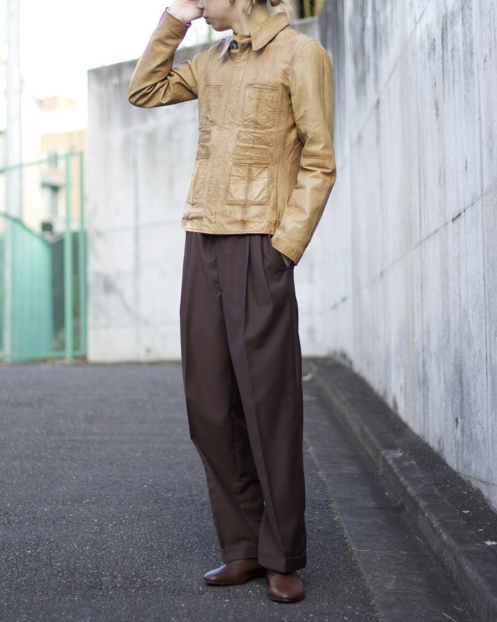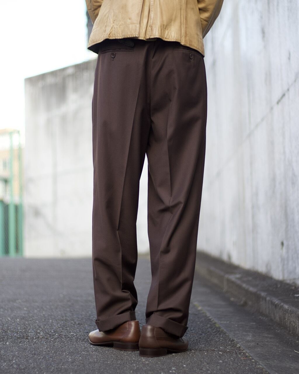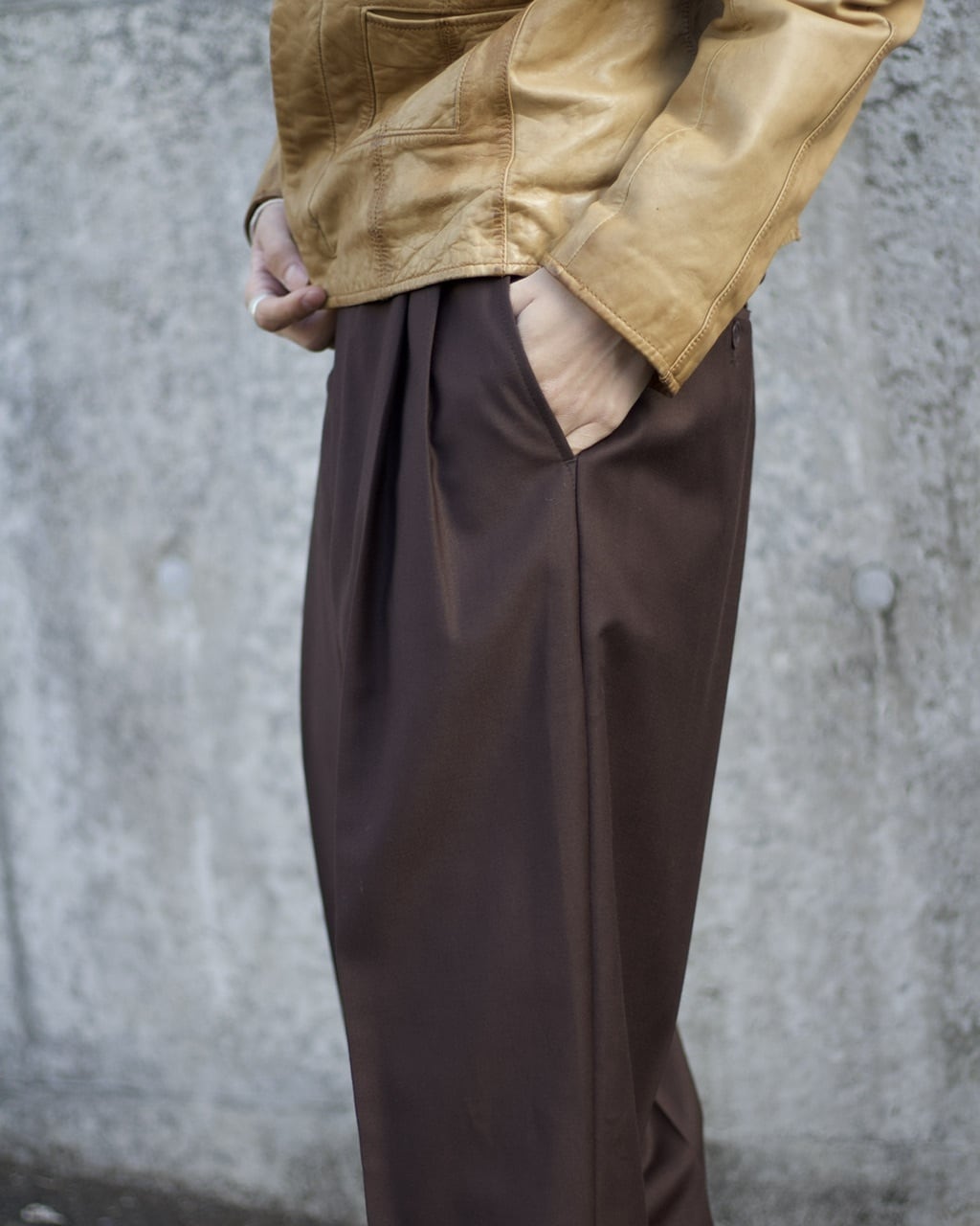 フロントに入ったタックが特徴的なワイドスラックスが入荷しました。