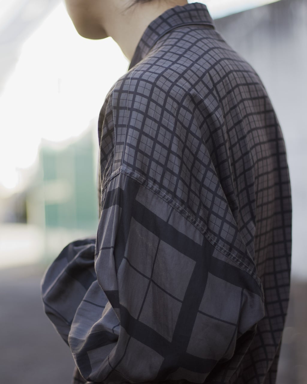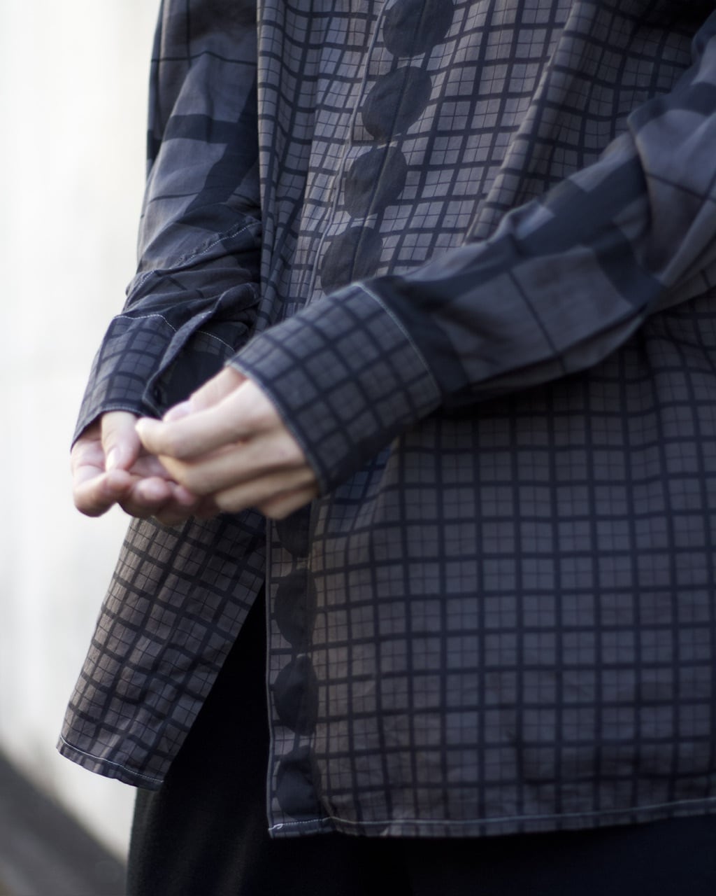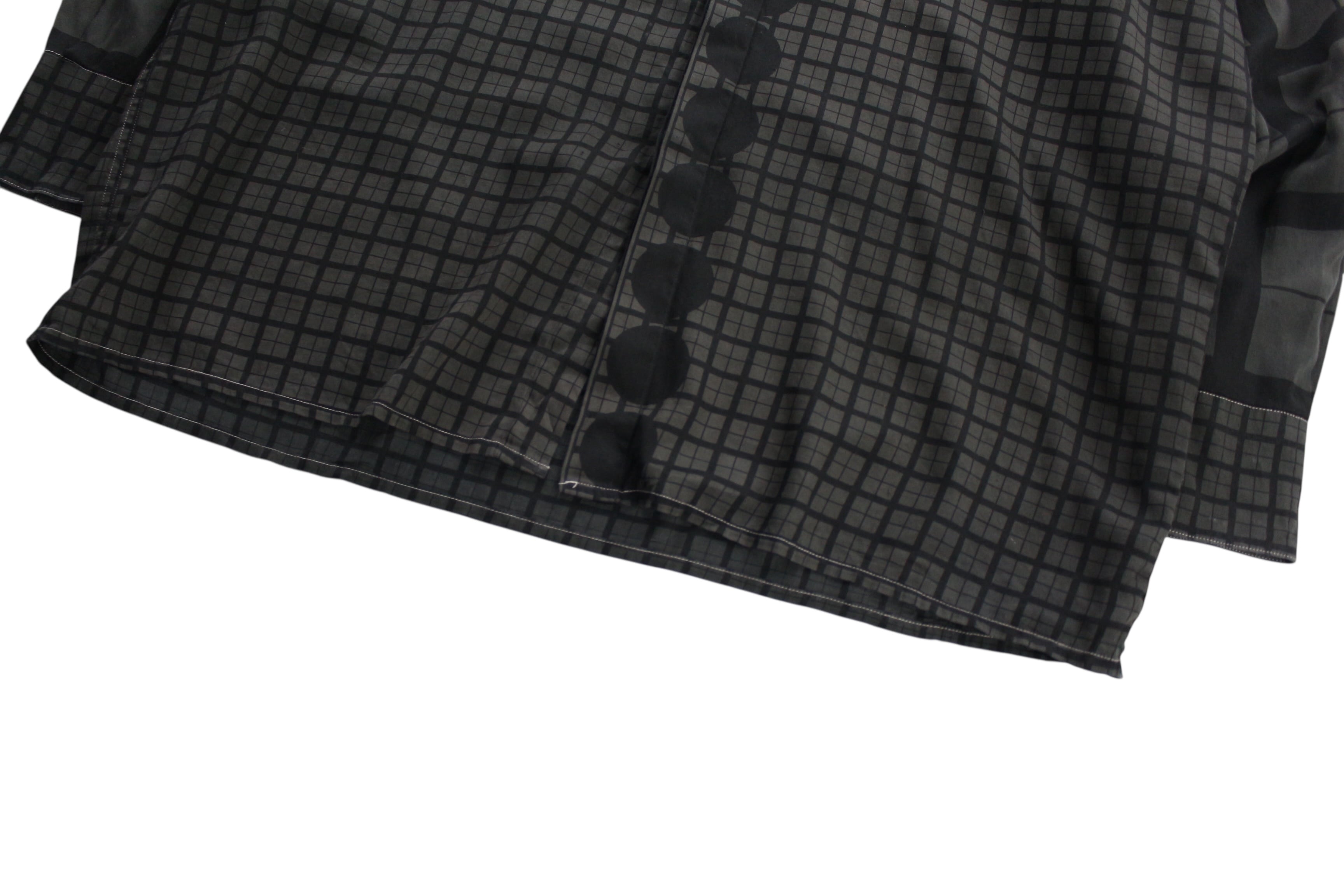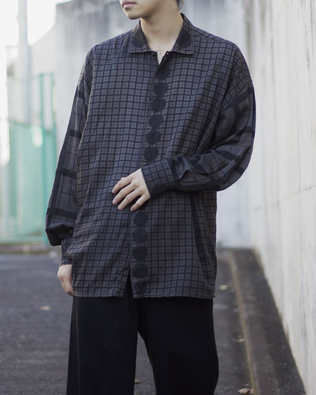 水玉模様とチェック柄と大判チェック柄が重なったデザインのブランドシャツ。