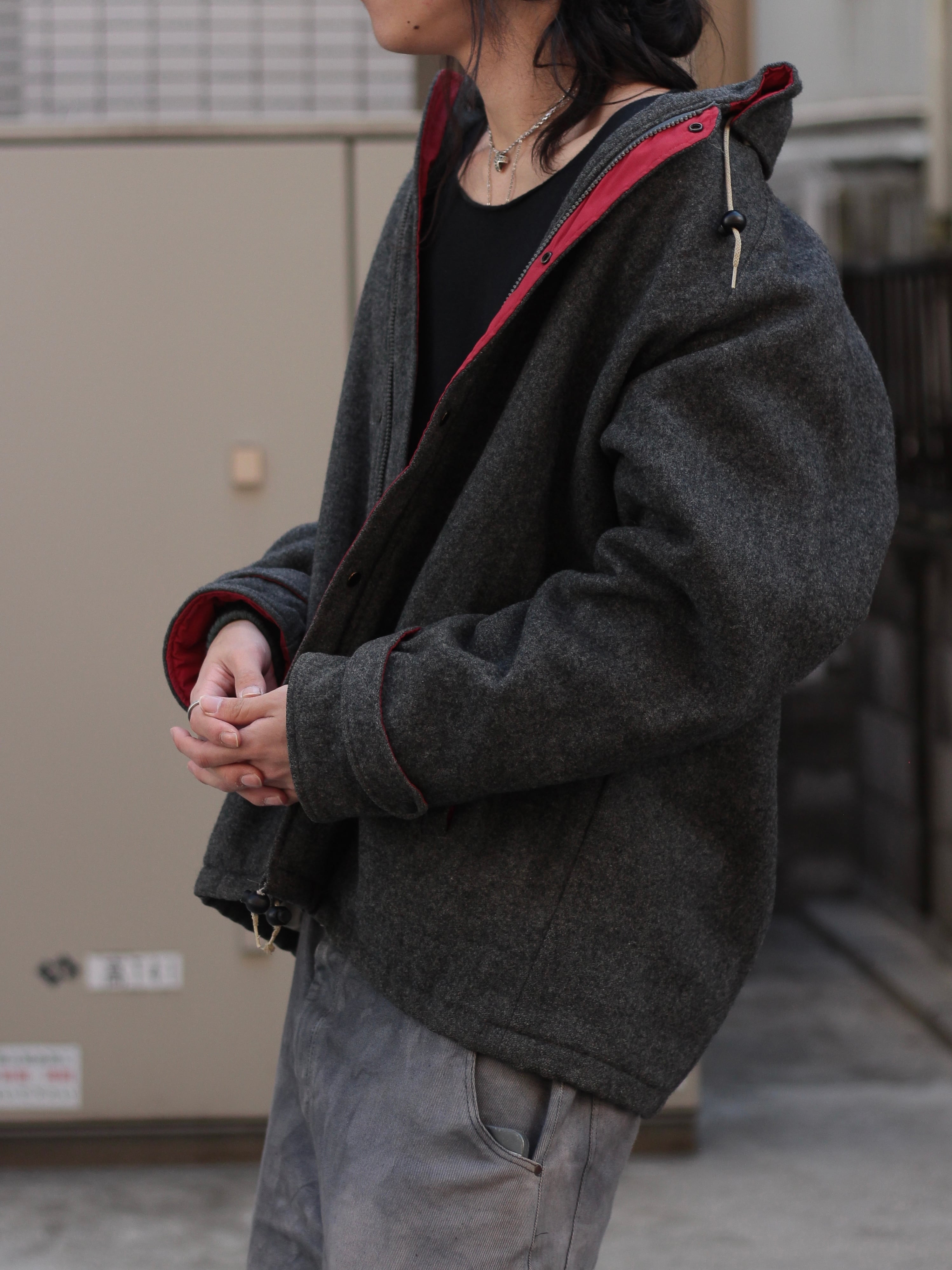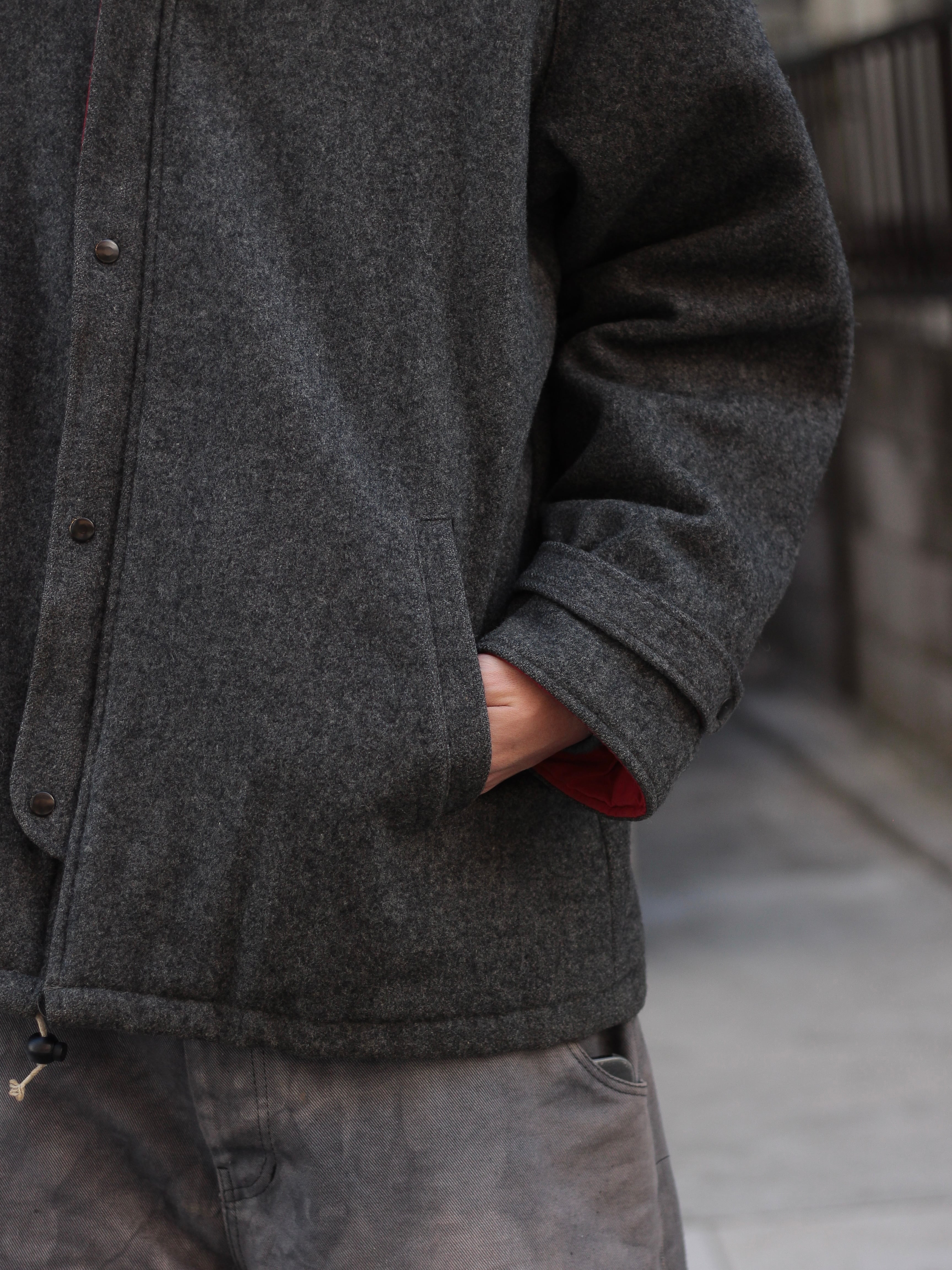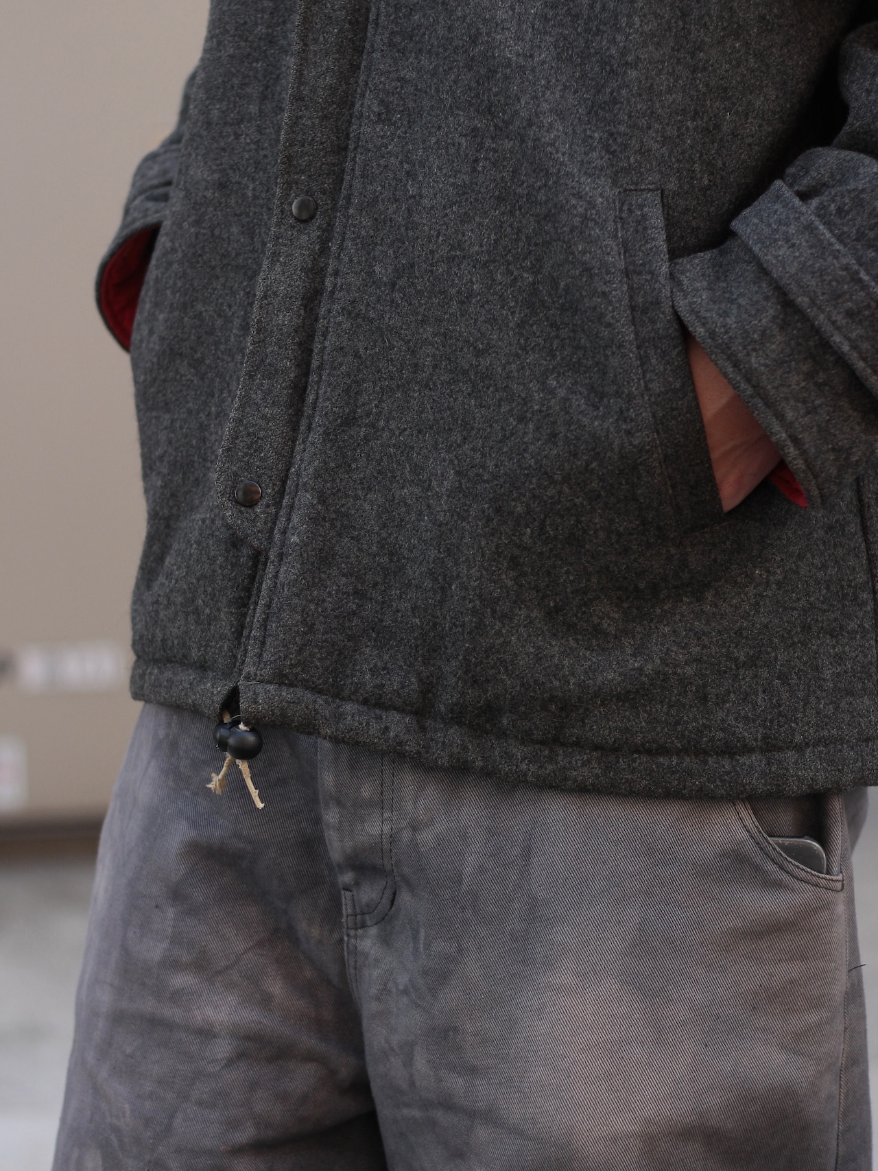 チャコールグレーの100%ヴァージンウール生地、シート状の薄いシンサレート中綿、ナイロンライニング。