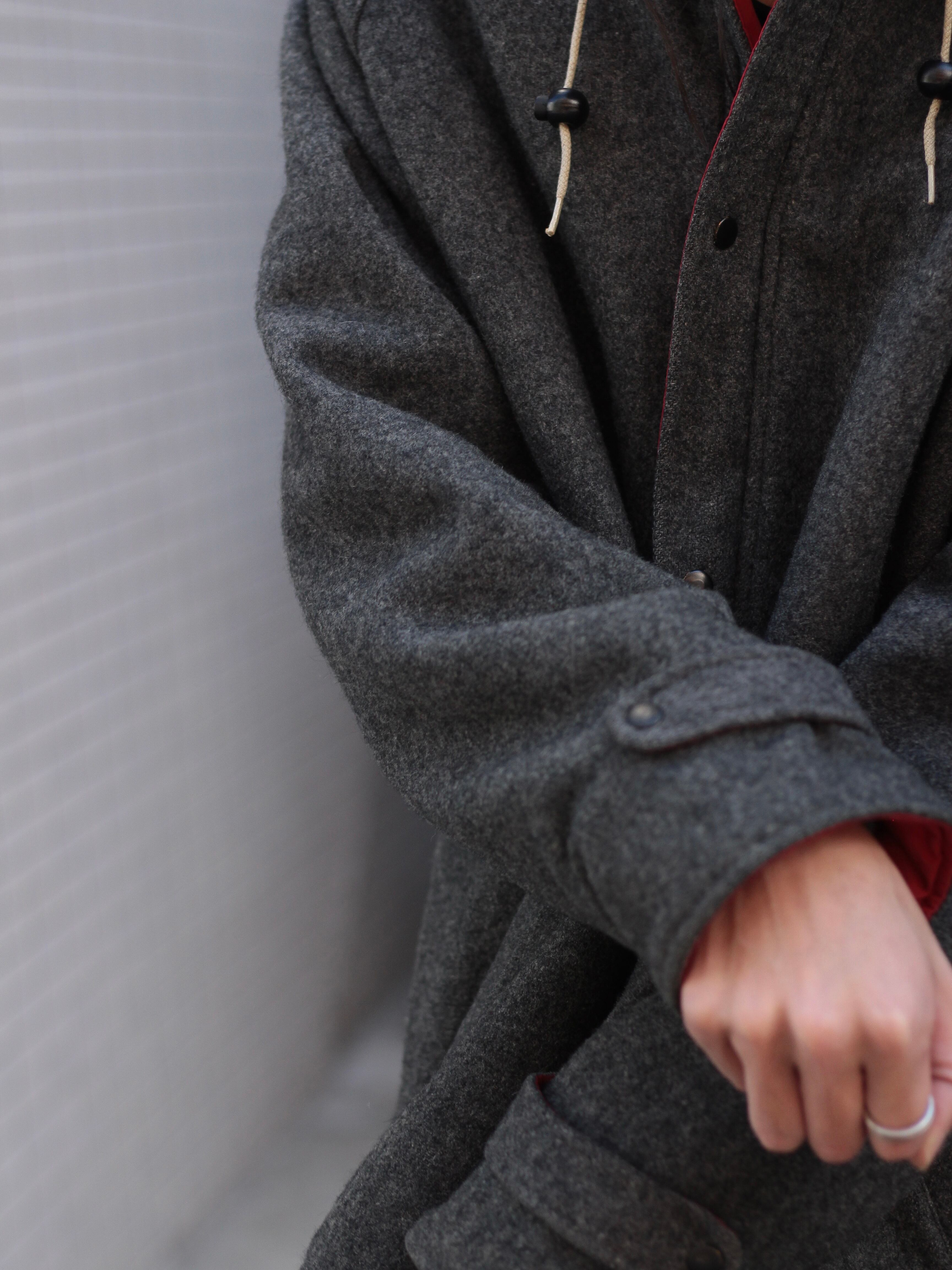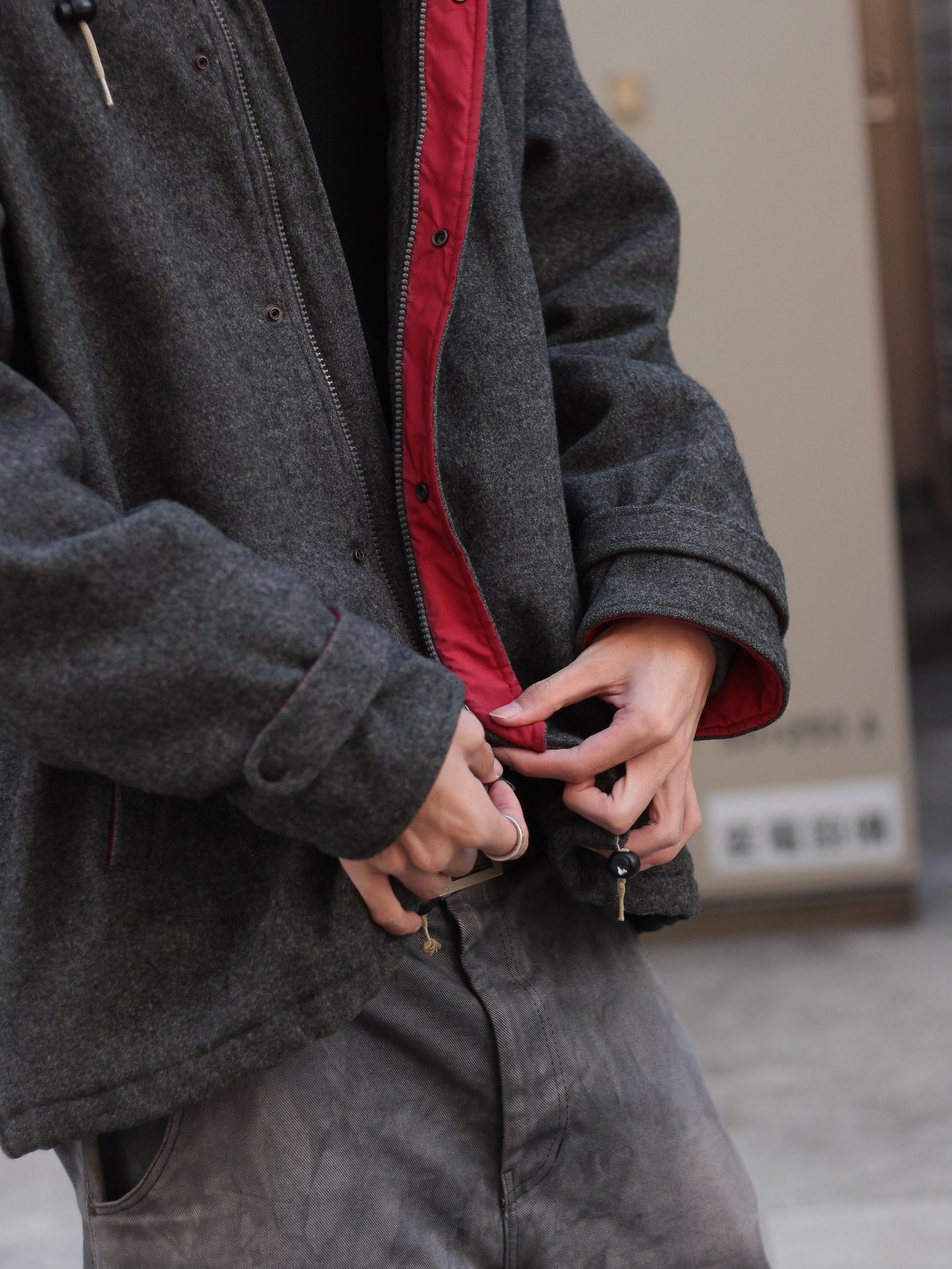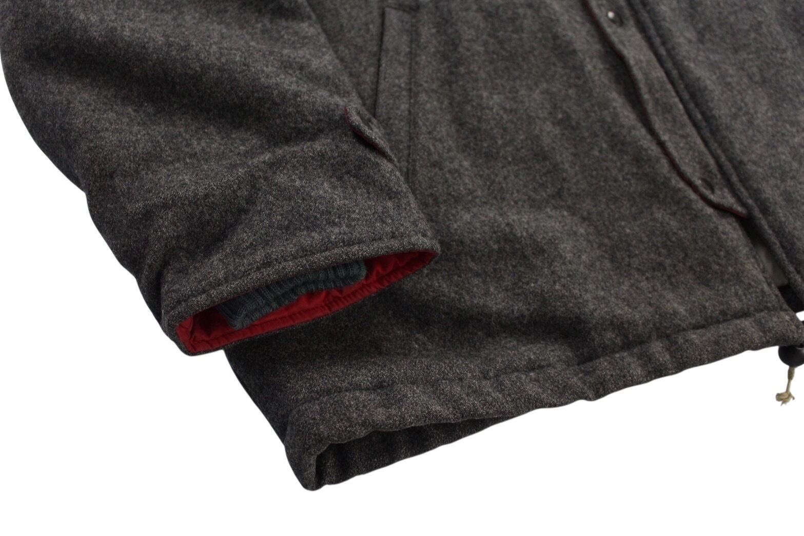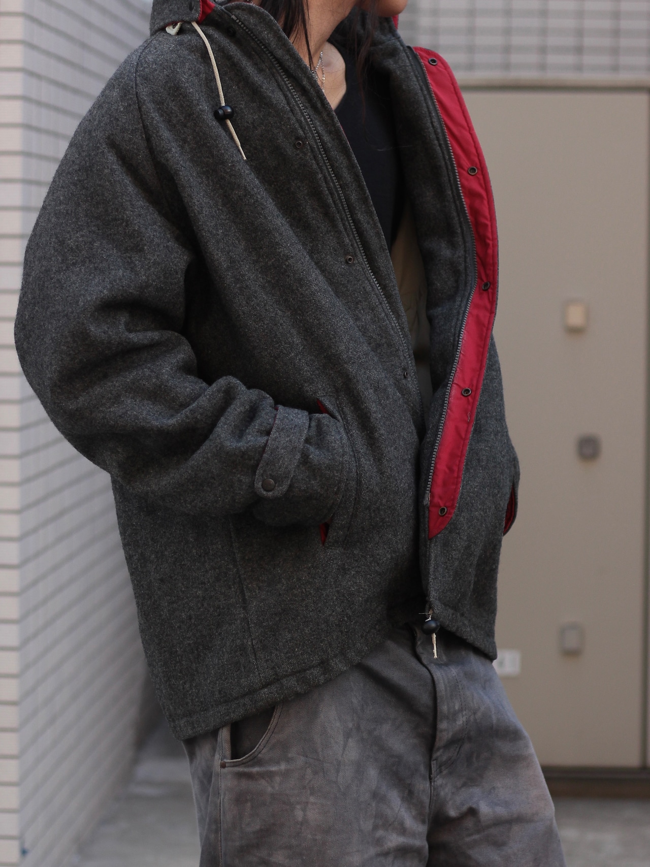 チャコールグレーの100%ヴァージンウール生地、シート状の薄いシンサレート中綿、ナイロンライニング。