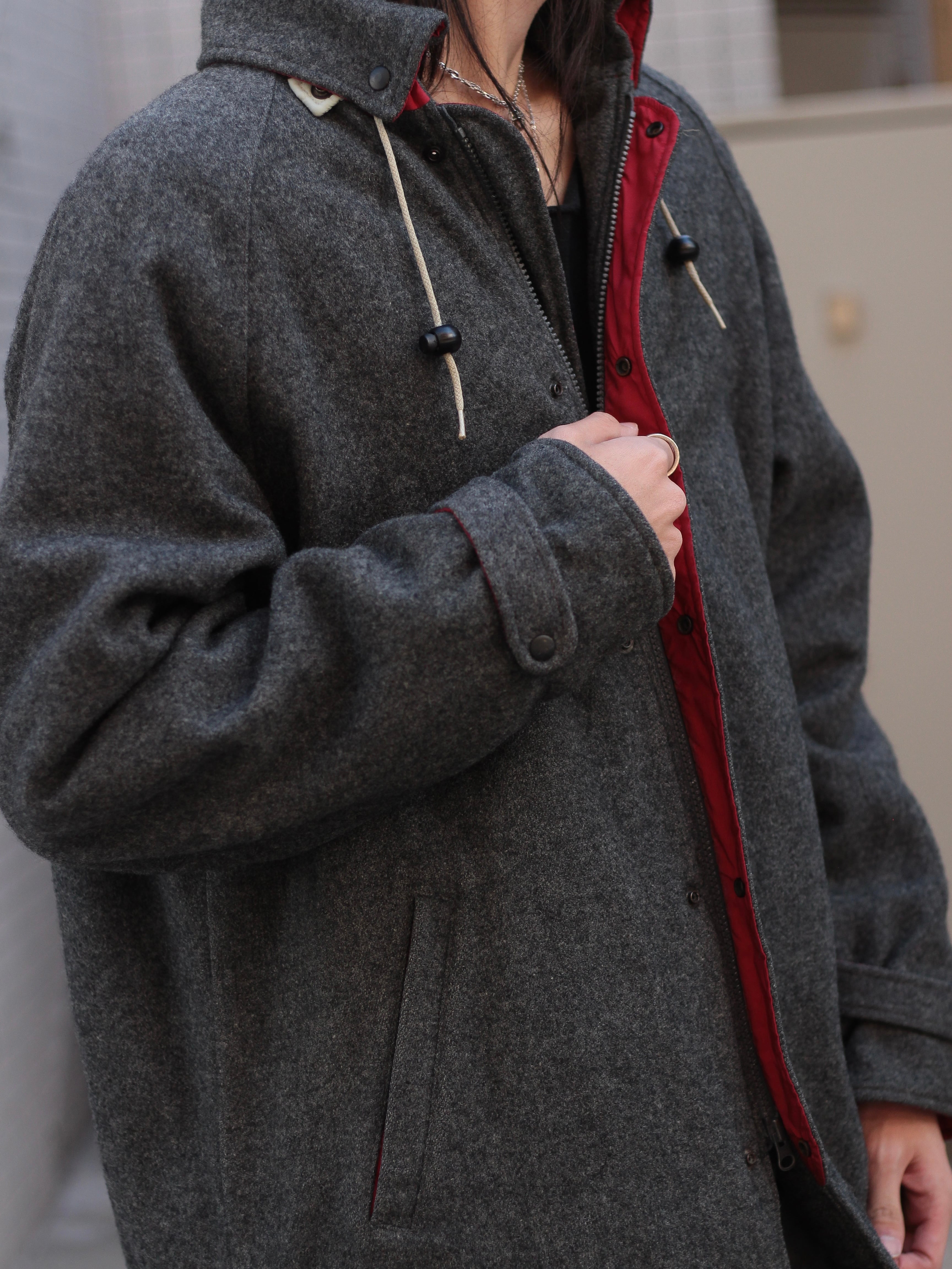 ラグランスリーブ、カーメルジャケットのような襟型でナイロンのフードが収納されています。