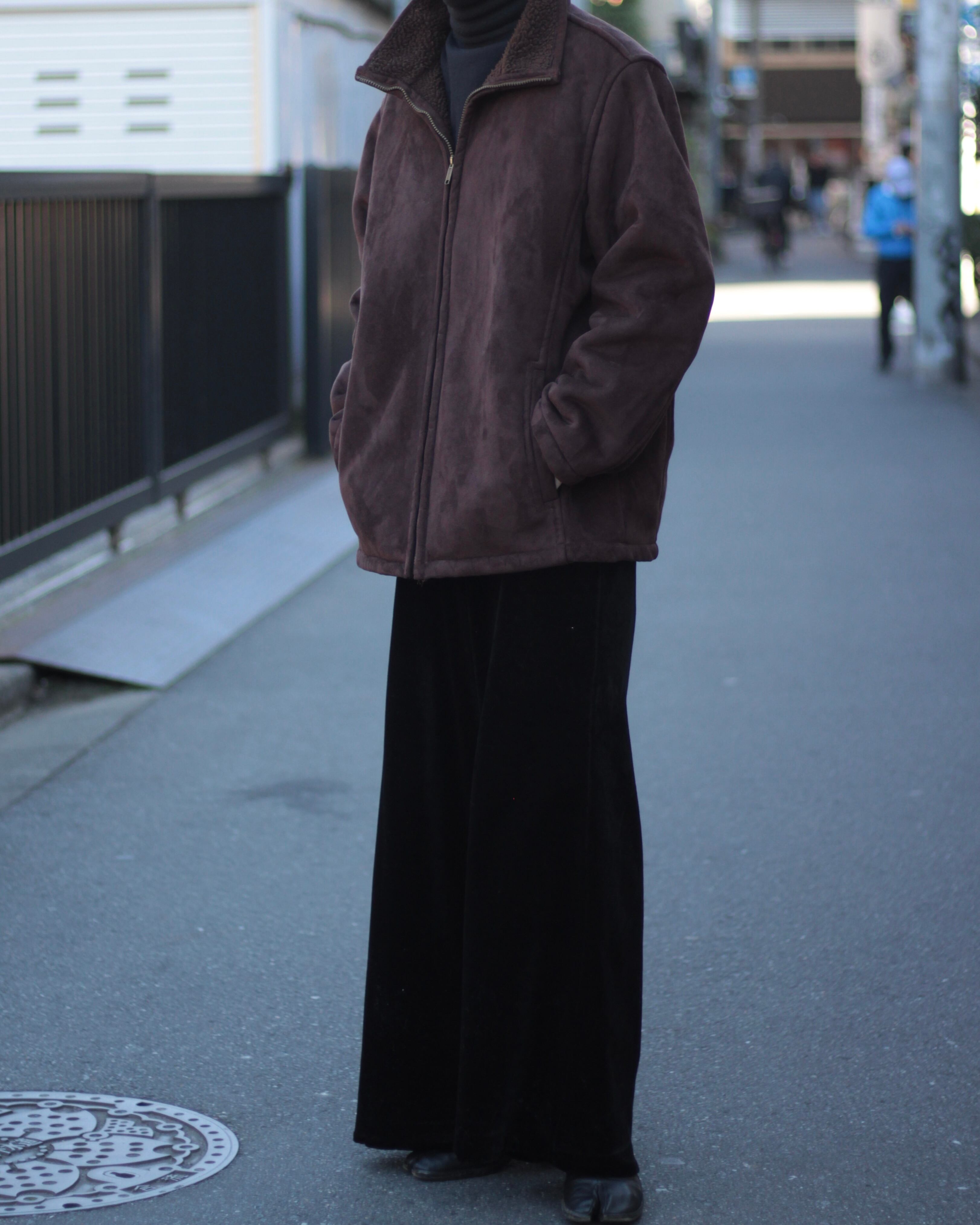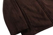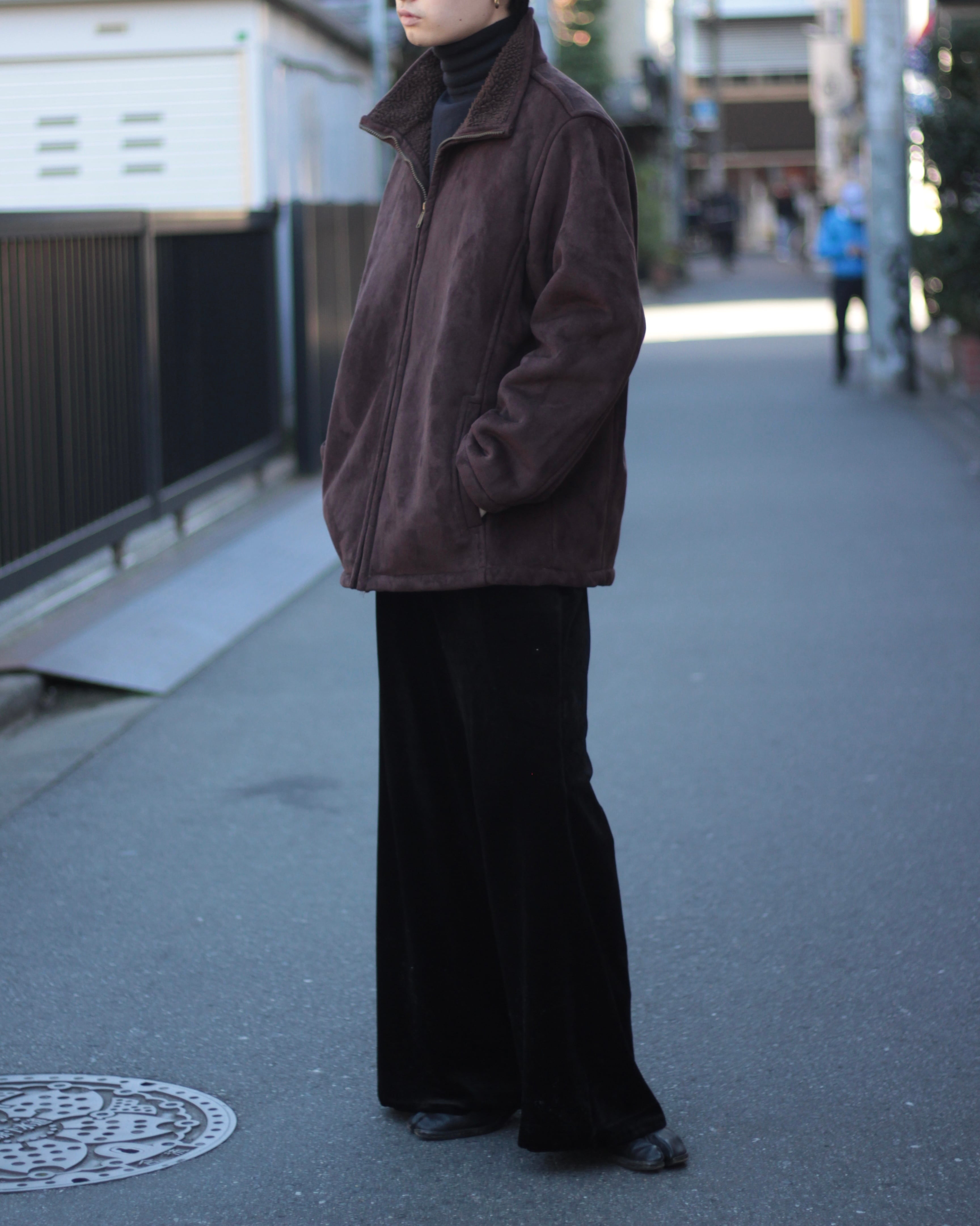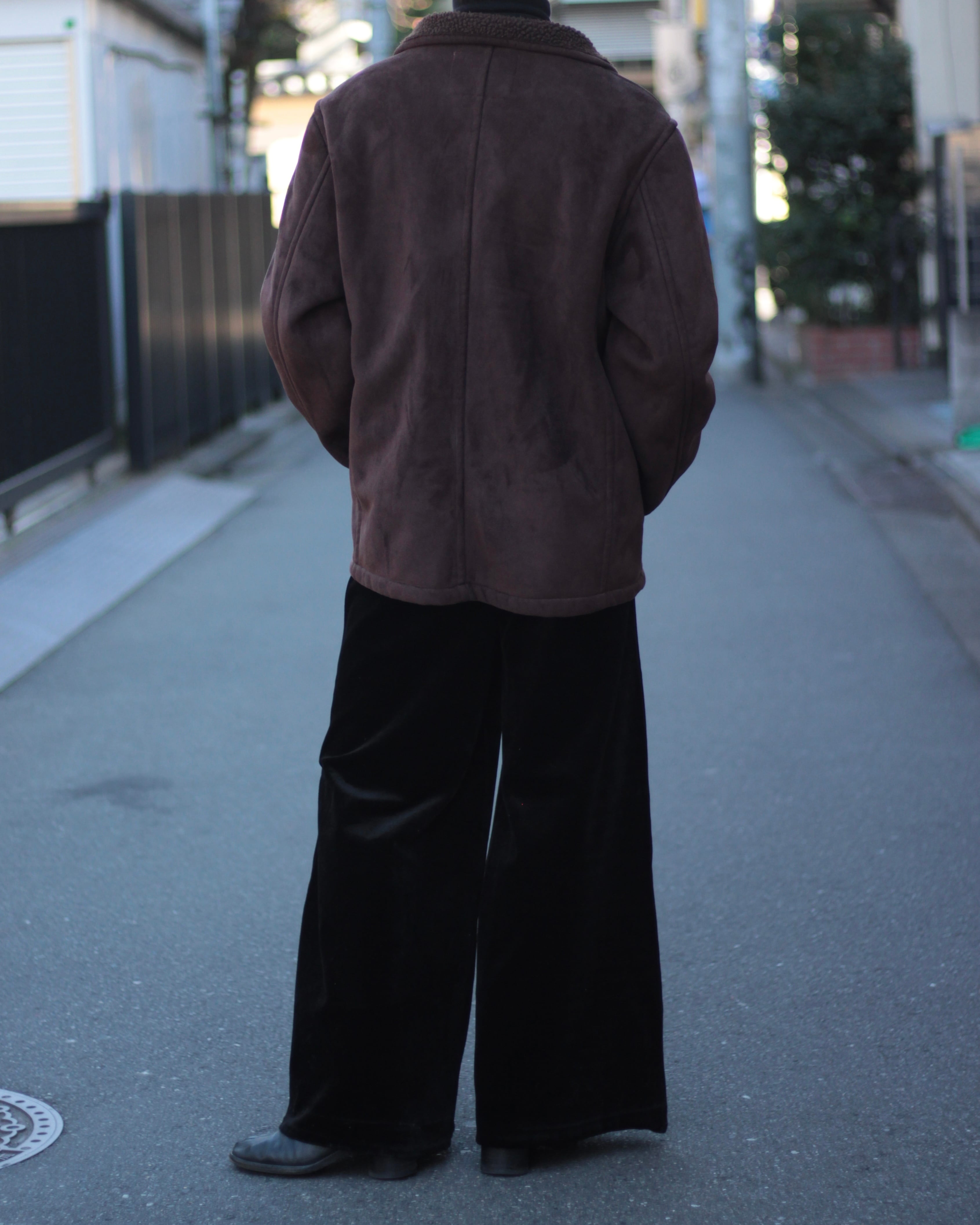 深みのあるダークブラウンカラーのフェイクムートンで本革と見紛う程のもっちりとした質感。