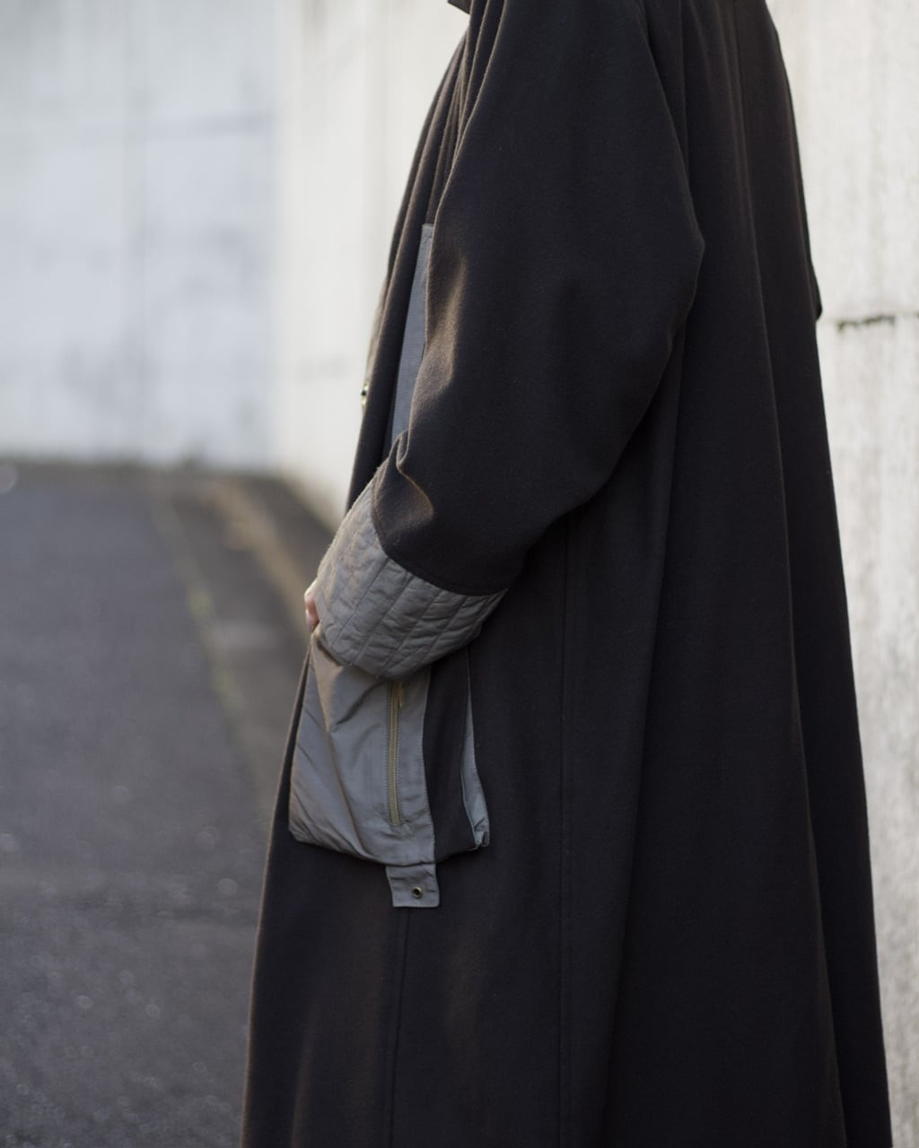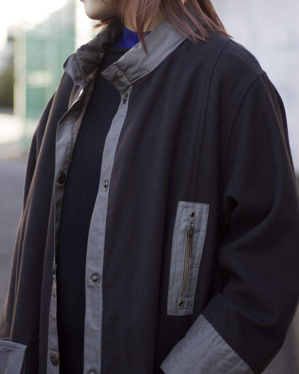 ブラック×グレーの切り替えが特徴的で、袖口、フロント、ポケット周りに施されたパイピングがアクセントになってますね。