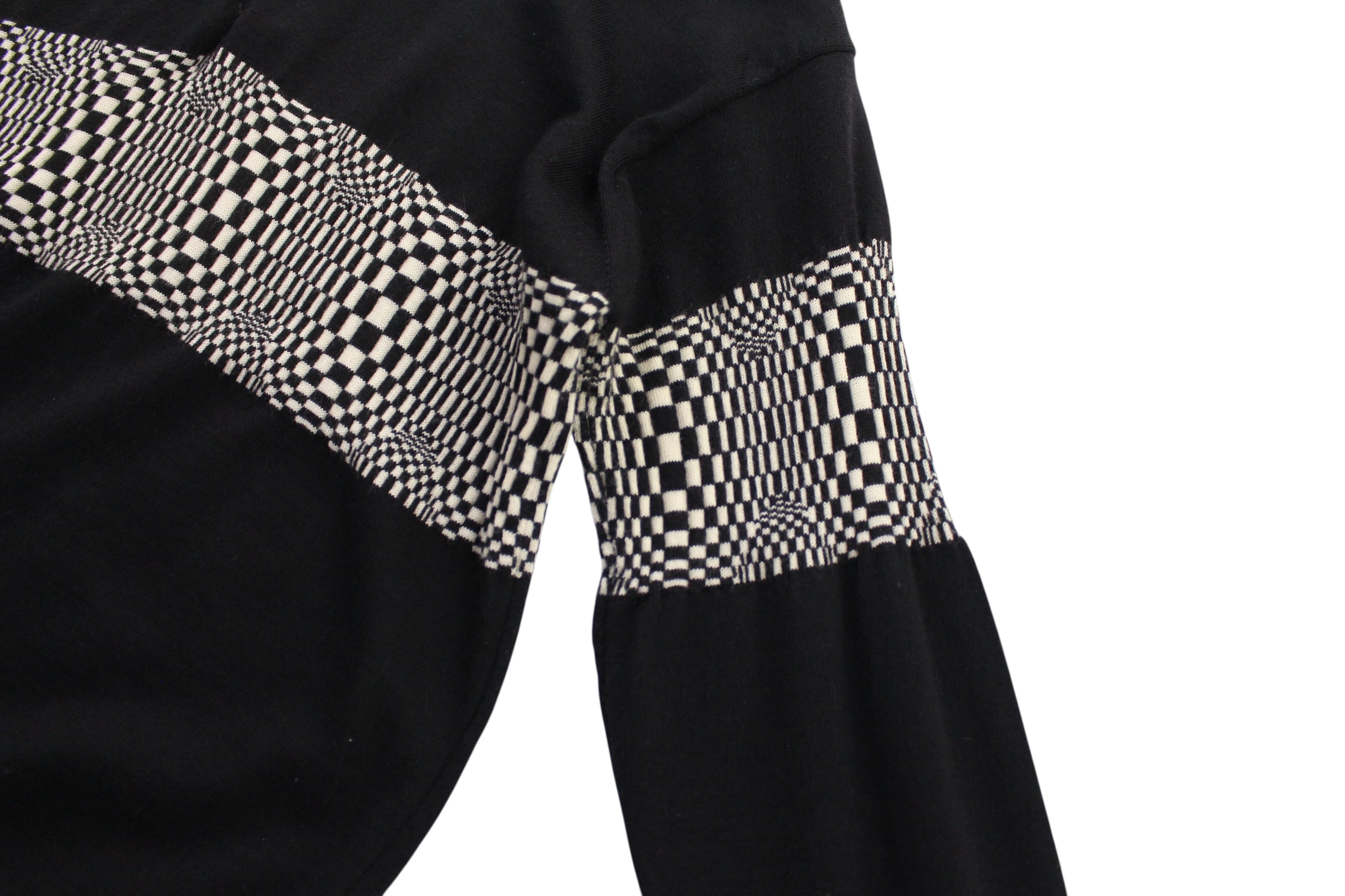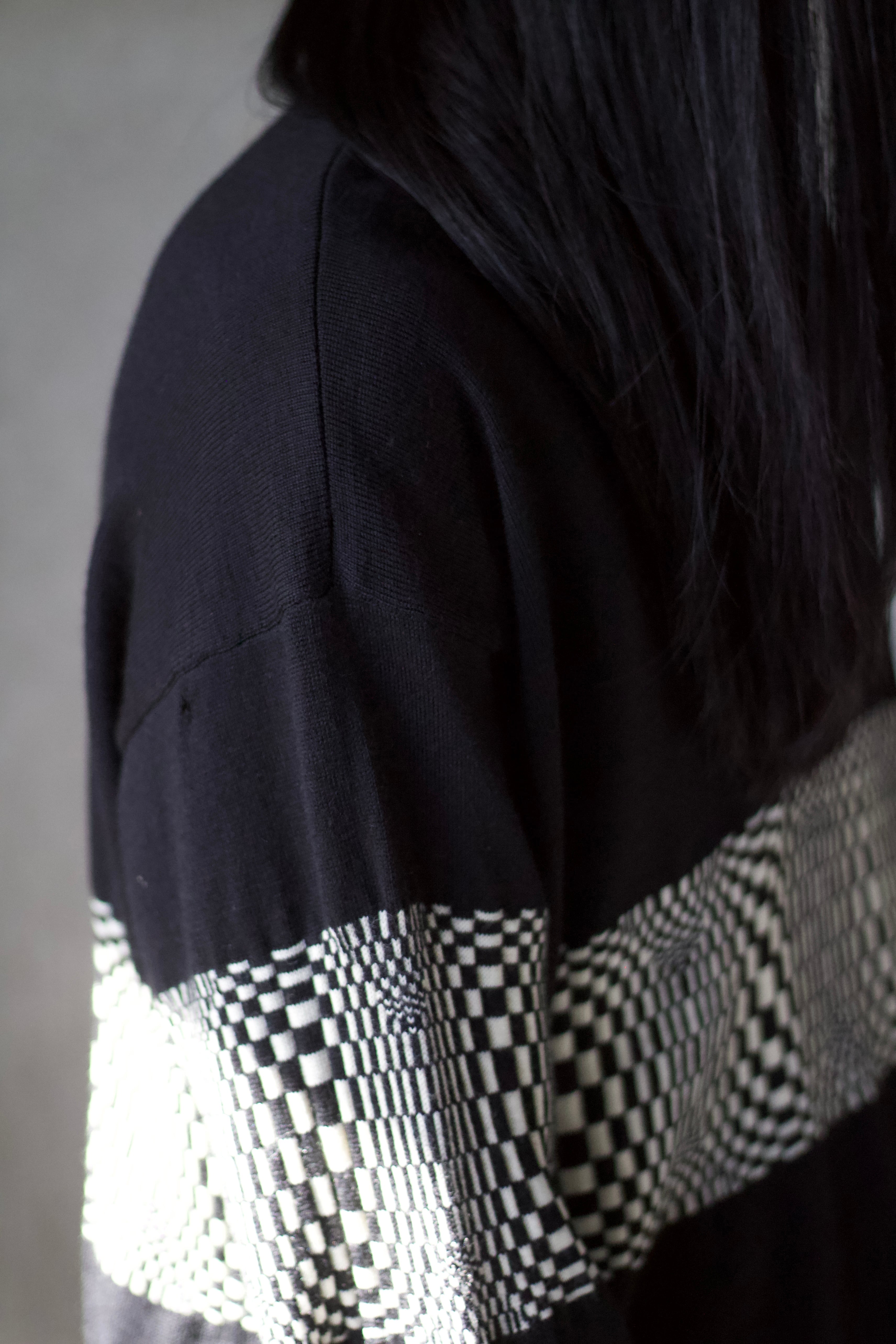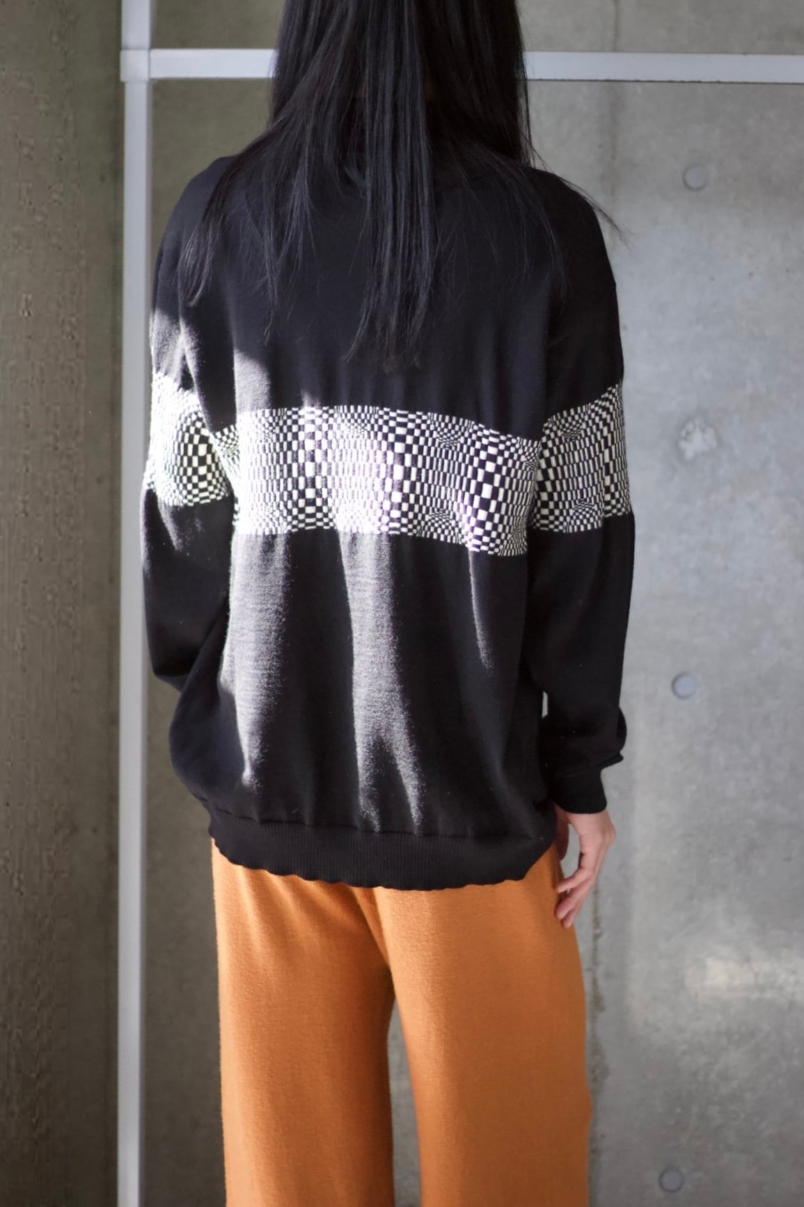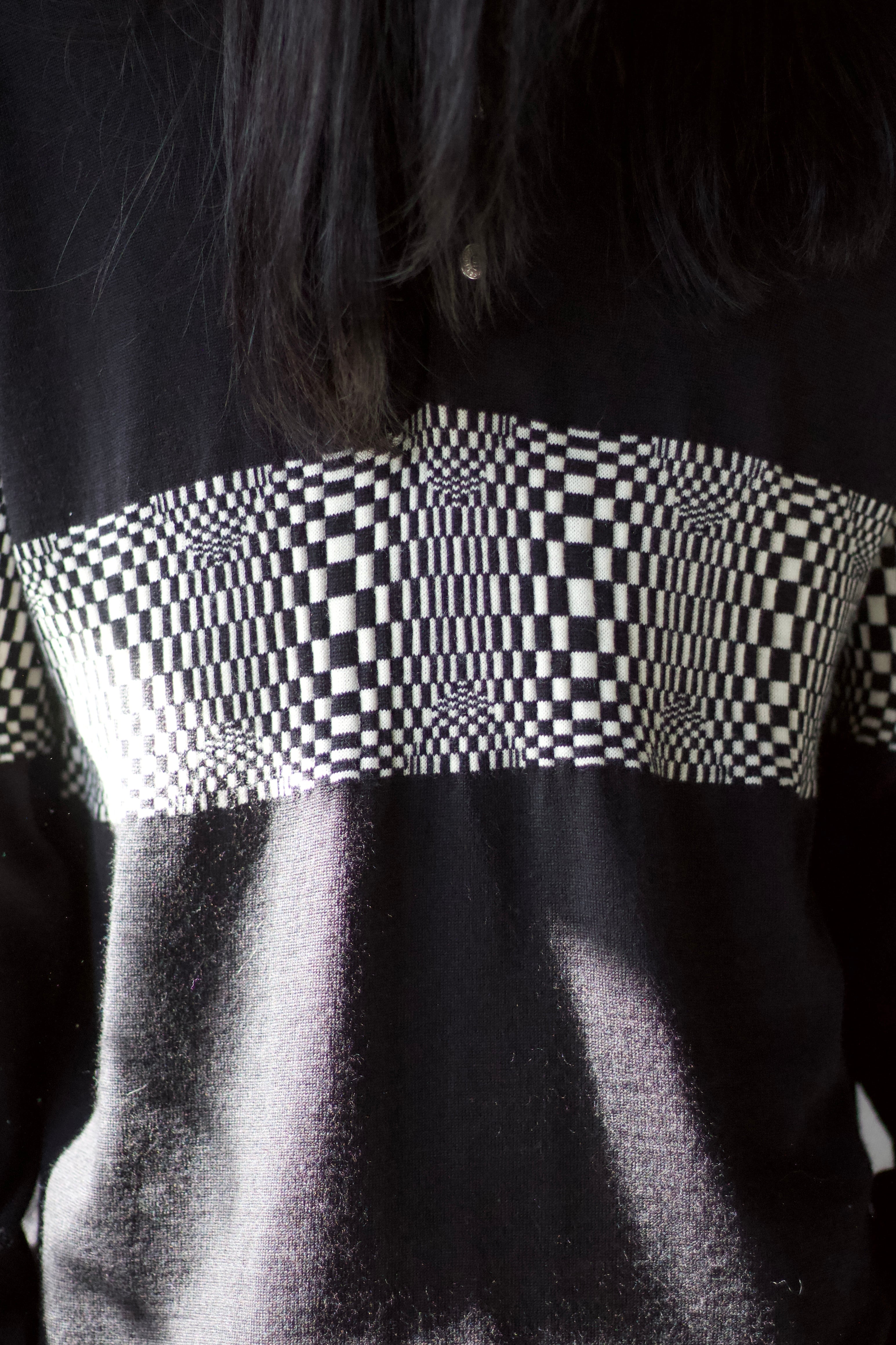 フロントとバックに施されている、遠近アートのような白黒チェックのデザイン。
