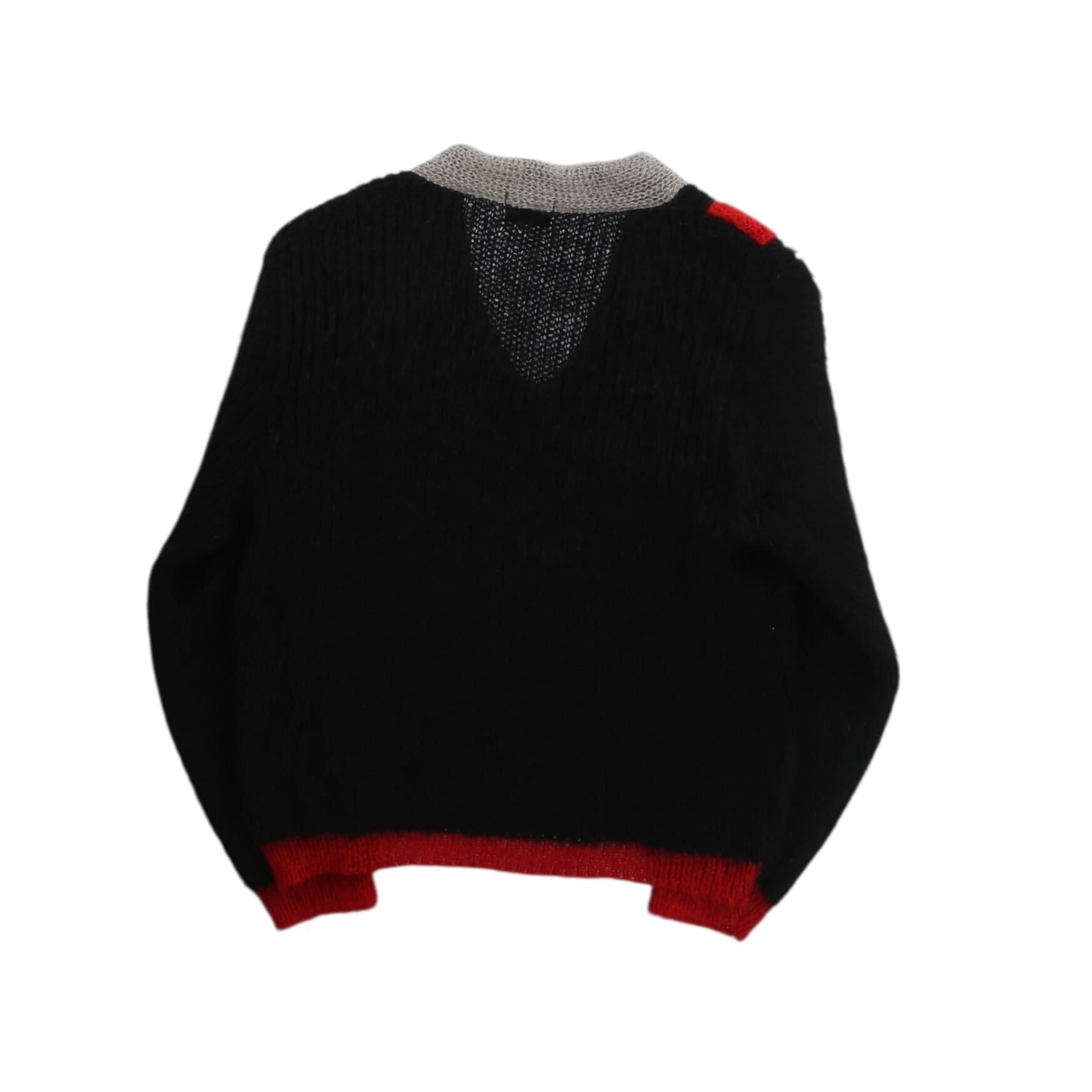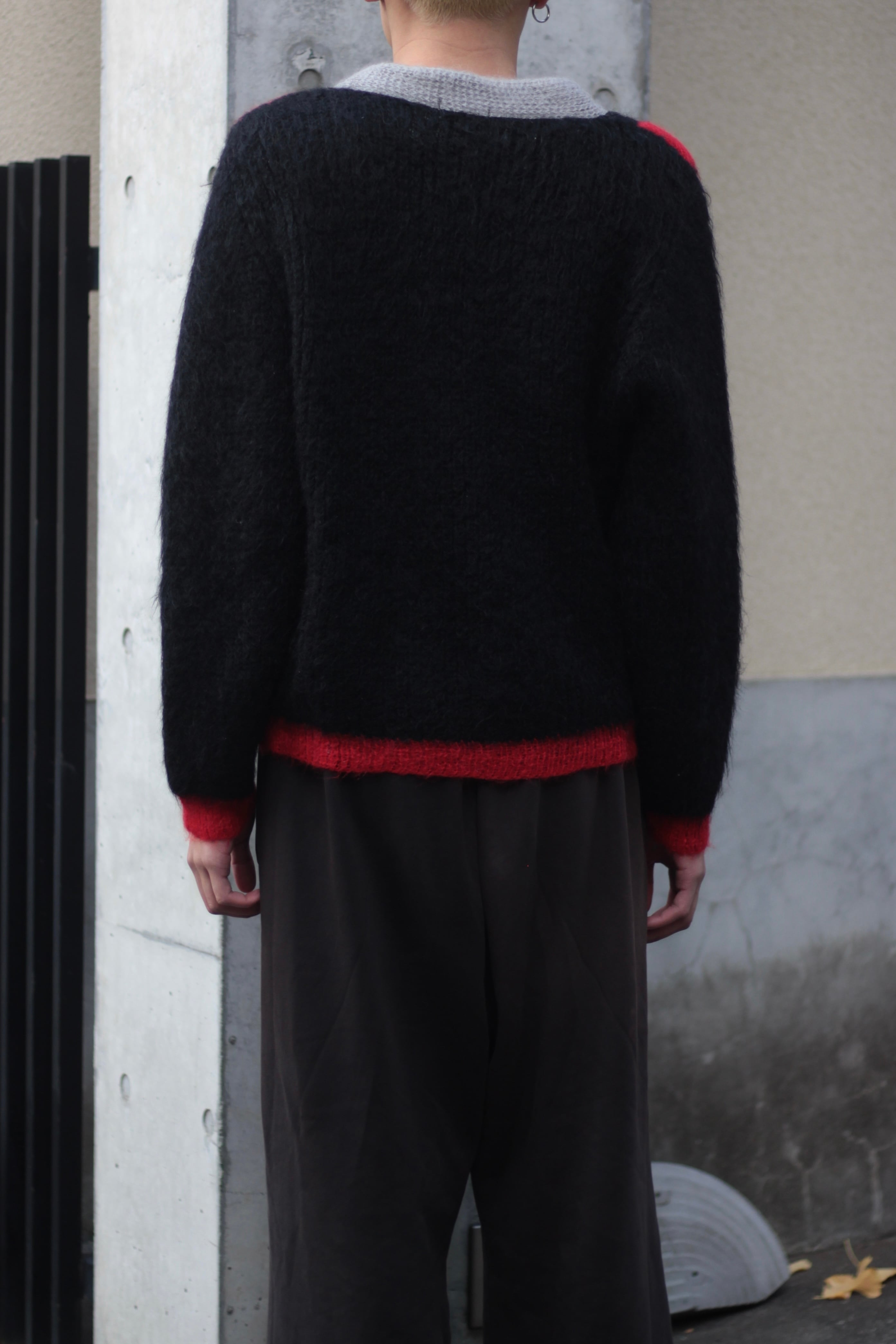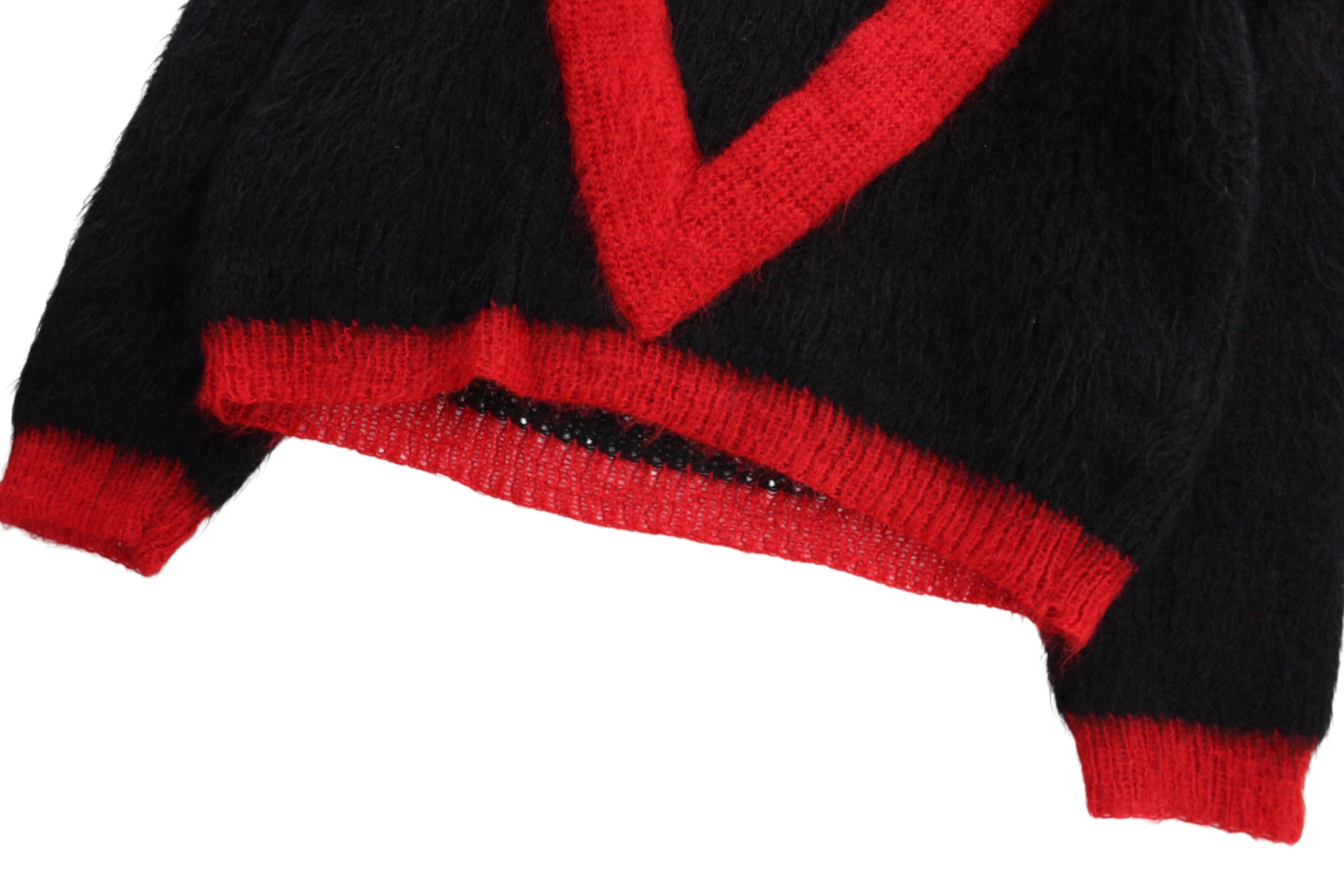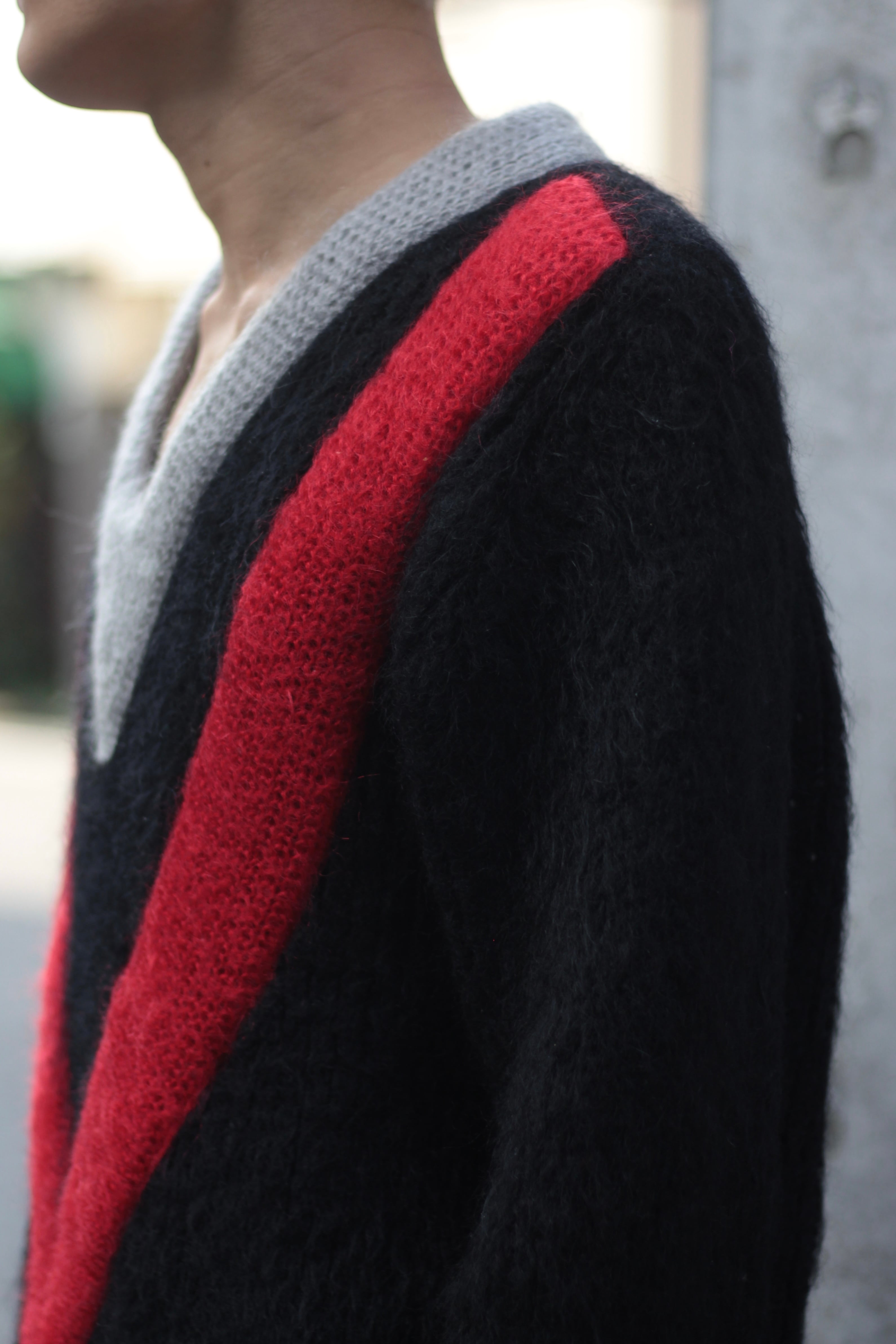 50s~60sモヘアを思わせる毛足の長いふんわりとしたタッチにブラックベースへレッド×グレーの太ラインVが映える存在感のあるデザイン