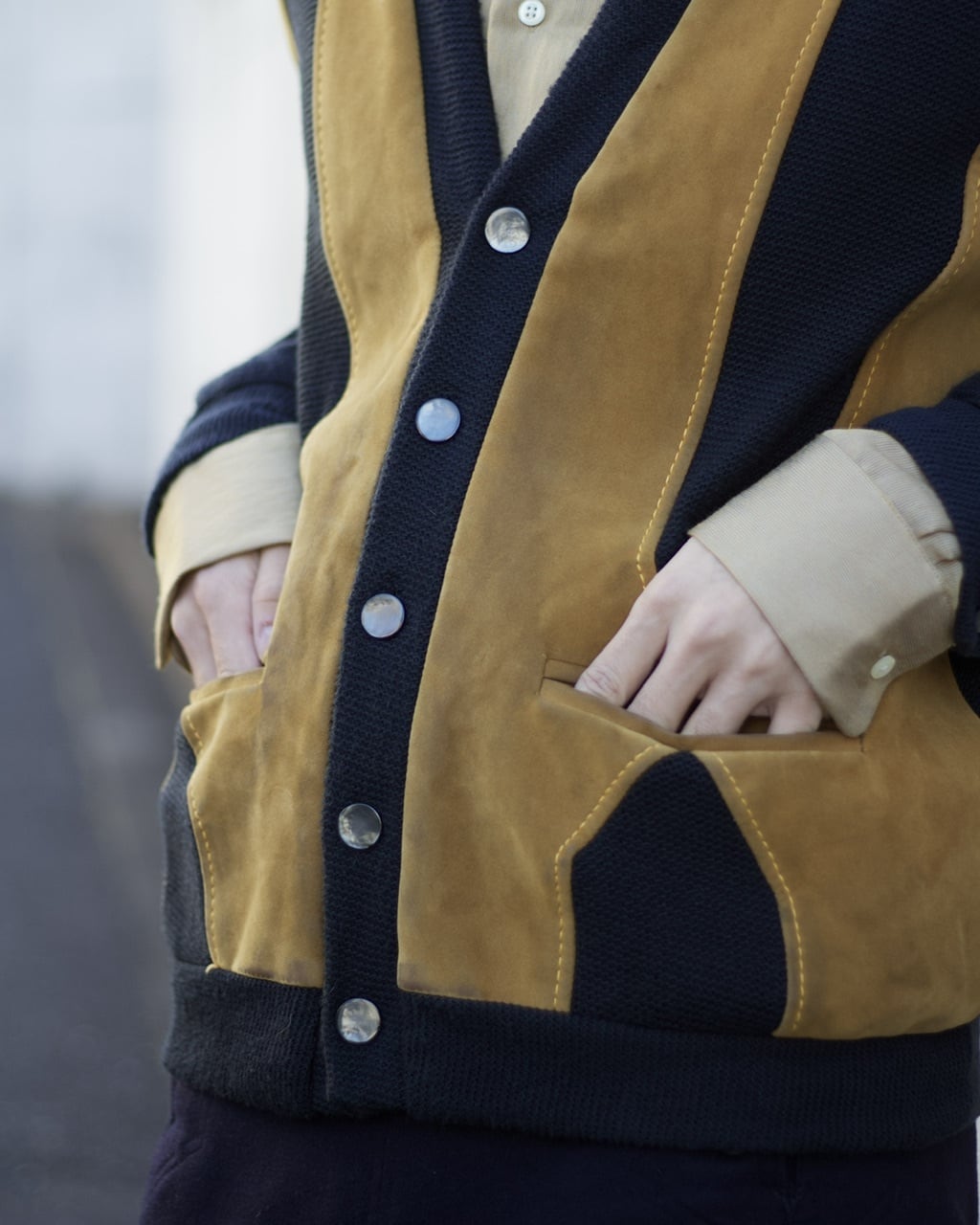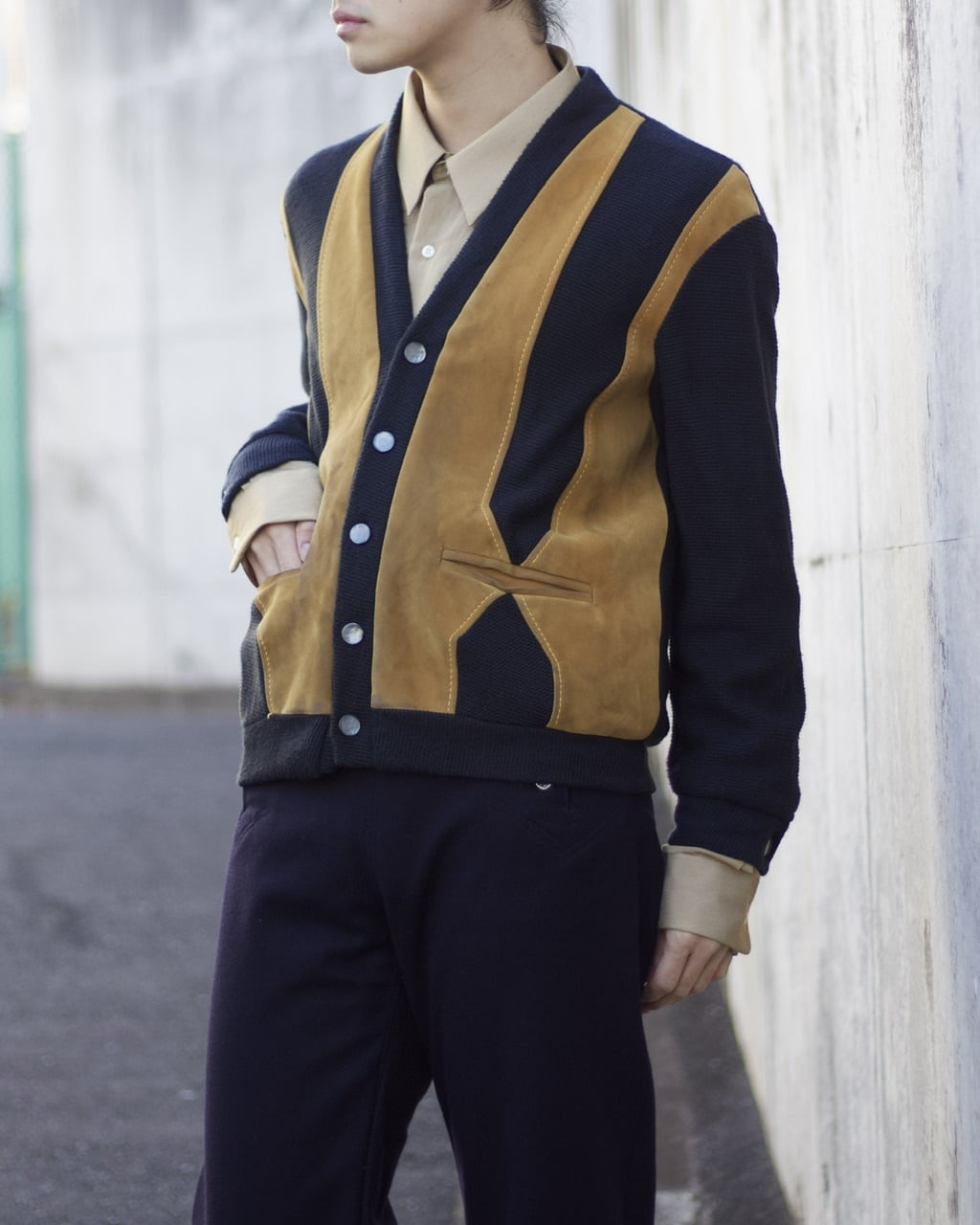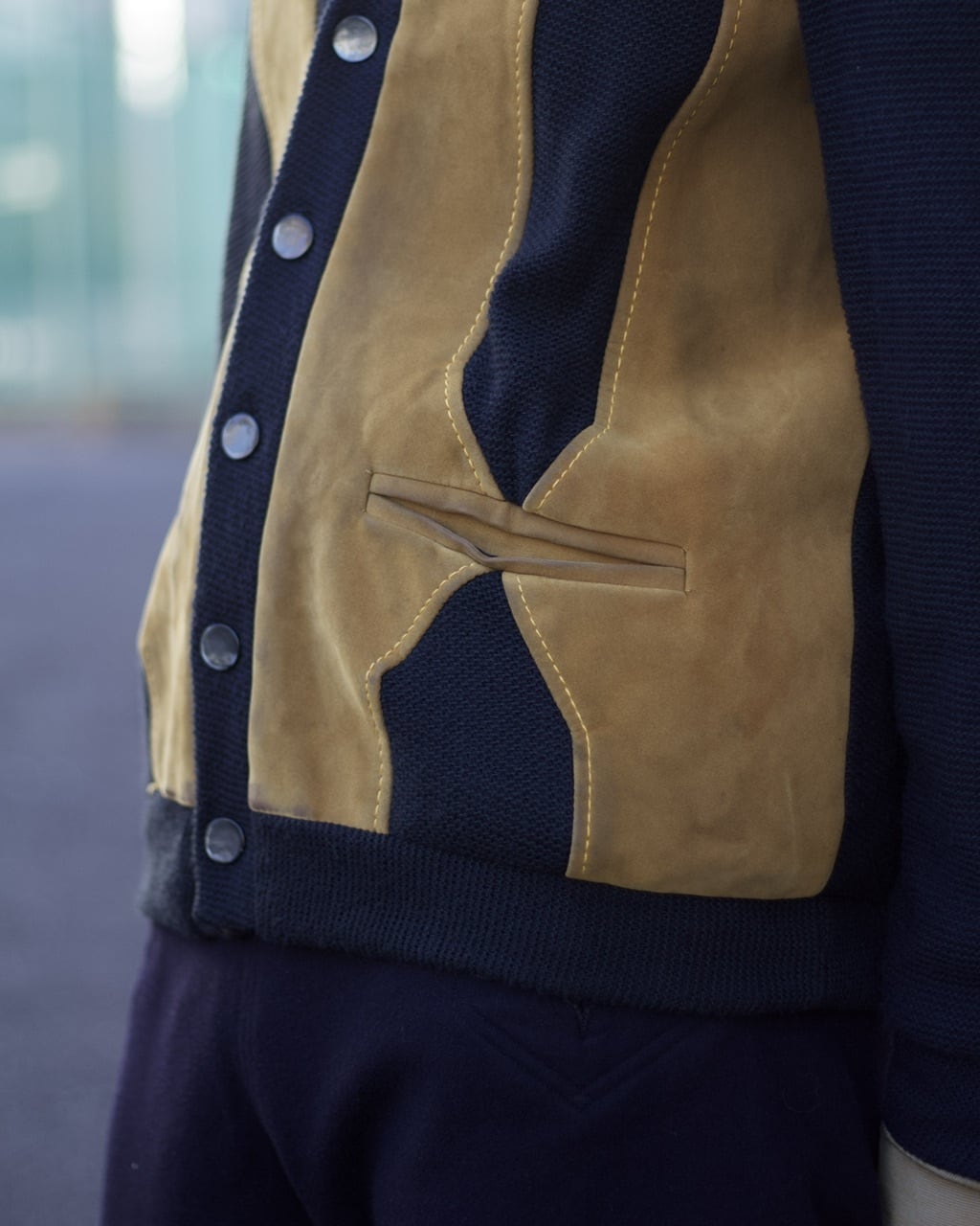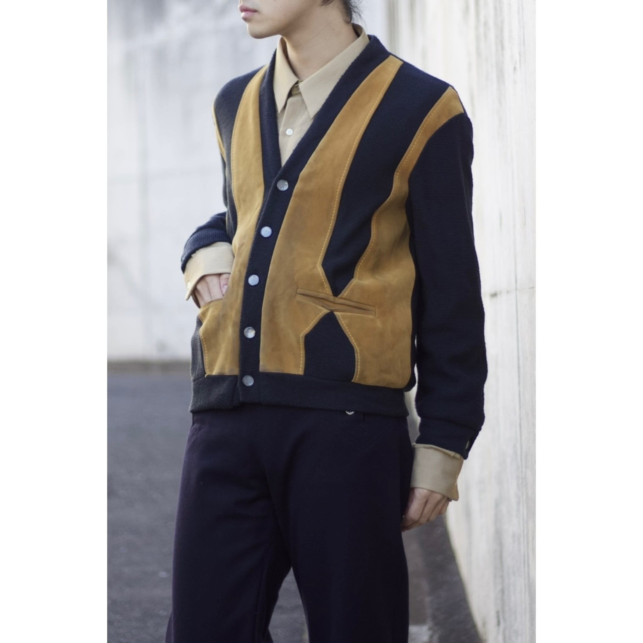 ソフトなレザーを使用したデザインもかなり凝っているカーディガン。