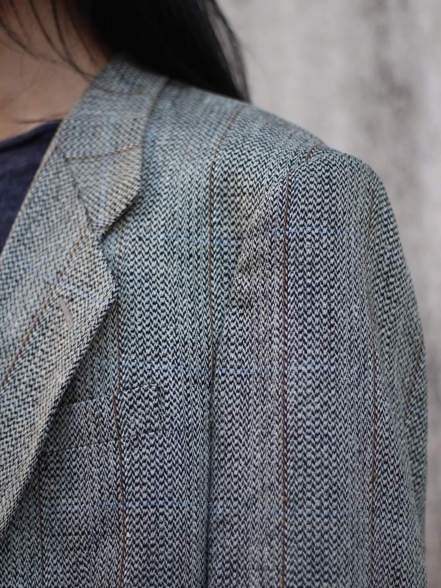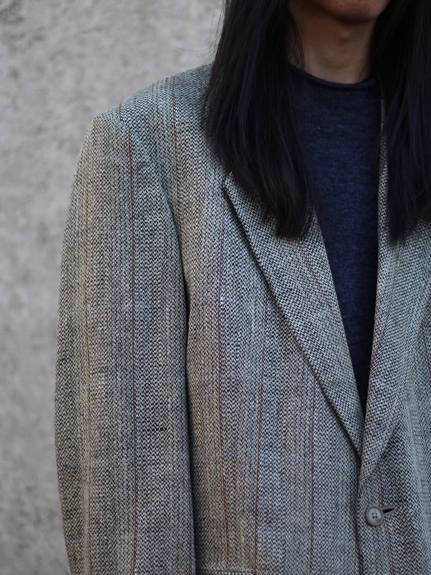 ツイード(ヘリンボーン+ストライプ調)のシックなカラーの高級ツイードで、軽いシルク混ではなく、今回は 100% Silk のラベルになっていたため、「シルクツイード」の非常に珍しい一着です。