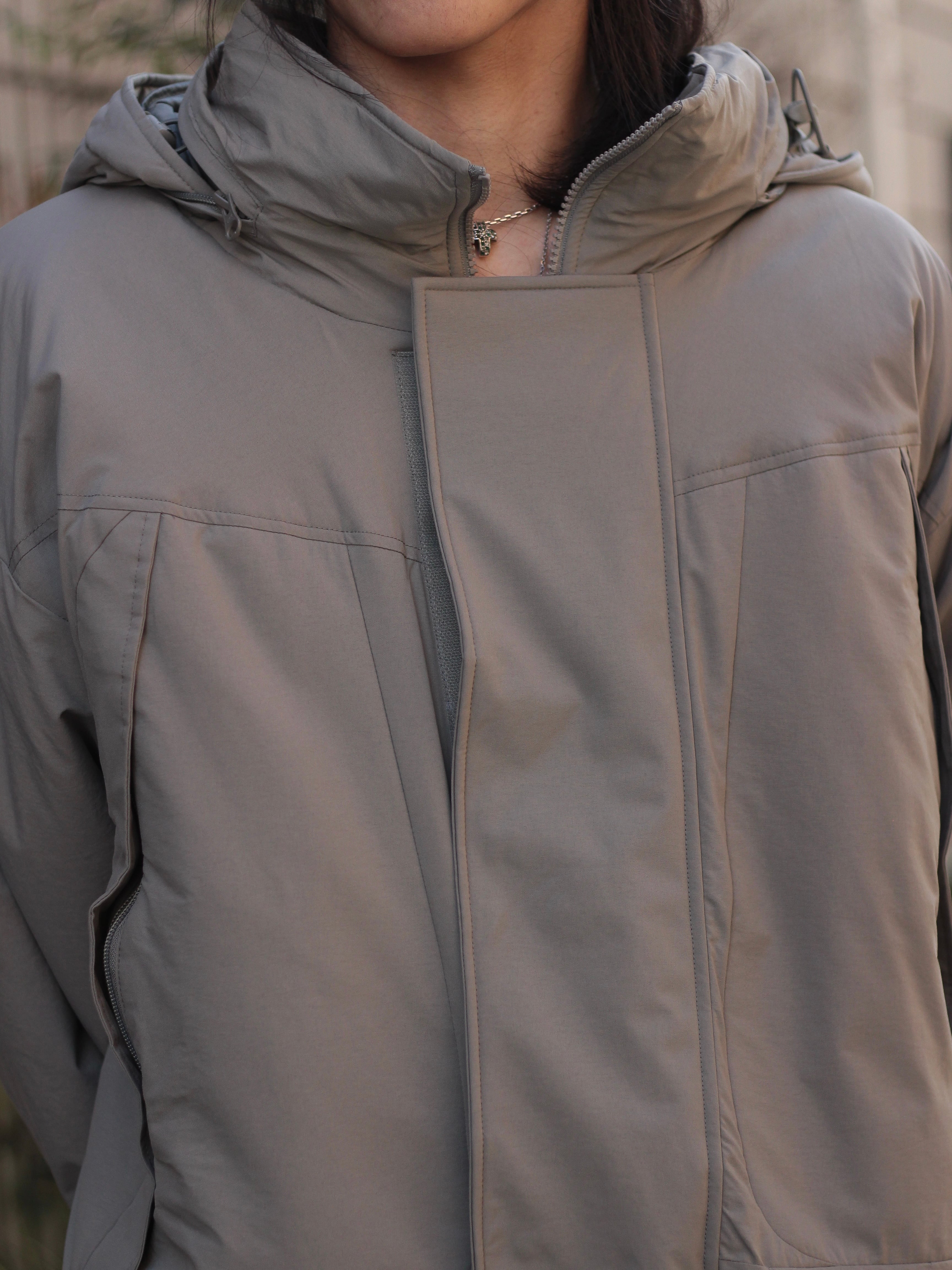無駄なデザインの無いシンプルな見た目に丸みを帯びたボリュームのあるシルエット、フードは被っても違和感のない大きなサイズで、フードを収納して頂ければ2wayで楽しめます。